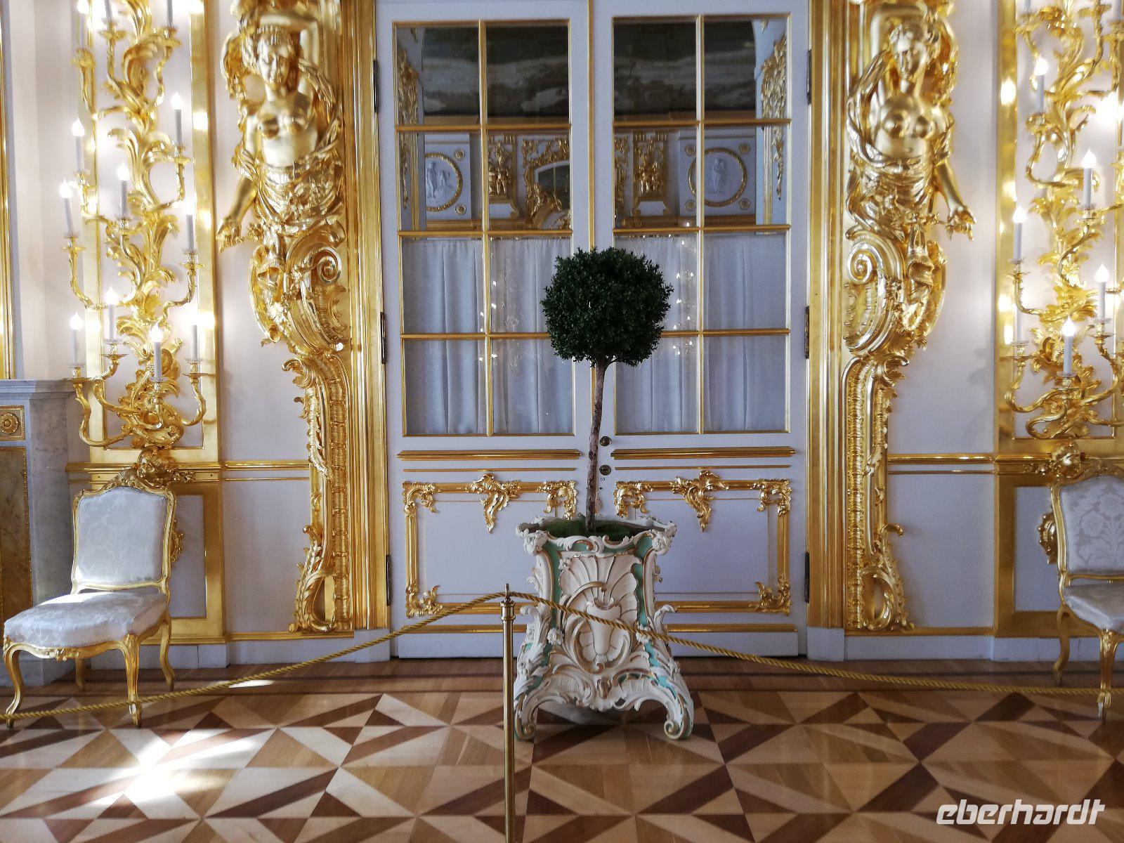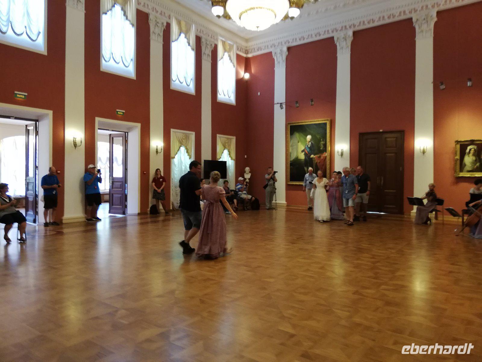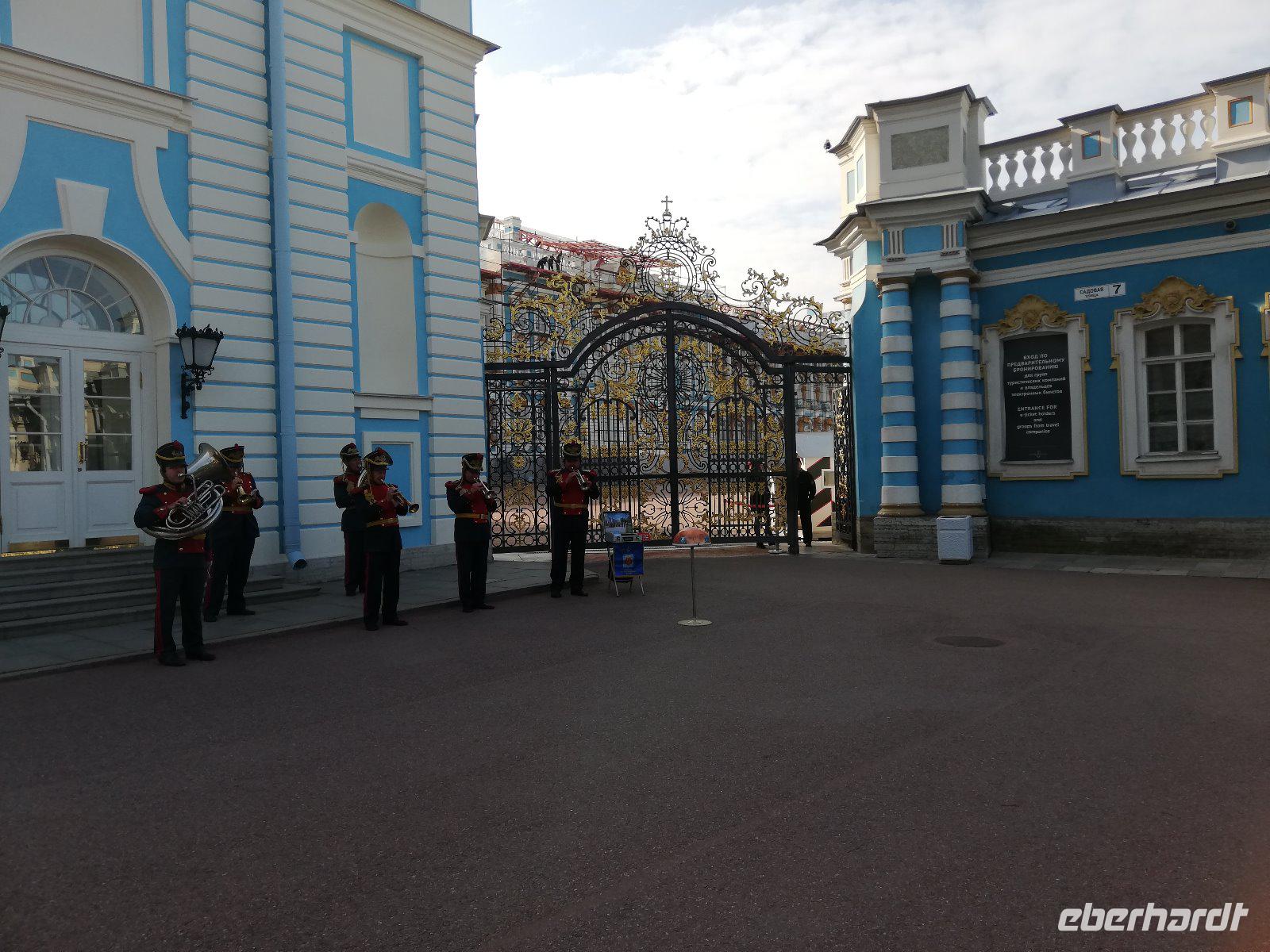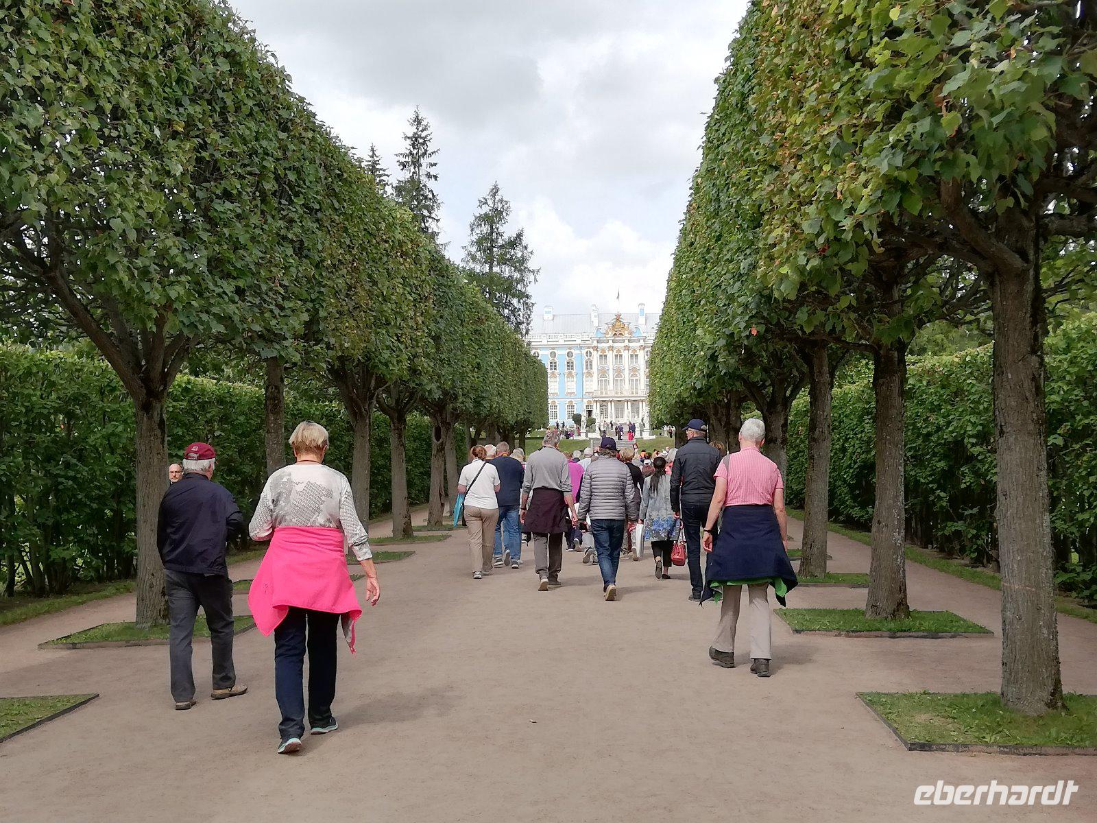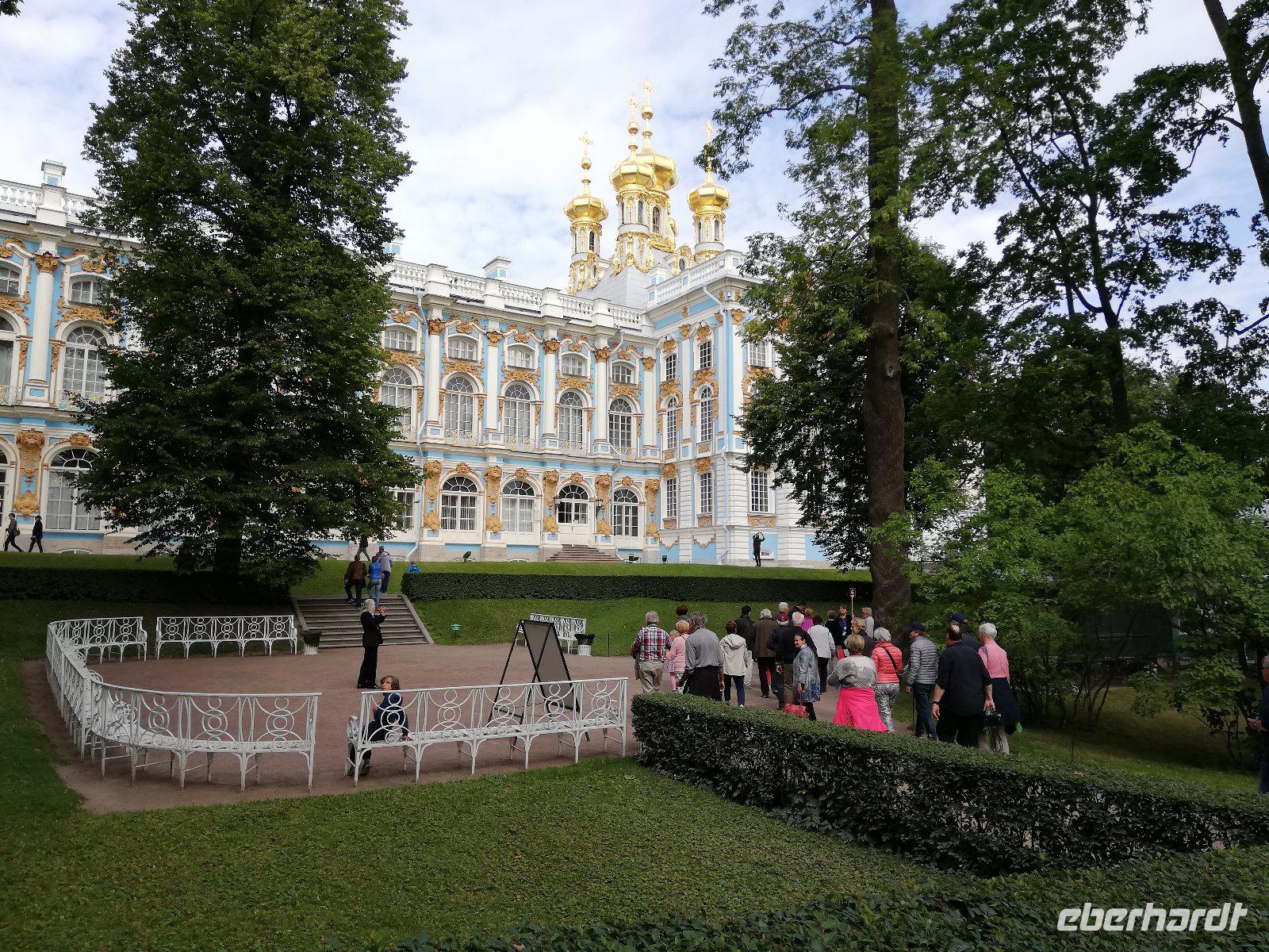 Nach 08.00 Uhr beginnt unsere Fahrt mit Anna. Wir sind schon vor dem großen Touristen-Ansturm vor Ort und genießen die musikalische Begrüßung auf dem Weg zum Palast. Die einstige russische Zarenresidenz war nach schwersten Zerstörungen im Zweiten Weltkrieg originalgetreu wieder aufgebaut wurde. Eine besondere Attraktion ist die Rekonstruktion des Bernsteinzimmers das 2003 der Öffentlichkeit übergeben wurde. Im Anschluss führt uns Anna durch den Park mit seiner Eremitage, dem Lustgarten,der Grotte und dem Lyzeum(Eliteschule). Ein schöner Abschluss des Programms mit Anna. Sie bringt uns noch zum Schiff und verabschiedet sich herzlich.