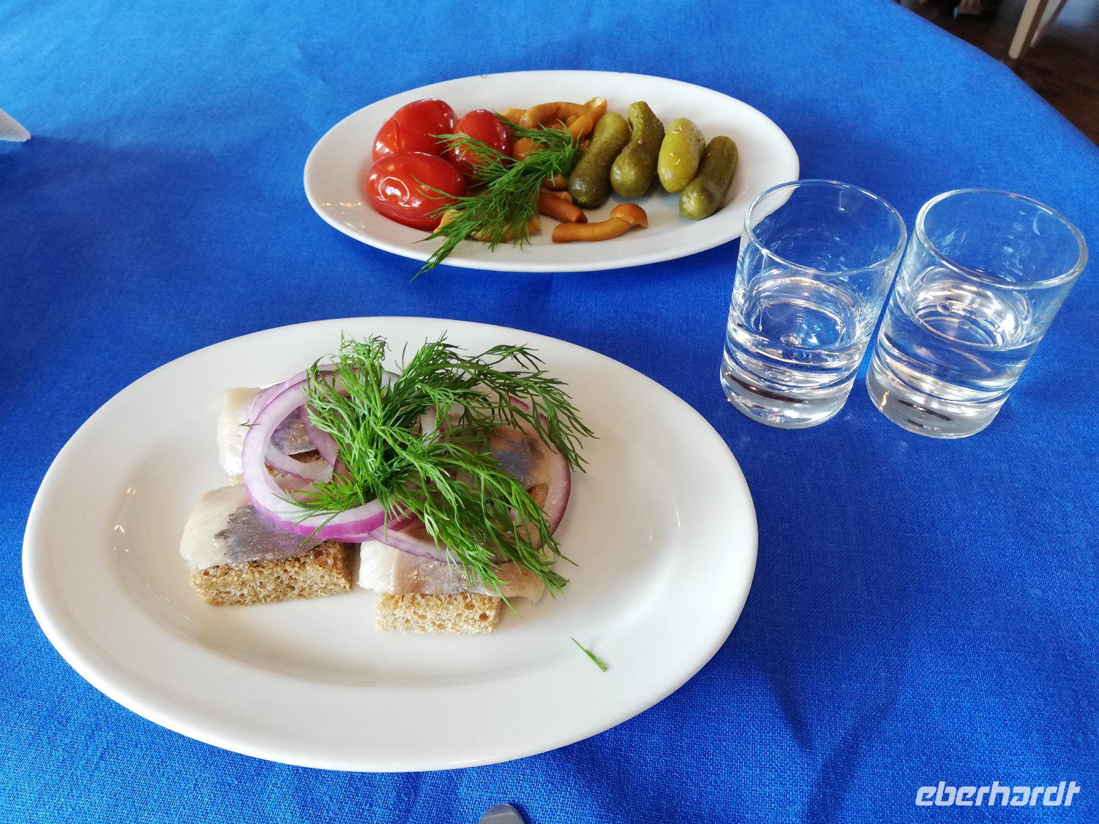 Neben den reinen oder puren Wodka werden inzwischen auch aromatisierte Wodkas hergestellt, indem das Destillat oder der pure Wodka mit Früchten, Gewürzen, Extrakten oder Essenzen angesetzt wird. Wie sollen wir nun den Wodka trinken ? Die Erklärung folgt. Beim Trinken hält man die Luft an und trinkt das Glas auf einen Zug aus, anschließend atmet man tief aus und isst etwas. Die Ausnahme bilden die Frauen, die dürfen den Wodka Schluck für Schluck trinken. Eine sehr unterhaltsame Stunde in der sich Wodka-Verweigerer doch zum Probieren durchringen konnten.
