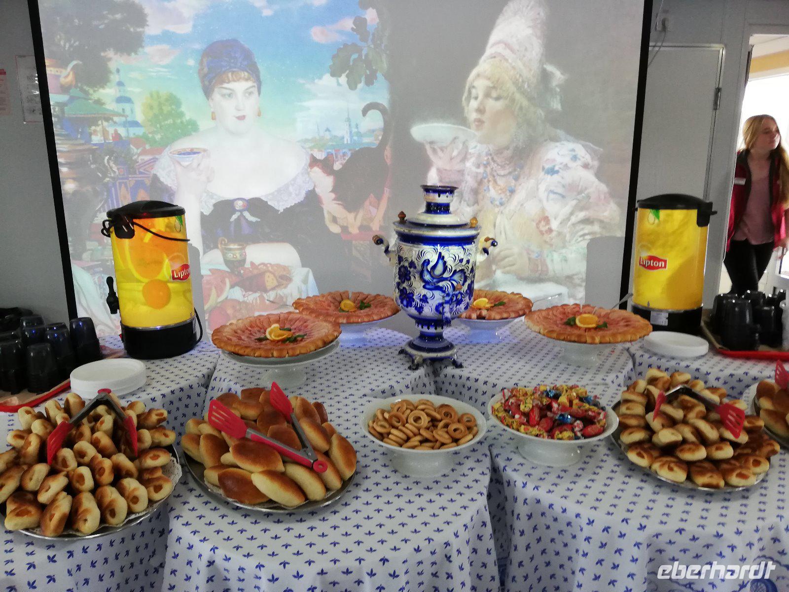 Entspannt beginnt der Morgen mit Morgengymnastik oder einfach etwas länger im Bett bleiben. Gegen 10.00 Uhr sind wir zum Russischen Teetrinken eingeladen. Der Samowar, der in der Mitte der langen Tafel stand konnte leider nicht vorgeführt werden, aus Sicherheitsgründen darf er auf den Schiff nicht genutzt werden. Die Veranstaltung war aber trotzdem ein Erfolg, denn nicht nur der Tee, sondern auch das dazu gereichte Gebäck waren lecker.