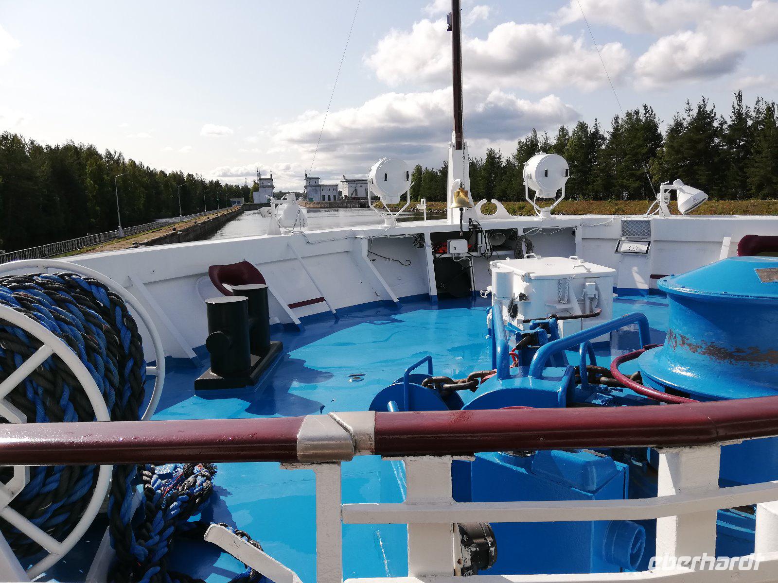 Heute gehören zu dem Komplex zwölf Kirchen, eine Kapelle, die Kremlmauer mit zehn Türmen, eine Küche, das Refektorium, Priester- und Mönchsgebäude, zwei Krankenhäuser, ein Kesselhaus und eine Windmühle. Beeindruckend ist der Komplex und auch die Führung von Ludmilla. Anschließend fahren wir noch durch den Ort und Ludmilia gibt auch Auskunft zur sozialen Situation in dieser Region. Am Nachmittag verlässt unser Schiff Goritzy und nimmt Kurs auf Kishie. Entlang dem Wolga-Ostsee-Kanal durch den Weißen See zum Onegasee.