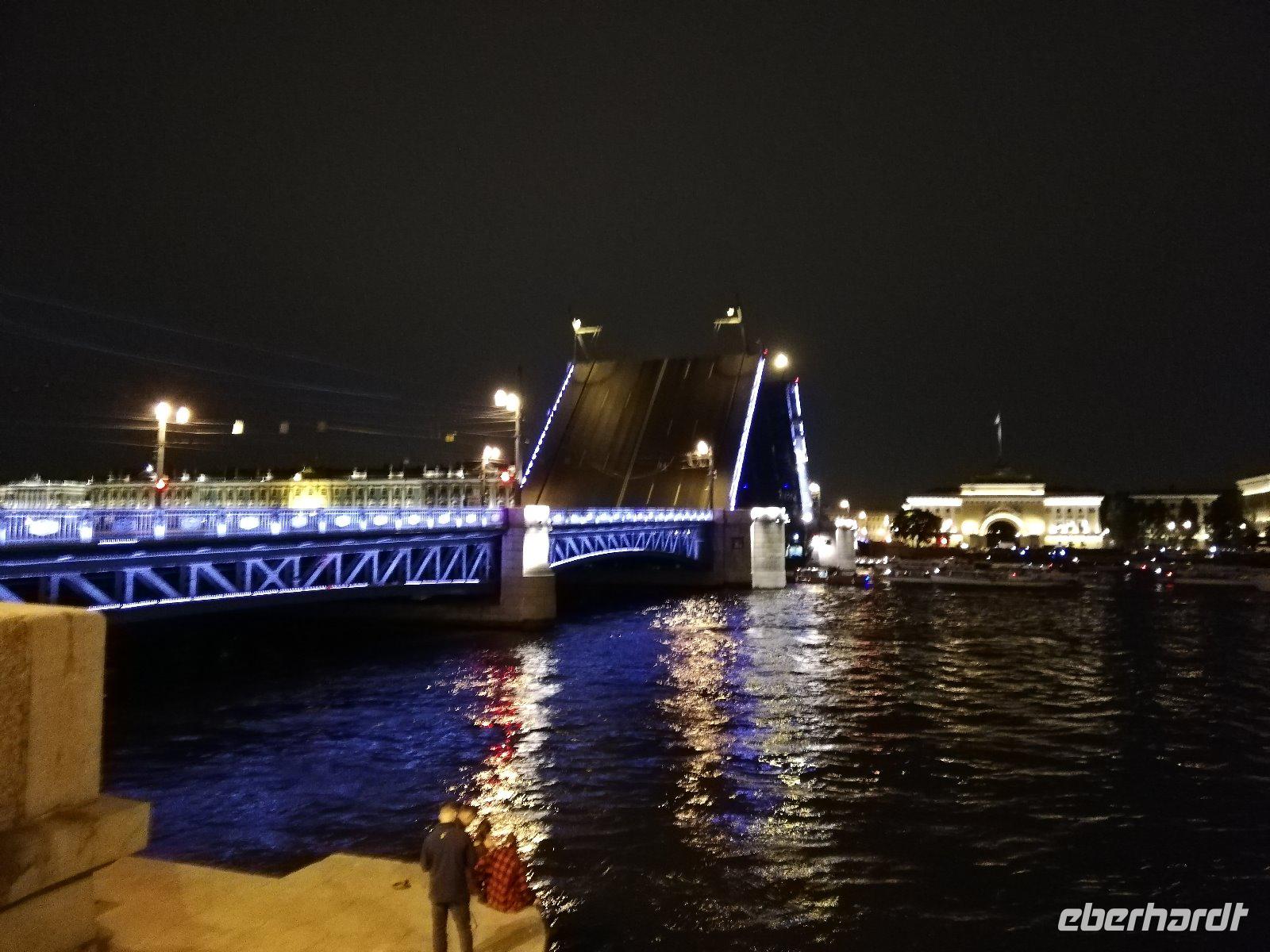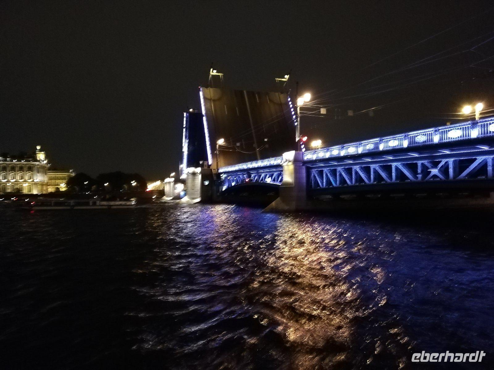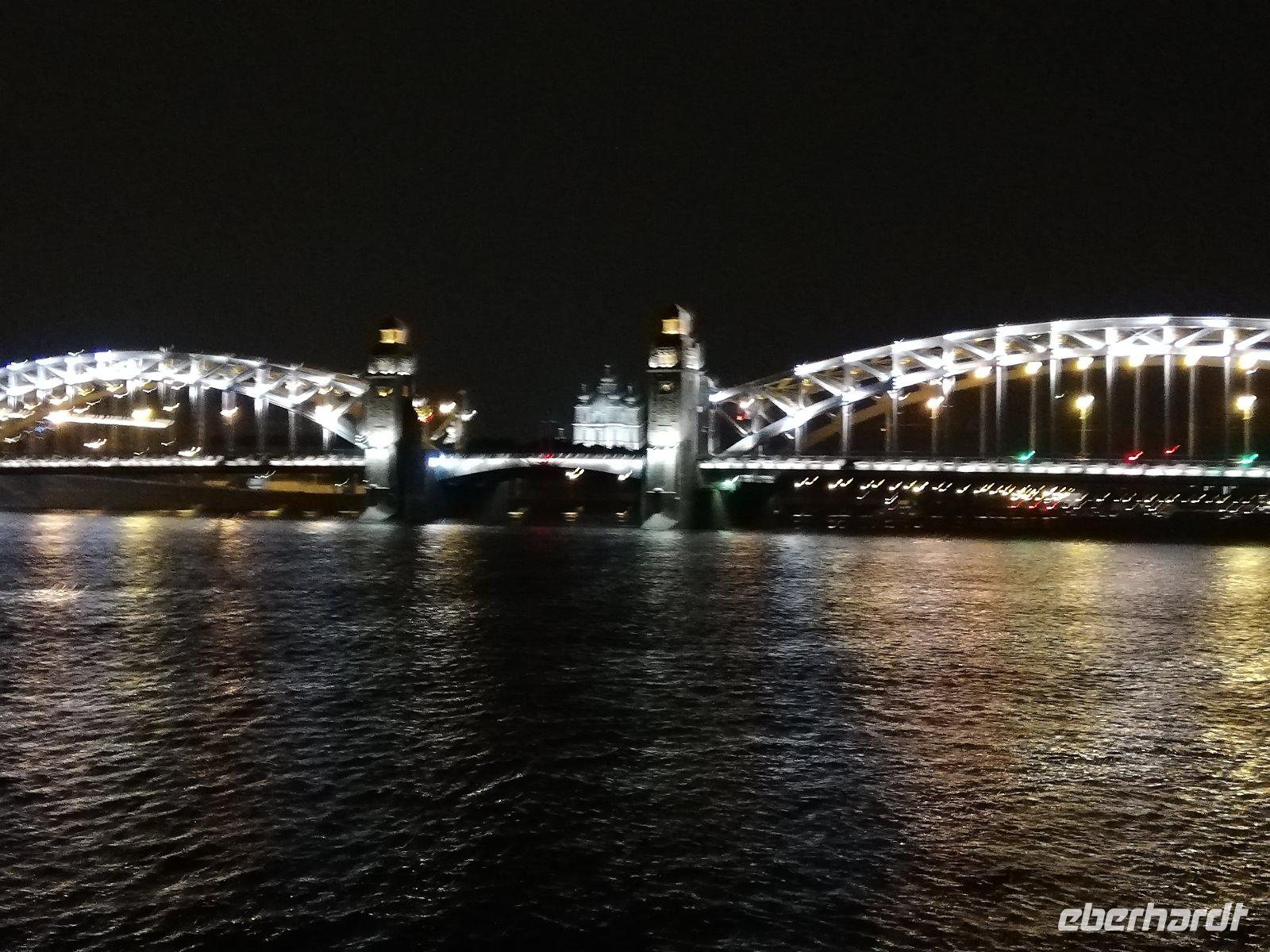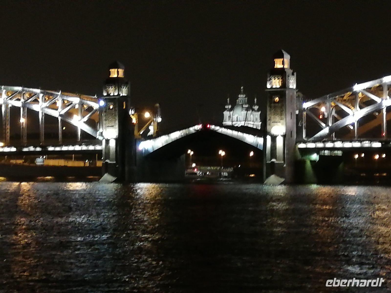 zu sehen. Gegen 23.30 Uhr steht für uns der Bus mit einem Stadtführer bereit. Wir fahren durch die Stadt und spüren den Zauber, den diese Stadt bei Nacht bewirkt. An vielen Orten halten wir und können fotografieren. Das besondere Erlebnis sind die Neva-Brücken die nach Mitternacht hochgezogen werden, um den Schiffsverkehr durch die Stadt zu ermöglichen. Wir stehen an der Schlossbrücke als diese bei klassischer Musik nach oben gezogen wird und so nach und nach weitere Brücken geöffnet werden. Wir stehen am Panzerkreuzer Aurora um weitere Brücken beobachten zu können. Ein Erlebnis, welches man nicht verpassen sollte. Gegen 2.15Uhr sind wir wieder am Schiff. Viel Zeit um zu schlafen bleibt nicht.