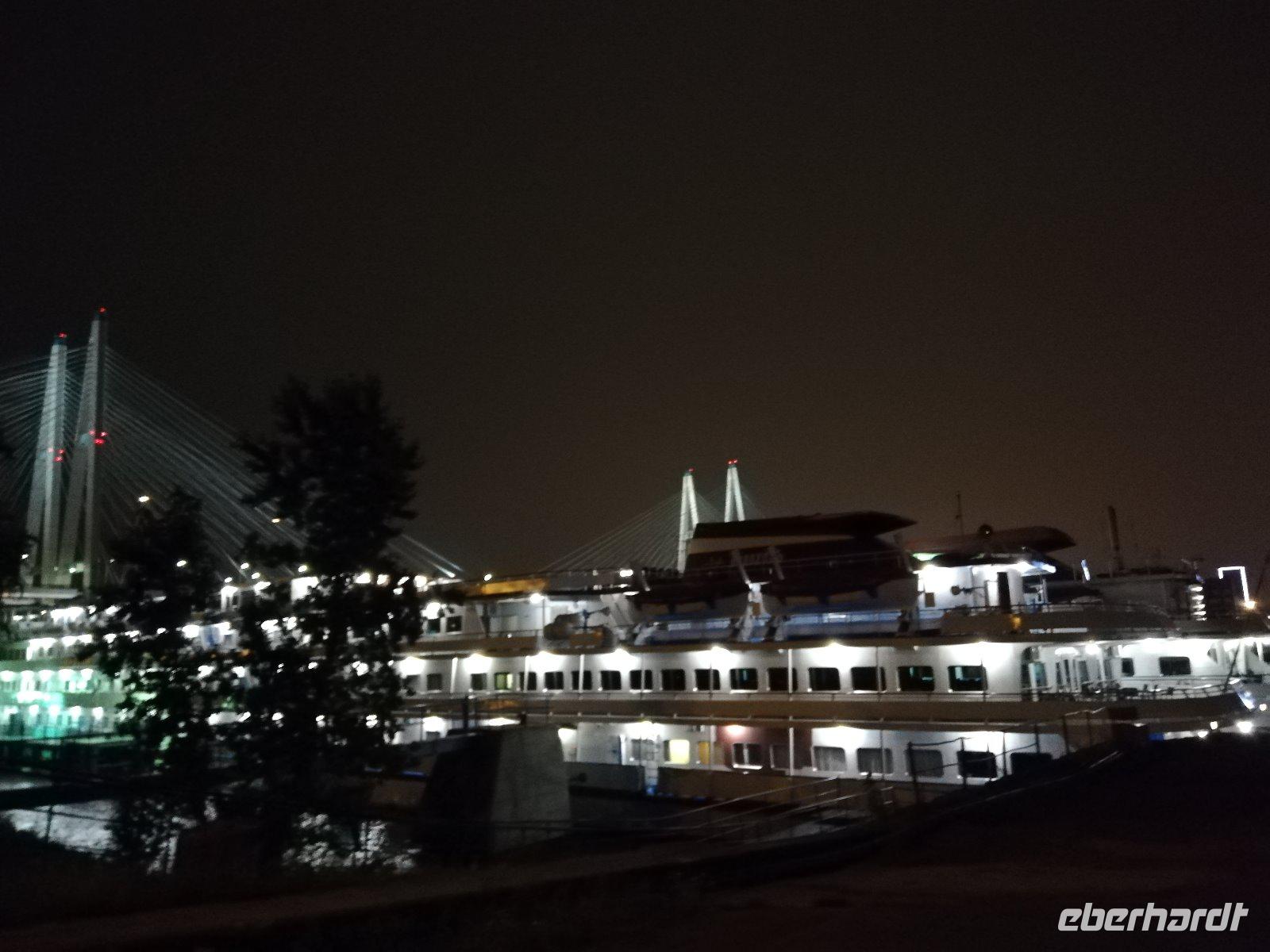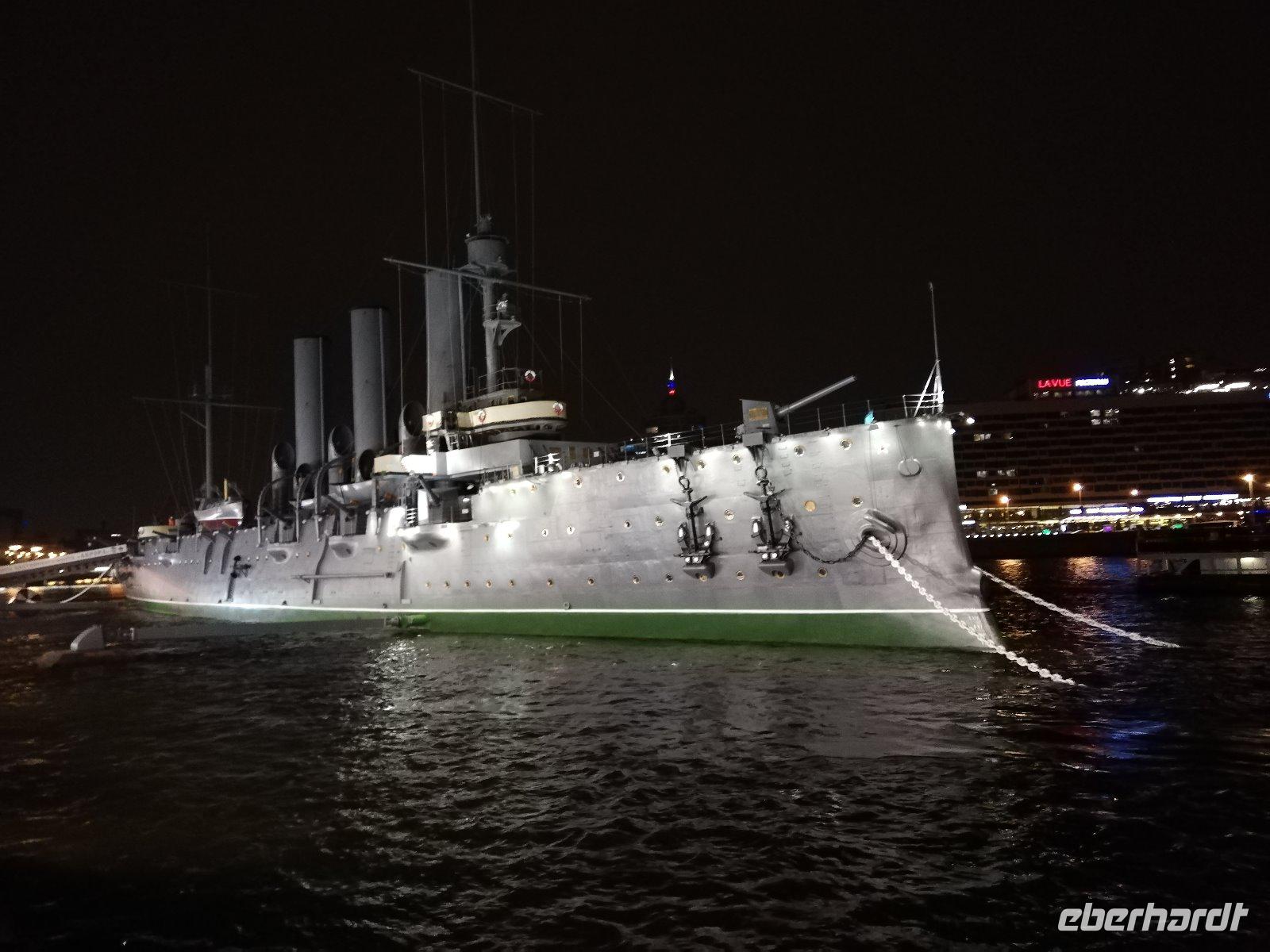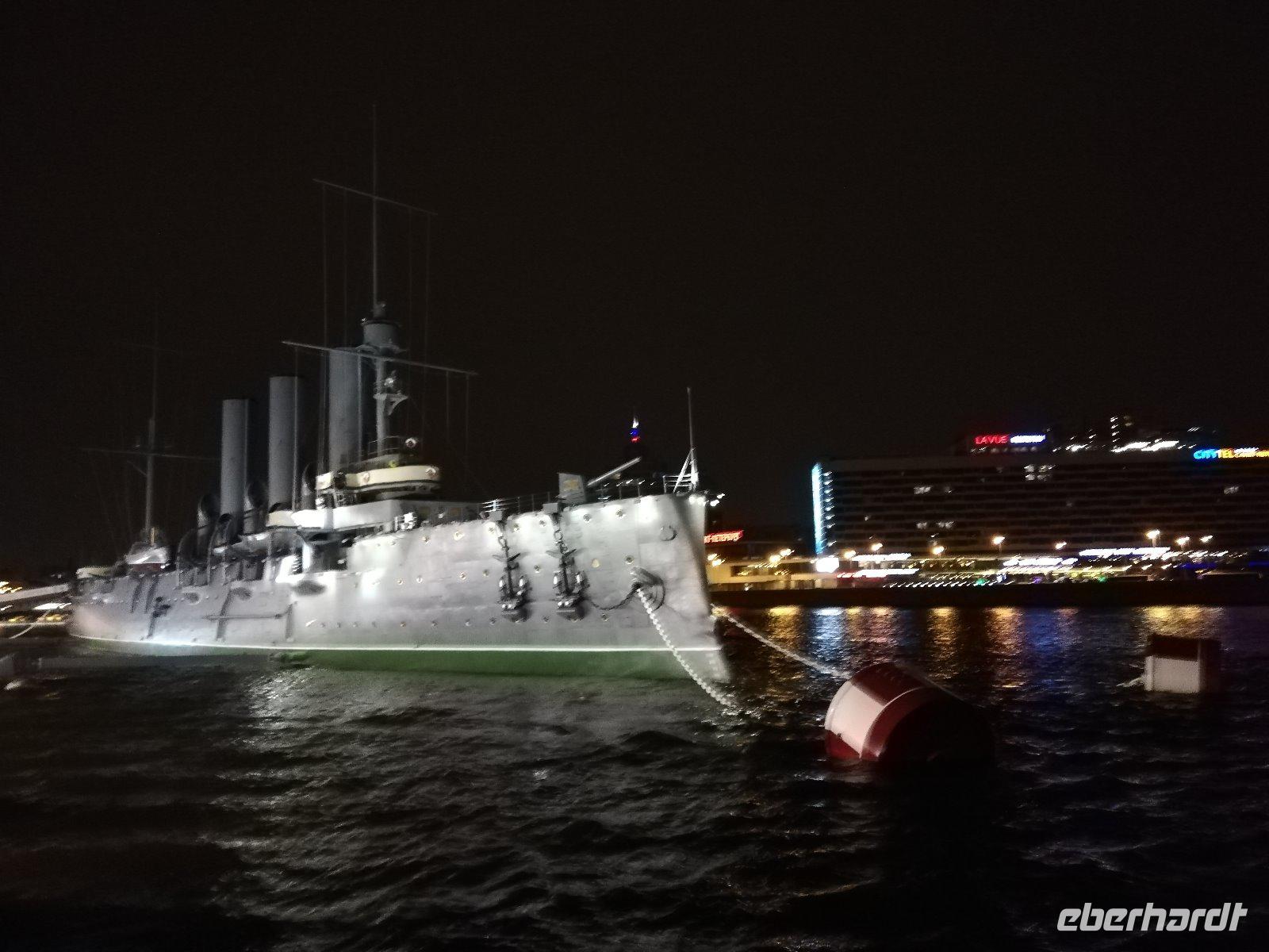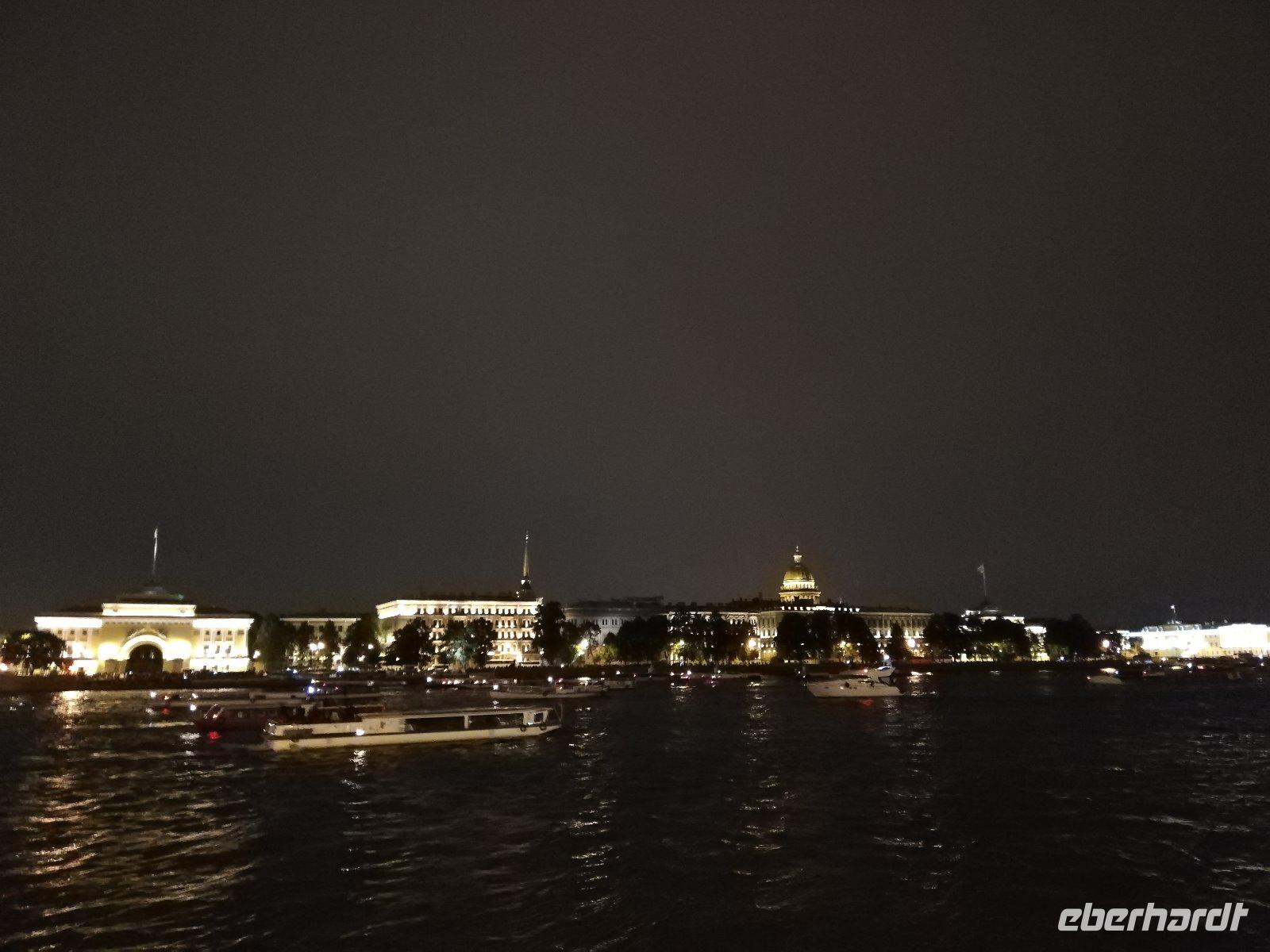 zu sehen. Gegen 23.30 Uhr steht für uns der Bus mit einem Stadtführer bereit. Wir fahren durch die Stadt und spüren den Zauber, den diese Stadt bei Nacht bewirkt. An vielen Orten halten wir und können fotografieren. Das besondere Erlebnis sind die Neva-Brücken die nach Mitternacht hochgezogen werden, um den Schiffsverkehr durch die Stadt zu ermöglichen. Wir stehen an der Schlossbrücke als diese bei klassischer Musik nach oben gezogen wird und so nach und nach weitere Brücken geöffnet werden. Wir stehen am Panzerkreuzer Aurora um weitere Brücken beobachten zu können. Ein Erlebnis, welches man nicht verpassen sollte. Gegen 2.15Uhr sind wir wieder am Schiff. Viel Zeit um zu schlafen bleibt nicht.