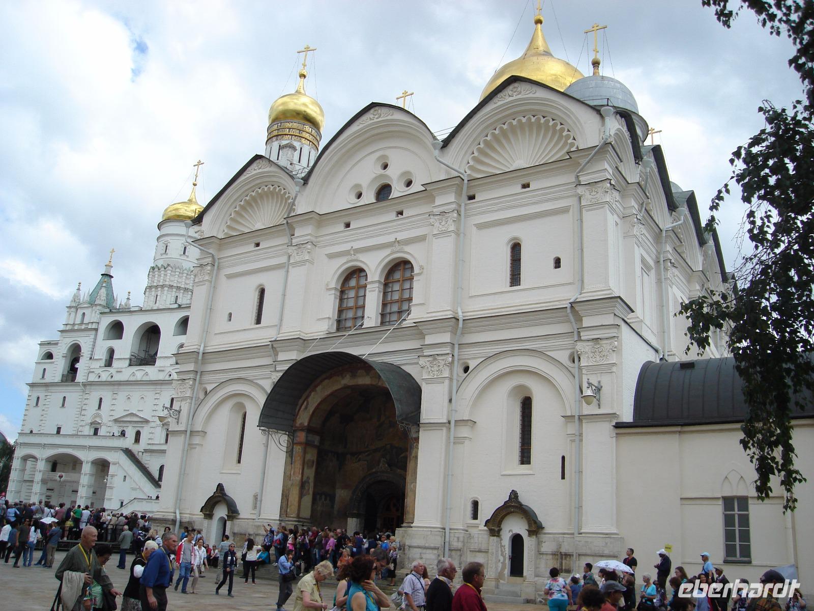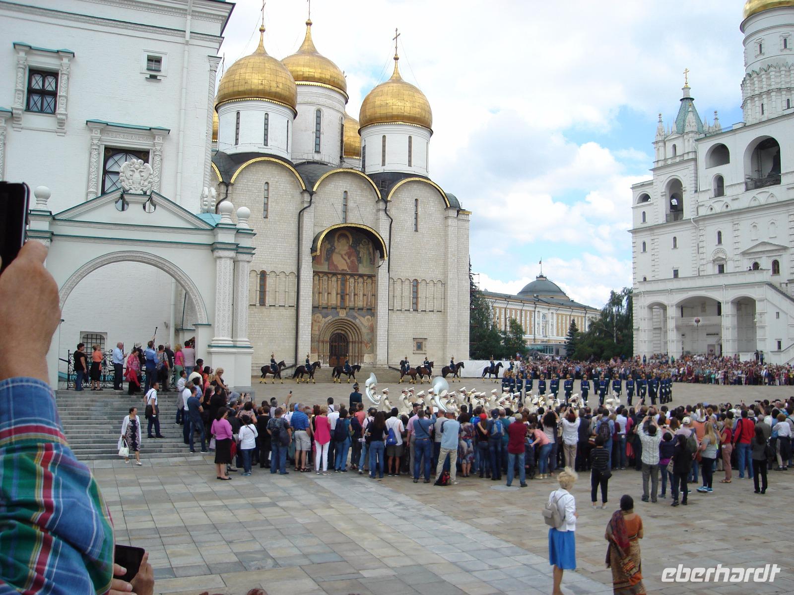Auf dem Platz im Inneren des Kreml kamen wir dann gerade richtig zur wöchentlich stattfindenden Militärparade. Dann standen die Kathedralen des Kreml auf dem Programm, auch eine Führung durch das Kreml-Gelände. Wir gingen durch den berühmten Spasskij-Turm, dessen Uhr gerade schlug, hinaus auf den Roten Platz, bewunderten die Basilus-Kathedrale, das GUM, überhaupt die gesamte riesige Anlage des Roten Platzes. Elena erklärte uns alles, ging mit ins GUM, und nach Erklärungen dort gab es Freizeit für eine Mittagspause, die ein Teil der Gäste als Fotopause nutze und sich ein Moskauer Eis schmecken ließ.