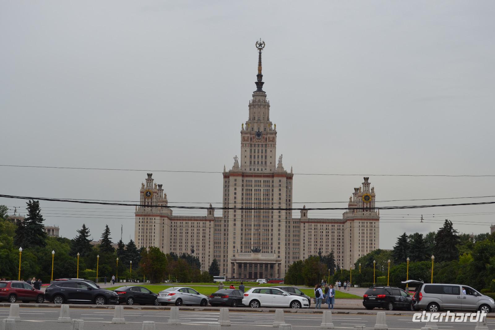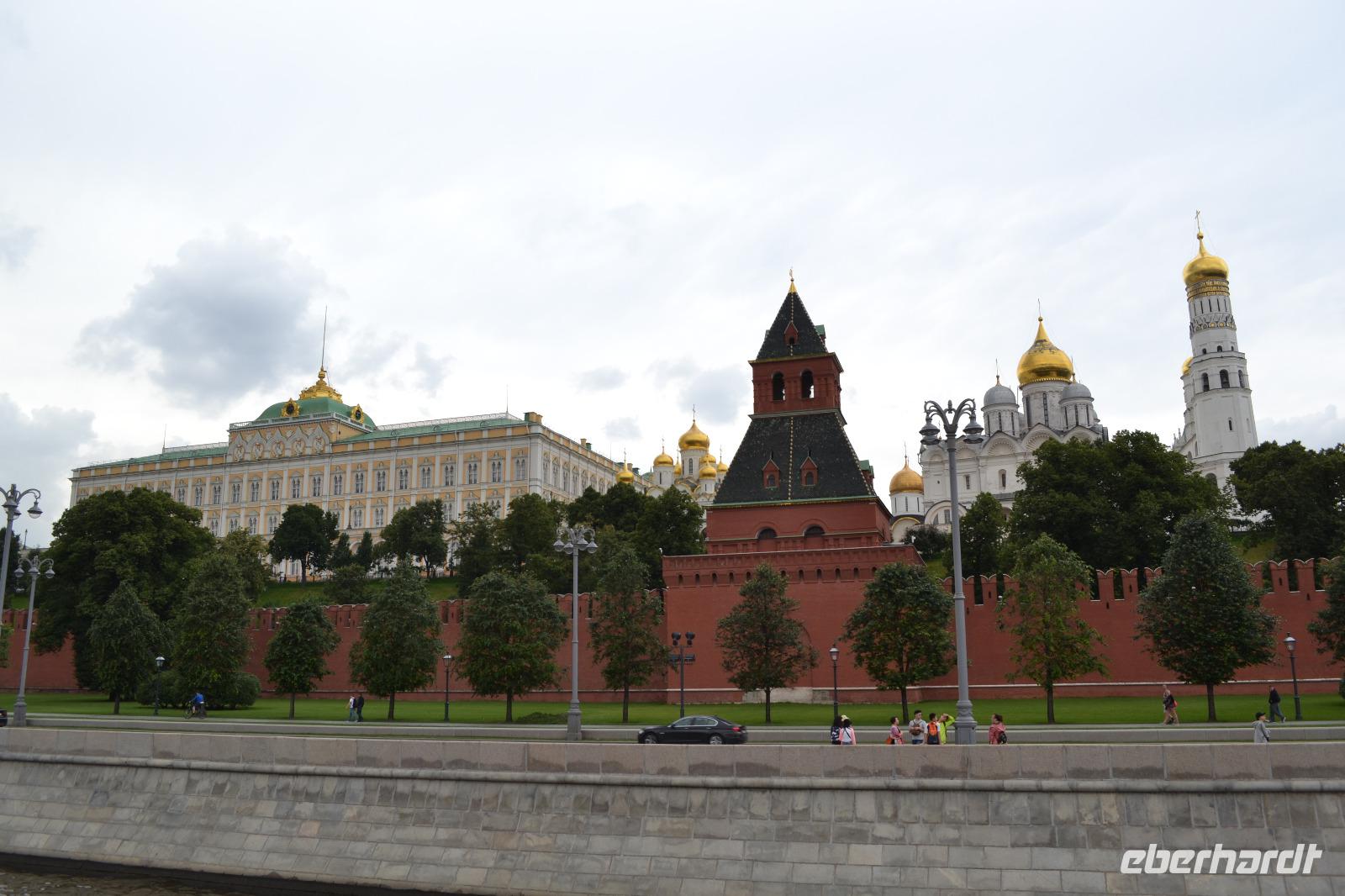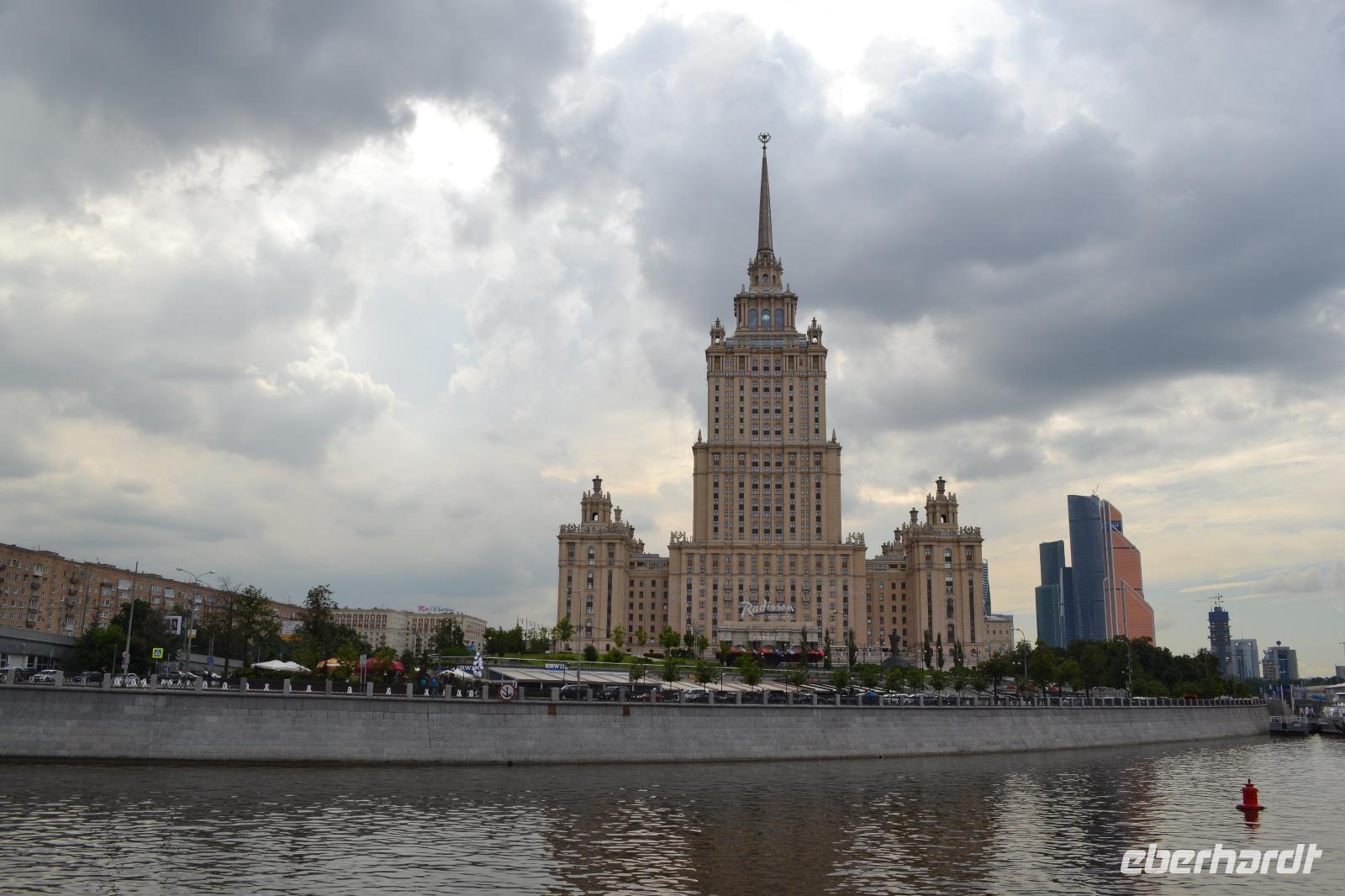Unsere örtliche Reiseleiterin Tatiana holt uns nach dem Frühstück im Hotel ab. Sie will heute als erstes mit uns mit der Metro zum Roten Platz fahren. Die Stationen der Metro gelten ja für sich genommen schon als ein sehenswertes Highlight. Mit der Rolltreppe geht es ganz lange und ganz tief hinab. Dann fühlen wir uns unten fast wie in reich verzierten Tempeln. Je nach Station huldigt die Dekoration mal Glanz und Glorie militärischer Siege aus der Zarenzeit, ein anderes Mal werden sozialistische Arbeiter und Bauern geehrt. Wieder oben gehen wir am berühmten Kaufhaus "GUM" vorbei und stehen dann auf einmal tatsächlich auf dem Roten Platz. Das ist schon ein ganz besonderer Moment, denn wir kennen ihn ja alle nur aus dem Fernsehen. Die Kreml-Mauer mit ihren Türmen, das Lenin-Mausoleum, die Basilius-Kathedrale - alles ist da und wir sind mittendrin im Getümmel. Nur ein Flugzeug könnte heute hier nicht landen, denn auf dem Platz wird gerade alles für die "Große russische Nacht des Boxens" vorbereitet. Wir wollen uns zwar nicht, doch müssen uns irgendwann sattsehen, denn hinter der Basilius-Kathedrale wartet schon unser Bus. Unsere kleine Stadtrundfahrt führt uns zunächst zum Neujungfrauen-Kloster und dann zum Aussichtspunkt auf den Sperlingsbergen, direkt gegenüber der ehrwürdigen Lomonossow-Universität. Von hier aus haben wir einen guten Blick über die Stadt, sehen das neue, moderne Finanzviertel und die alten Stadien. Ein bisschen Hunger verspüren wir jetzt schon. Gut, dass auf dem Schiff schon ein typisch russisches Mittagessen auf uns wartet, das wir genüßlich verspeisen, während das Ausflugsschiff unter vielen Brücken hindurch an Palästen, Ministerien, am Gorki-Park und am Kreml vorbeigleitet. Der Nachmittag steht meinen Gästen zur freien Verfügung. Mit gut der Hälfte meiner lieben Reisegruppe bin ich dann aber am Abend noch verabredet, denn wir wollen mit der Metro noch einmal in die Stadt fahren und den Roten Platz und das Kaufhaus "GUM" im Glanz der vielen Lichter erkunden.