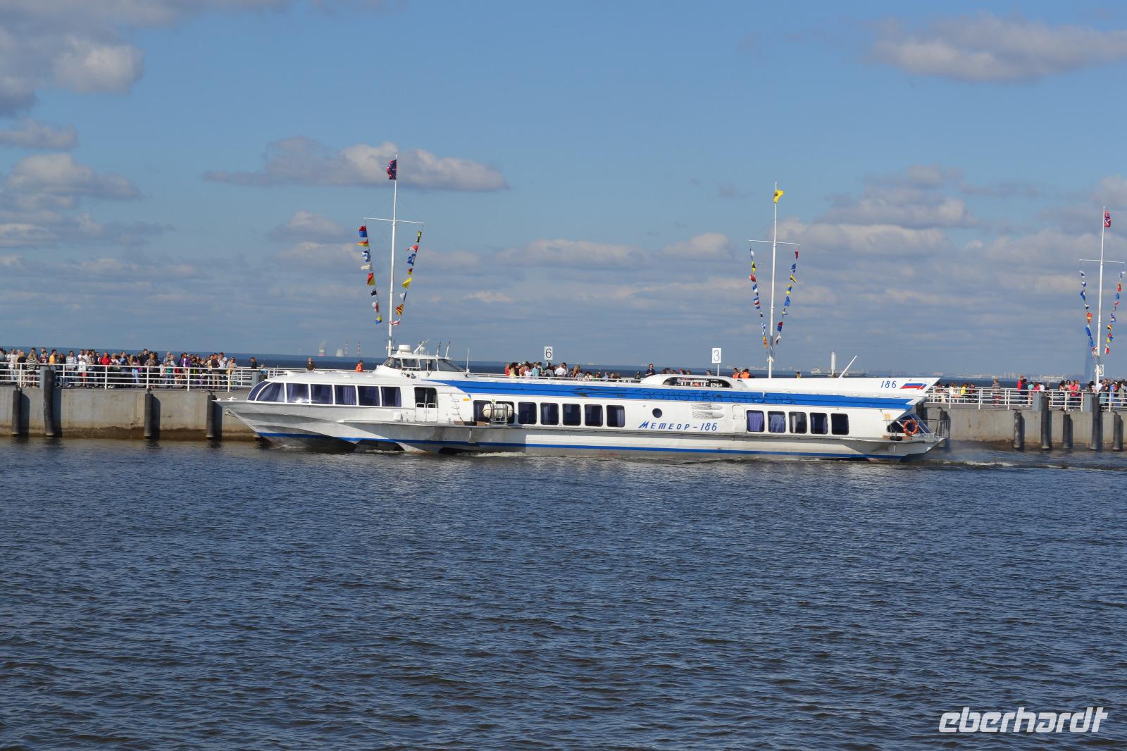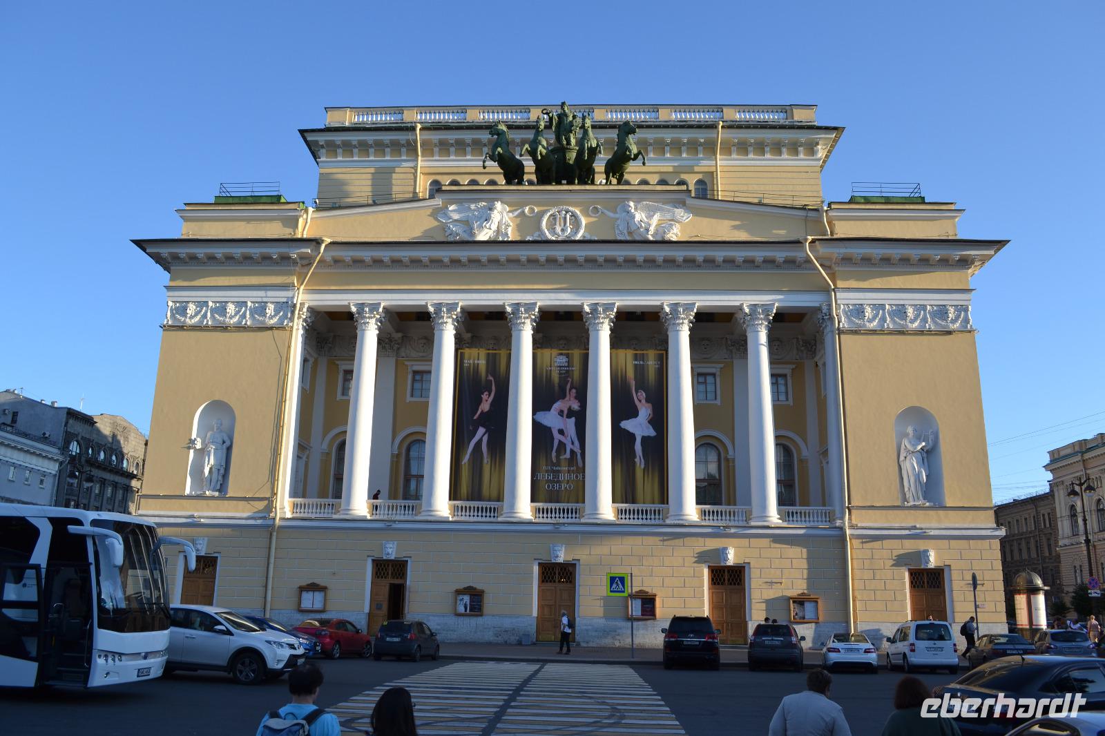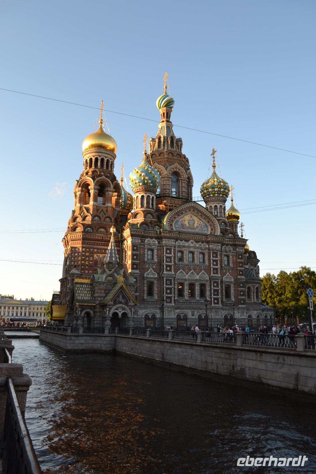 Heute können wir ausschlafen, denn das Programm beginnt erst um 12:00 Uhr. Oder die Stadt vormittags auf eigene Faust erkunden. Oder doch lieber ausschlafen? Um uns für den Besuch in Peterhof zu stärken, machen wir gleich erstmal eine Mittagspause im Restaurant "Sadko" und genießen typisch russisches Essen. Dann fährt uns Roman über die moderne Schnellstraße in das kleine Örtchen Peterhof vor den Toren der Zarenmetropole. Im zweiten Weltkrieg stark in Mitleidenschaft gezogen, erstrahlt das Schloss heute wieder wie zu seinen besten Zeiten und lockt jedes Jahr Millionen von Besuchern an. Das liegt vor allem an den Wasserspielen, die schon seit fast 300 Jahren alle Besucher in Erstaunen versetzen. Am eindrucksvollsten ist natürlich die große Kaskade mit dem Samson-Brunnen. Schwer vorstellbar, dass alles tatsächlich ohne Pumpen funktioniert und nur der Wasserdruck in den Leitungen für dieses wunderschöne Schauspiel sorgt. Exakte Berechnungen der Durchmesser der Leitungen waren erforderlich, damit die einzelnen Fontänen die notwendige Höhe erreichen und sich die geplanten Figuren ergeben. Nach der Besichtigung des Schlosses gehen wir entlang des großen Kanals in Richtung Ostsee zur Anlegestelle der Tragflächenboote. Eines dieser "Raketa" genannten Schiffe bringt uns in Rekordzeit in die Innenstadt zurück - die Fahrt endet direkt am Winterpalast. Roman hat es in der Zwischenzeit auch wieder mit dem Bus zurück geschafft und nimmt uns in Empfang. Leider verzögert das durch den Heiligen verursachte Verkehrschaos in Kombination mit dem normalen Feierabendverkehr unsere Ankunft am Hotel, so dass ich meine Gäste, die am Abend noch einen Besuch des Balletts "Schwanensee" im Alexandrinski-Theater gebucht haben, nach dem Abendessen kurzerhand per Metro zum Theater bringe. Während die Vorstellung läuft, vertreibe ich mir mit einem Spaziergang zur Blutskirche die Zeit. Und als ich dann vor dem Theater auf das Ende der Vorstellung warte, steht plötzlich einer der Schwäne - klein und zierlich - leibhaftig vor mir! Sie kommt aus Serbien und wartet auf ihre Eltern, die es sich nicht nehmen ließen, ihre Tochter zu besuchen und auf der großen Bühne zu bewundern. Leider habe ich in der Aufregung ganz vergessen, mir ein Autogramm geben zu lassen...