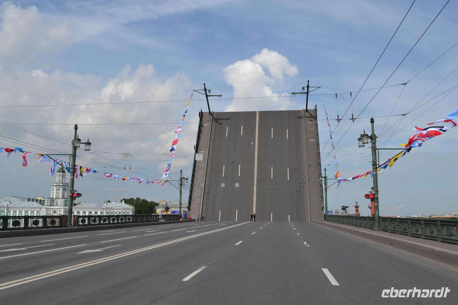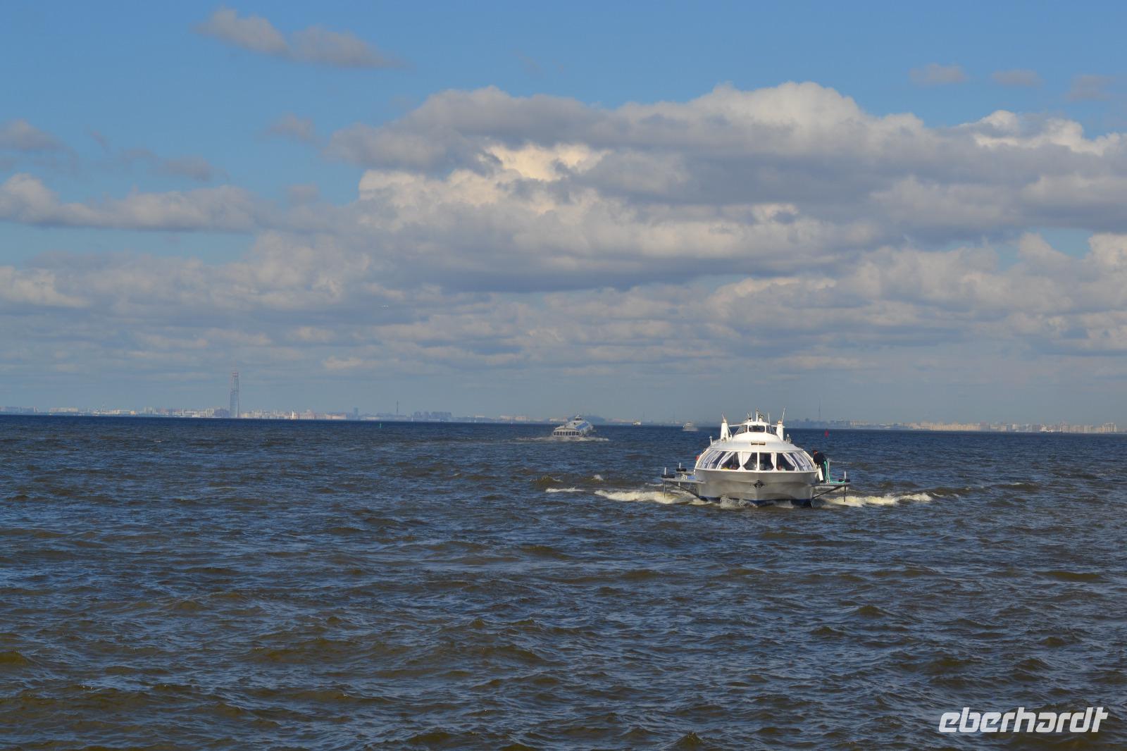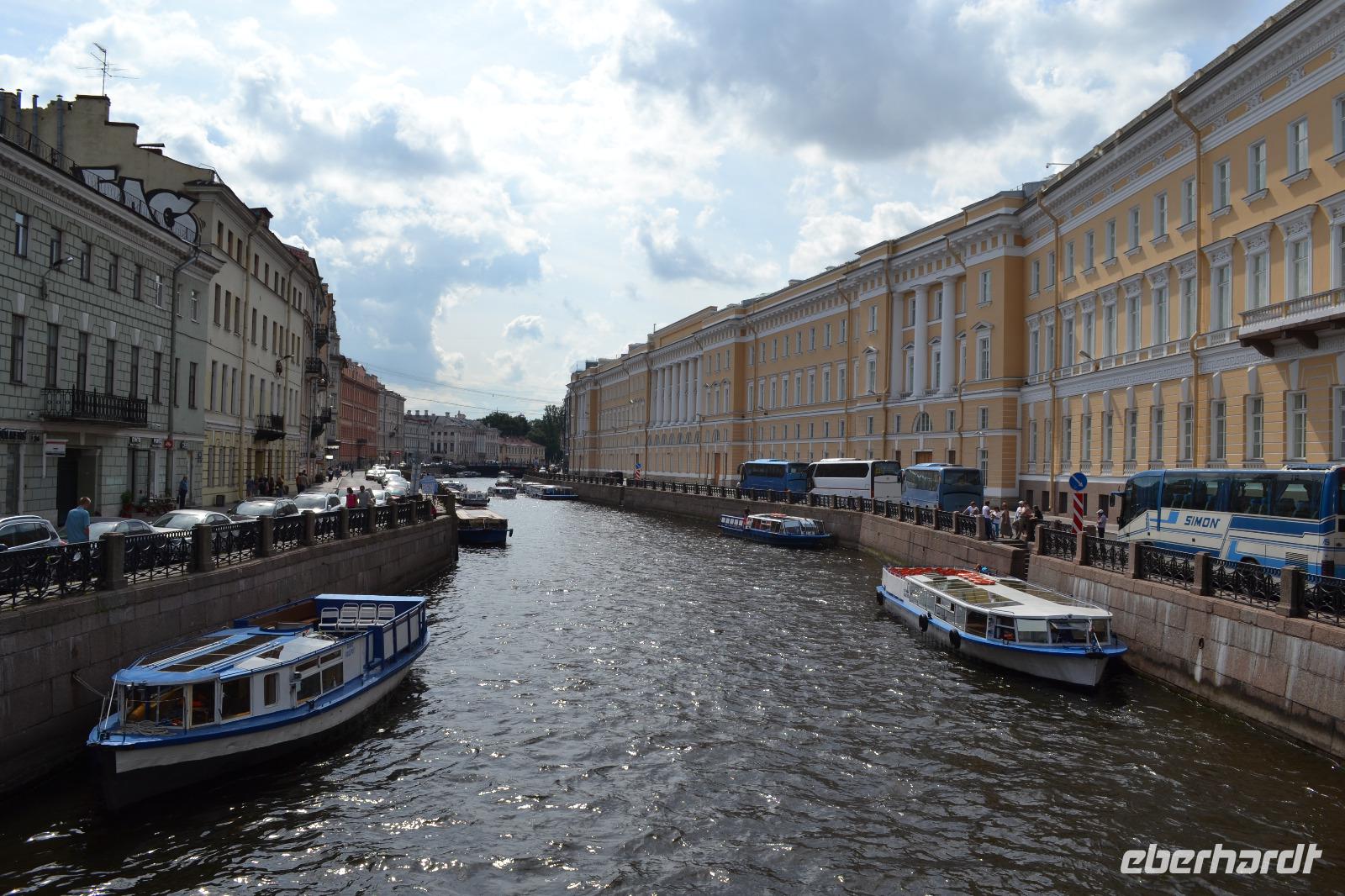 Heute können wir ausschlafen, denn das Programm beginnt erst um 12:00 Uhr. Oder die Stadt vormittags auf eigene Faust erkunden. Oder doch lieber ausschlafen? Um uns für den Besuch in Peterhof zu stärken, machen wir gleich erstmal eine Mittagspause im Restaurant "Sadko" und genießen typisch russisches Essen. Dann fährt uns Roman über die moderne Schnellstraße in das kleine Örtchen Peterhof vor den Toren der Zarenmetropole. Im zweiten Weltkrieg stark in Mitleidenschaft gezogen, erstrahlt das Schloss heute wieder wie zu seinen besten Zeiten und lockt jedes Jahr Millionen von Besuchern an. Das liegt vor allem an den Wasserspielen, die schon seit fast 300 Jahren alle Besucher in Erstaunen versetzen. Am eindrucksvollsten ist natürlich die große Kaskade mit dem Samson-Brunnen. Schwer vorstellbar, dass alles tatsächlich ohne Pumpen funktioniert und nur der Wasserdruck in den Leitungen für dieses wunderschöne Schauspiel sorgt. Exakte Berechnungen der Durchmesser der Leitungen waren erforderlich, damit die einzelnen Fontänen die notwendige Höhe erreichen und sich die geplanten Figuren ergeben. Nach der Besichtigung des Schlosses gehen wir entlang des großen Kanals in Richtung Ostsee zur Anlegestelle der Tragflächenboote. Eines dieser "Raketa" genannten Schiffe bringt uns in Rekordzeit in die Innenstadt zurück - die Fahrt endet direkt am Winterpalast. Roman hat es in der Zwischenzeit auch wieder mit dem Bus zurück geschafft und nimmt uns in Empfang. Leider verzögert das durch den Heiligen verursachte Verkehrschaos in Kombination mit dem normalen Feierabendverkehr unsere Ankunft am Hotel, so dass ich meine Gäste, die am Abend noch einen Besuch des Balletts "Schwanensee" im Alexandrinski-Theater gebucht haben, nach dem Abendessen kurzerhand per Metro zum Theater bringe. Während die Vorstellung läuft, vertreibe ich mir mit einem Spaziergang zur Blutskirche die Zeit. Und als ich dann vor dem Theater auf das Ende der Vorstellung warte, steht plötzlich einer der Schwäne - klein und zierlich - leibhaftig vor mir! Sie kommt aus Serbien und wartet auf ihre Eltern, die es sich nicht nehmen ließen, ihre Tochter zu besuchen und auf der großen Bühne zu bewundern. Leider habe ich in der Aufregung ganz vergessen, mir ein Autogramm geben zu lassen...
