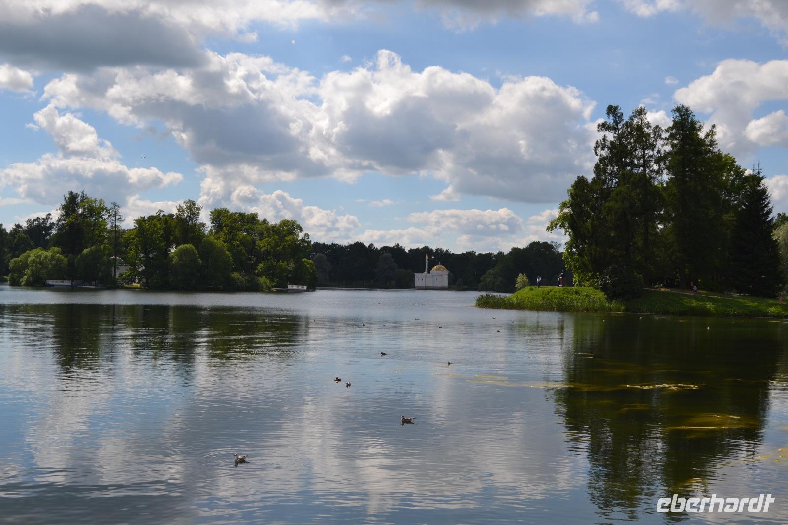Mein Eberhardt-Teddy besichtigt das Bernsteinzimmer! In Ermangelung eines Regenschirms klemmt sich Tatiana heute einfach beherzt meinen kleinen Eberhardt-Teddy unter den Arm und läuft zielstrebig los. Am Anfang guckt der kleine Bär noch etwas ängstlich drein, doch nach und nach gewöhnt er sich an seine neue Rolle als unser Erkennungszeichen auf Außenmission. Und immerhin kommt er so mal aus dem Bus raus und braucht auch keinen Eintritt zahlen! Meine Gruppe hat sich fast geschlossen für den fakultativen Ausflug nach Puschkin entschieden. Wer könnte es auch verübeln? Der Katharinen-Palast ist schließlich allein schon durch seine unglaubliche Größe sehr beeindruckend. Und mit dem Bernsteinzimmer lockt außerdem ein Kleinod mit immenser historischer Bedeutung. Tatiana führt uns durch die riesig großen Räume und Prunksäle und damit auch die vergangenen Jahrhunderte. Die Geschichte des russischen Zarenhauses mit den vielen Verwicklungen und Attentaten hat sie uns zuvor schon im Bus auf der Fahrt erläutert, so dass wir nicht ganz unvorbereitet sind. Und irgendwann stehen wir dann auch drin, im Bernsteinzimmer, für 1-2 Minuten, bevor wir der nächsten Besuchergruppe Platz machen müssen. Ich selbst würde meine Wohnung zwar nicht so dekorieren, aber der Aufwand und die Arbeit, den die Anfertigung der Bernsteintafeln gekostet haben muss, zollt uns auf jeden Fall unseren Respekt ab. Während der anschließenden Besichtigung des Parks hat Tatiana noch eine kleine Überraschung für uns parat: Im alten Badehaus lauschen wir einem Männerchor, der das bekannte Lied der Wolga-Schlepper anstimmt, und bestaunen die herausragende Akustik. Ein Mittagessen in einem traditionellen russischen Restaurant rundet den gelungen Tagesausflug schließlich ab, bevor es zurück nach St. Petersburg und ins Hotel geht.