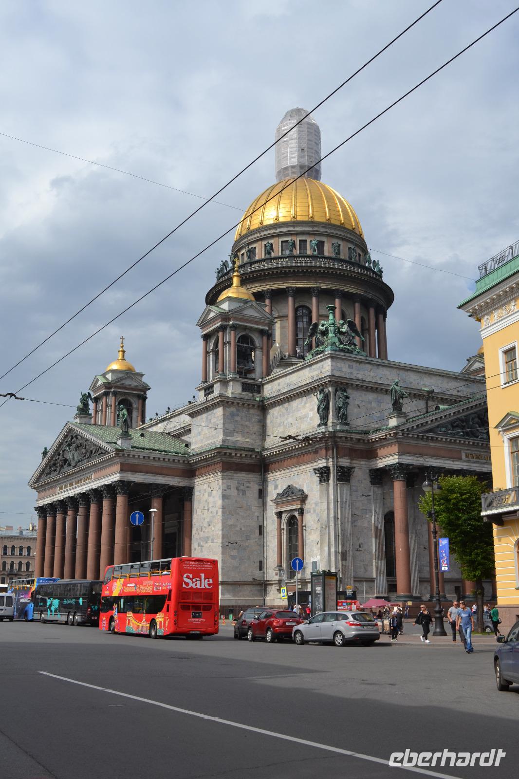 Schon früh am Morgen muss ich mich von den ersten neun Gästen verabschieden, die bereits am Vormittag mit Aeroflot die Heimreise nach Berlin bzw. Dresden antreten. Sie erhalten von mir ein "Kommen Sie gut heim!" und ein Lunchpaket mit auf den Weg. Dann heißt es für mich erstmal stärken beim Frühstück, denn ich hatte meinen Gästen noch einen fakultativen Besuch der Isaak-Kathedrale mit anschließendem Spaziergang zum Palastplatz versprochen. Sechs Gäste schließen sich mir um 10 Uhr in der Lobby des Hotels an. Per Metro fahren wir bis zur Admiralität. Die Fahrt mit der Rolltreppe in die Tiefe bzw. wieder hinauf dauert wieder einmal länger als die Fahrt mit der Metro selbst. Der sumpfige Untergrund der Stadt hat beim Bau der Metro diese Tiefe erfordert. Eine ingenieurtechnische Meisterleistung. Gleiches gilt für die Isaak-Kathedrale, deren mächtige goldene Kuppel weithin sichtbar über der Innenstadt thront. Im Inneren befinden sich wie für eine orthodoxe Kirche üblich viele Ikonen. Das besondere an der Isaak-Kathedrale ist, dass es sich bei den meisten der Ikonen nicht um Gemälde, sondern Mosaike handelt. Als wir am Palastplatz eintreffen, bemerken wir, dass die Newa-Brücken alle geöffnet sind, und das bei Tag! Wir lernen, dass gerade die Generalprobe für die für Sonntag geplante große Flottenparade läuft, zu der sowohl das größte Atom-U-Boot der Welt, als auch der Herr Putin in der Stadt weilen werden! Apropos nicht alltägliches: Am Nachmittag hatten wir uns gerade von Tatiana verabschiedet und uns vom Hotel aus auf den Weg zum Flughafen gemacht, da wird der ganze Verkehr von der Polizei gestoppt. Was ist bloß los? Unser Freund, der Heilige, ist mal wieder los. Er wird unter großem Tam-Tam und mit Polizei-Eskorte aus dem Kloster zum Flughafen transferiert. Auch ihm war der ganze Besuch wohl zu viel und er möchte wieder nach Hause nach Italien. Glücklicherweise ist der ganze Spuk nach einer Viertelstunde vorbei und wir können unsere Fahrt zum Flughafen fortsetzen. Von St. Petersburg aus geht es dann nach einer spannenden und ereignisreichen Reise über Frankfurt wieder nach Hause.