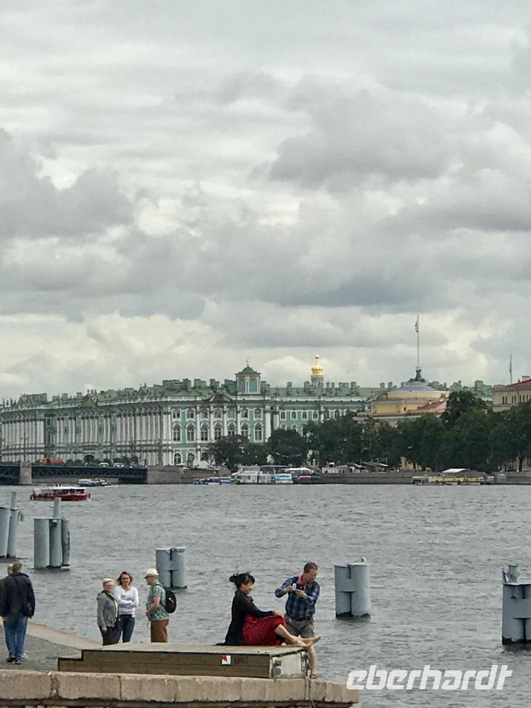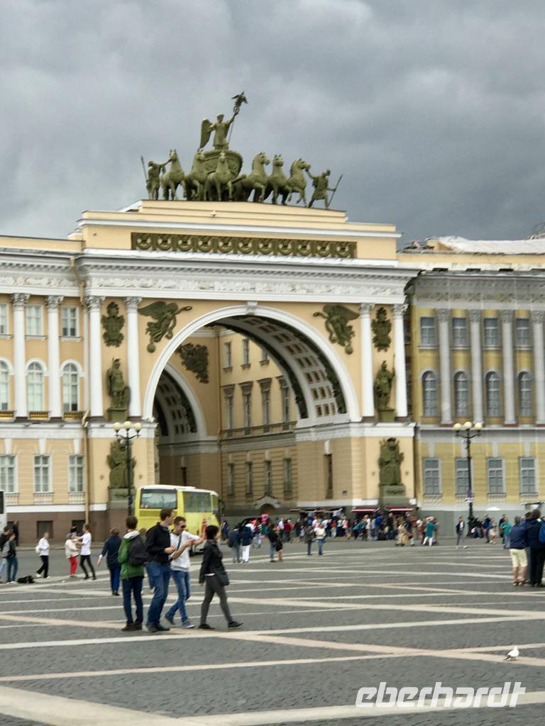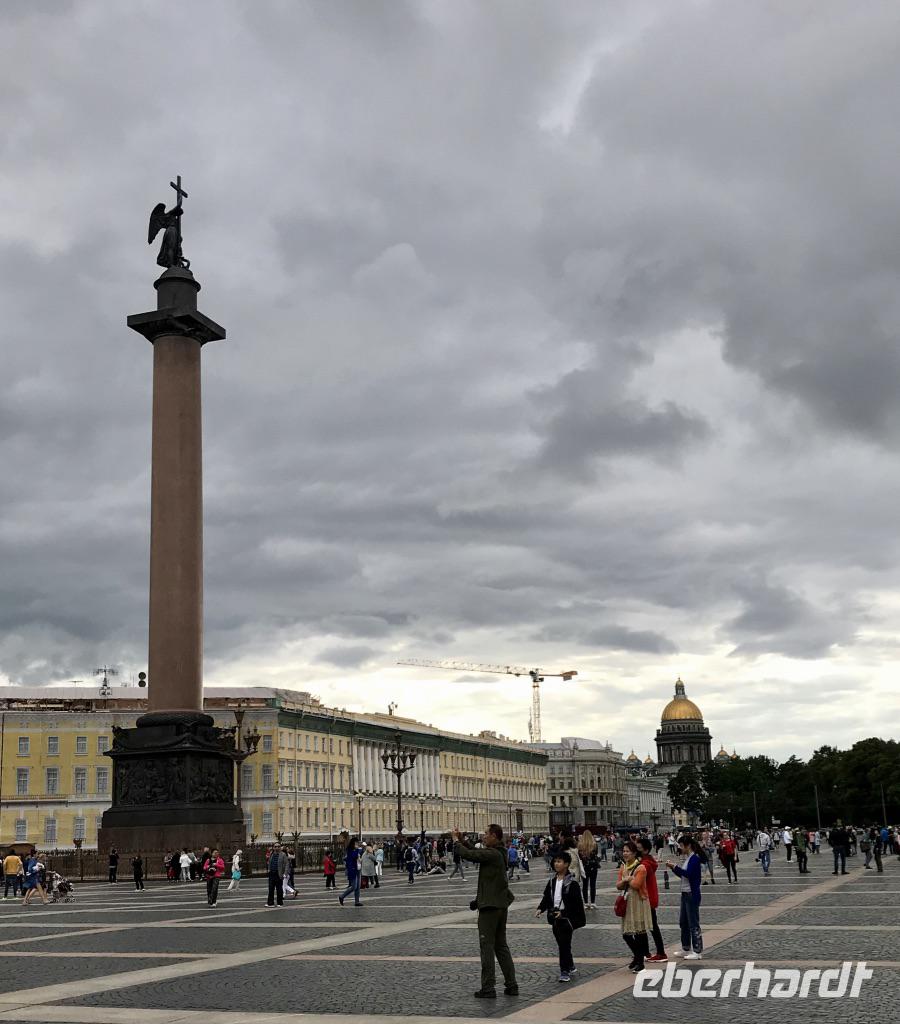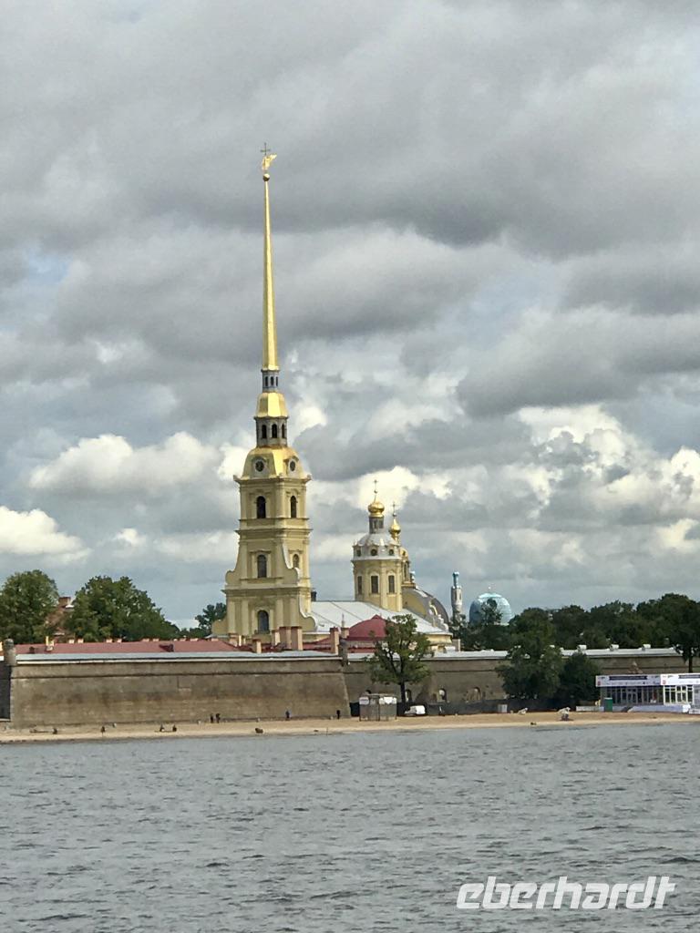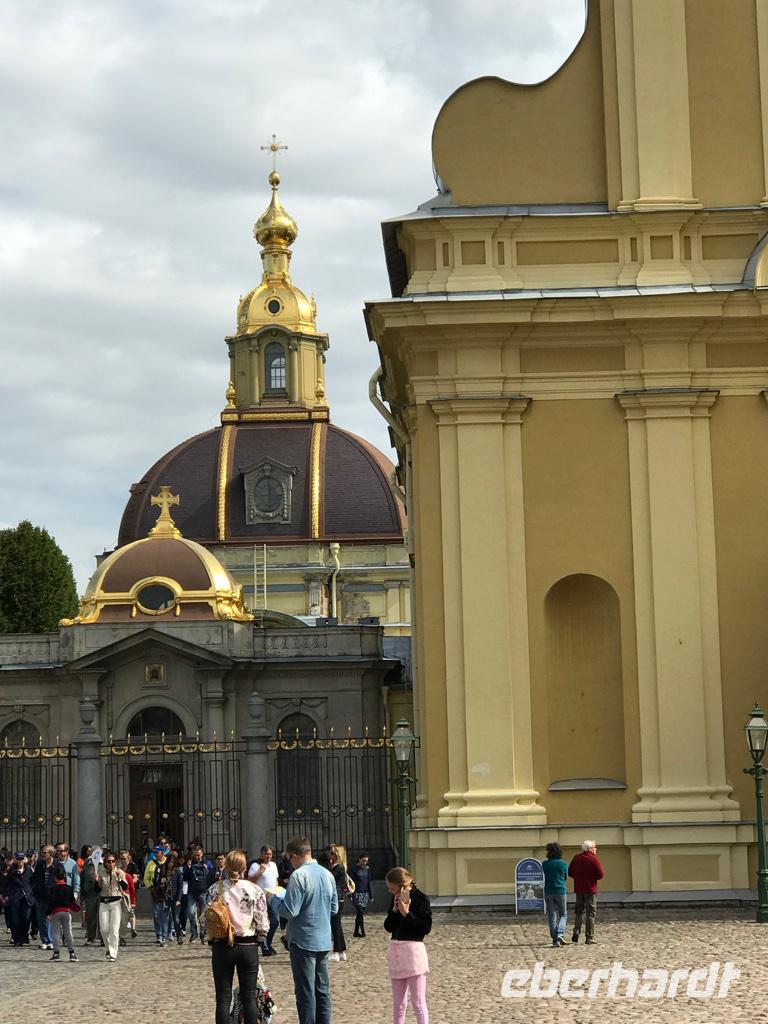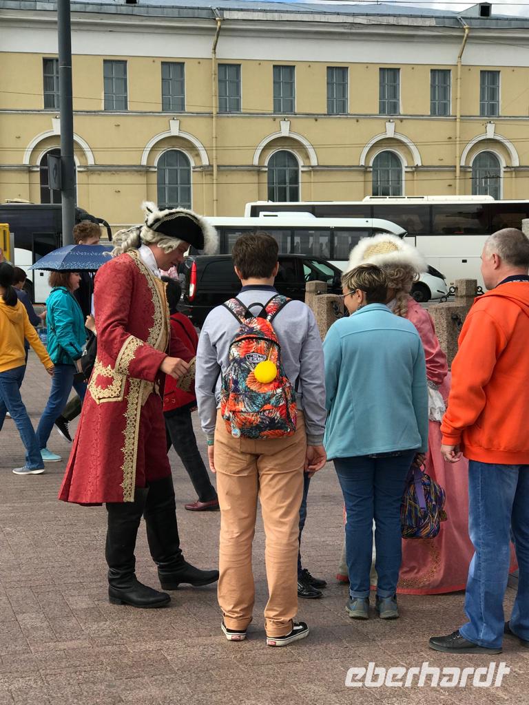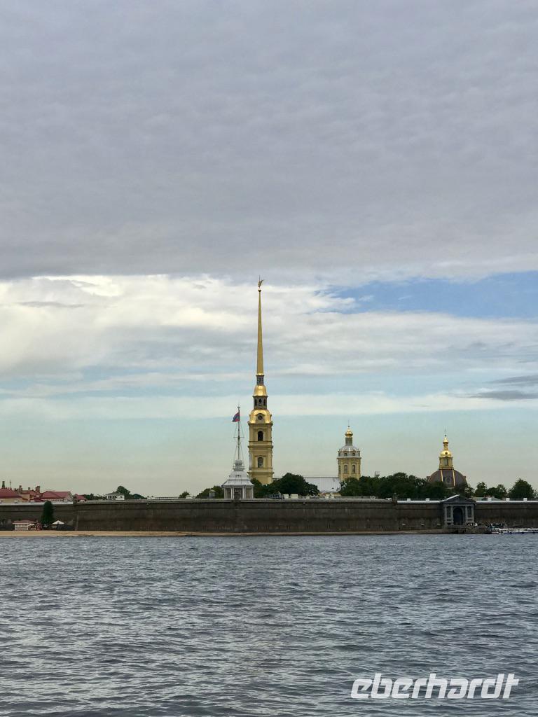 Der nächste Tag hielt für uns ein sehr umfangreiches Programm bereit. Zunächst fuhren wir mit dem Bus auf Besichtigungstour. Wir erfuhren Wissenswertes über den Stadtteil, in dem wir unser Hotel bezogen hatten, über den Heumarkt (Sennaja Ploschad) und über den Dreizack an Straßen, die an der Admiralität ihren Ausgang nehmen. Wir fuhren zum Platz vor der Isaakskathedrale, auf dem sich das Denkmal für Zar Nikolai I. befindet. Wir erfuhren mehr über die Blutskirche (Christi Auferstehungskirche) und das Attentat auf den Zaren Alexander II., wir besichtigten die Nikolaus-Marine-Kirche mit den goldenen Kuppeln und erfuhren die Geschichte um die kinderlose Zarin Elisabeth, die Tochter des Zaren Peter I. Weiter ging es zur Strelka, der Inselspitze auf der Wassili-Insel am Börsenplatz, dort wo sich der Newa-Fluß teilt. Hier befinden sich die beiden rostroten Rostrasäulen, die einst als Leuchtfeuer dienten. Von hier aus hat man einen wunderschönen Blick auf die Stadt, hinüber zum Winterpalast, man sieht die Spitze der Admiralität, die Kuppel der Isaakskathedrale und der Türme in der Peter-Paul-Festung. Es ist ein buntes Treiben an diesem Platz mit Händlern und Touristen aus aller Welt. Das Highlight der Stadtführung war dann die Besichtigung der Peter-Paul-Festung auf der Haseninsel, dort wo St. Petersburg einst seinen Anfang genommen hatte. Heute ist die Festung ein Museumskomplex, den wir gerade betraten als der Kanonenschuss ertönte, wie jeden Tag mittags um 12 Uhr. Unser Weg führte zur Peter-Paul-Kathedrale, Grablege der Zarenfamilie. Langsam gingen wir an den vielen prächtig verzierten oder manchmal auch sehr einfach gestalteten Sarkophagen vorbei und versuchten die Familienverhältnisse aus den Erzählungen unserer Reiseleiterin nachzuvollziehen. Es war nicht so einfach, aber dennoch in Erinnerung blieben vor allem die Gräber der beiden großen Zaren, Peter I. und Katharina II., und die verstrickten Familienbindungen zwischen den russischen Zaren und Großfürsten und den deutschen Fürstenhäusern. Auch die 1918 in Jekaterinburg erschossene letzte Zarenfamilie der Romanows fand hier in einer Seitenkapelle Ihre letzte Ruhestätte. Am Nachmittag dann fuhren wir zum Herz der Stadt, zum Schlossplatz mit der Alexandersäule. Zunächst bewunderten wir das architektonisch so perfekt gestaltete Ensemble und verloren unseren Blick im barocken Schloss, dem Winterpalast und seinen Anbauten, der einstigen Hauptresidenz der Zarenfamilie. Eine Führung durch die Eremitage im Winterpalast machte das überwältigende Kunsterlebnis perfekt. Den Reichtum Russlands bewundernd, die historische Aura genießend, ließen wir uns durch das Labyrinth der Säle und Gemächer treiben. So wie August der Starke für Sachsen war es Katharina die Große für Russland, die mit ihren Sammelleidenschaften für Gemälde und Kunstgüter den Anfang für große Kollektionen legten. Pflastermüde und mit Eindrücken überfüllt beendeten wir einen langen Tag.