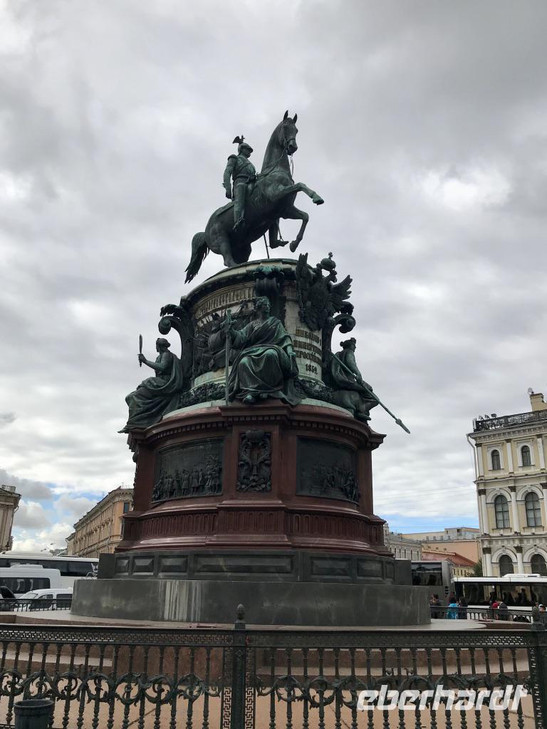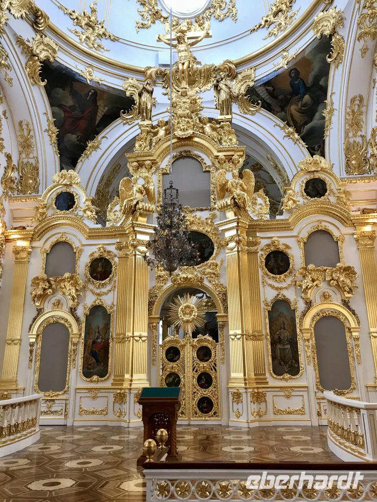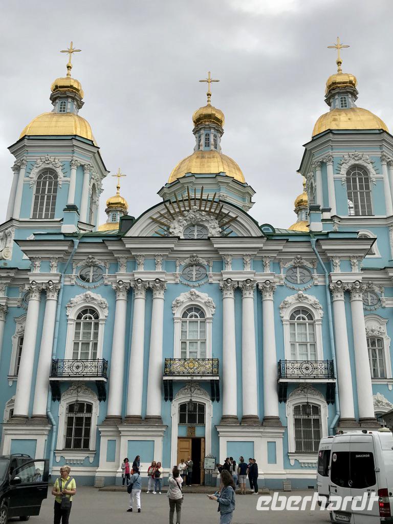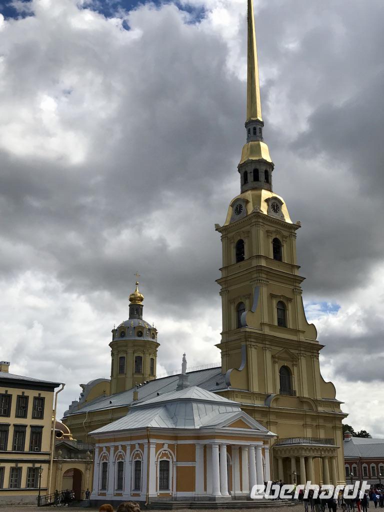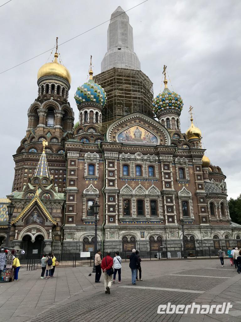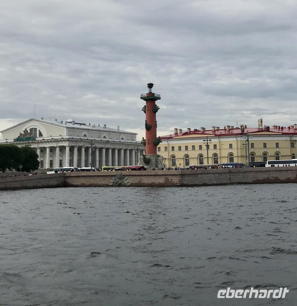 Der nächste Tag hielt für uns ein sehr umfangreiches Programm bereit. Zunächst fuhren wir mit dem Bus auf Besichtigungstour. Wir erfuhren Wissenswertes über den Stadtteil, in dem wir unser Hotel bezogen hatten, über den Heumarkt (Sennaja Ploschad) und über den Dreizack an Straßen, die an der Admiralität ihren Ausgang nehmen. Wir fuhren zum Platz vor der Isaakskathedrale, auf dem sich das Denkmal für Zar Nikolai I. befindet. Wir erfuhren mehr über die Blutskirche (Christi Auferstehungskirche) und das Attentat auf den Zaren Alexander II., wir besichtigten die Nikolaus-Marine-Kirche mit den goldenen Kuppeln und erfuhren die Geschichte um die kinderlose Zarin Elisabeth, die Tochter des Zaren Peter I. Weiter ging es zur Strelka, der Inselspitze auf der Wassili-Insel am Börsenplatz, dort wo sich der Newa-Fluß teilt. Hier befinden sich die beiden rostroten Rostrasäulen, die einst als Leuchtfeuer dienten. Von hier aus hat man einen wunderschönen Blick auf die Stadt, hinüber zum Winterpalast, man sieht die Spitze der Admiralität, die Kuppel der Isaakskathedrale und der Türme in der Peter-Paul-Festung. Es ist ein buntes Treiben an diesem Platz mit Händlern und Touristen aus aller Welt. Das Highlight der Stadtführung war dann die Besichtigung der Peter-Paul-Festung auf der Haseninsel, dort wo St. Petersburg einst seinen Anfang genommen hatte. Heute ist die Festung ein Museumskomplex, den wir gerade betraten als der Kanonenschuss ertönte, wie jeden Tag mittags um 12 Uhr. Unser Weg führte zur Peter-Paul-Kathedrale, Grablege der Zarenfamilie. Langsam gingen wir an den vielen prächtig verzierten oder manchmal auch sehr einfach gestalteten Sarkophagen vorbei und versuchten die Familienverhältnisse aus den Erzählungen unserer Reiseleiterin nachzuvollziehen. Es war nicht so einfach, aber dennoch in Erinnerung blieben vor allem die Gräber der beiden großen Zaren, Peter I. und Katharina II., und die verstrickten Familienbindungen zwischen den russischen Zaren und Großfürsten und den deutschen Fürstenhäusern. Auch die 1918 in Jekaterinburg erschossene letzte Zarenfamilie der Romanows fand hier in einer Seitenkapelle Ihre letzte Ruhestätte. Am Nachmittag dann fuhren wir zum Herz der Stadt, zum Schlossplatz mit der Alexandersäule. Zunächst bewunderten wir das architektonisch so perfekt gestaltete Ensemble und verloren unseren Blick im barocken Schloss, dem Winterpalast und seinen Anbauten, der einstigen Hauptresidenz der Zarenfamilie. Eine Führung durch die Eremitage im Winterpalast machte das überwältigende Kunsterlebnis perfekt. Den Reichtum Russlands bewundernd, die historische Aura genießend, ließen wir uns durch das Labyrinth der Säle und Gemächer treiben. So wie August der Starke für Sachsen war es Katharina die Große für Russland, die mit ihren Sammelleidenschaften für Gemälde und Kunstgüter den Anfang für große Kollektionen legten. Pflastermüde und mit Eindrücken überfüllt beendeten wir einen langen Tag.