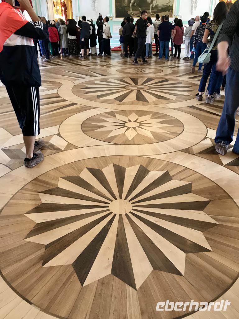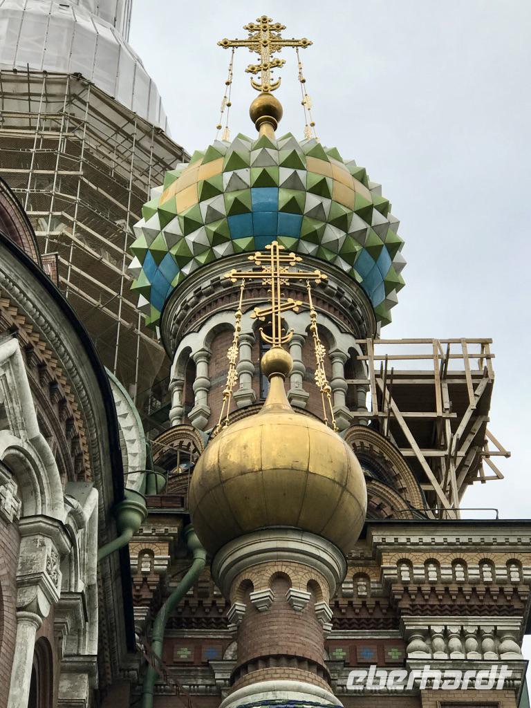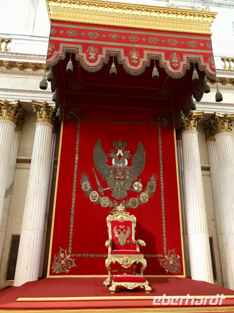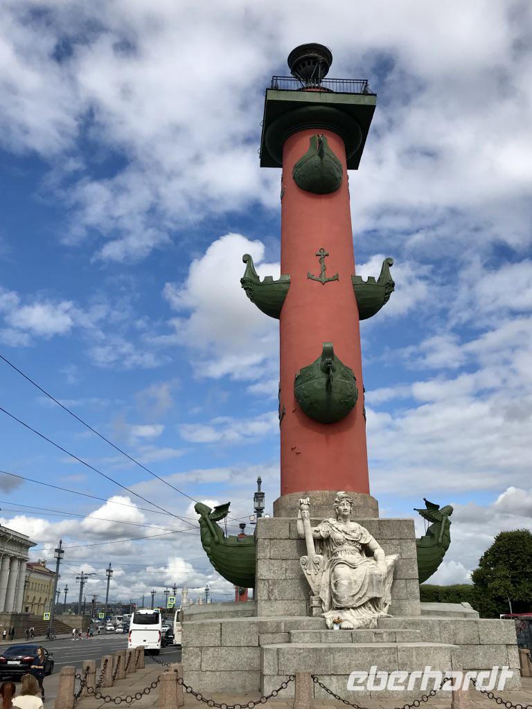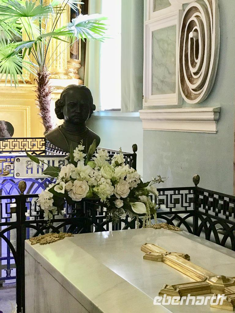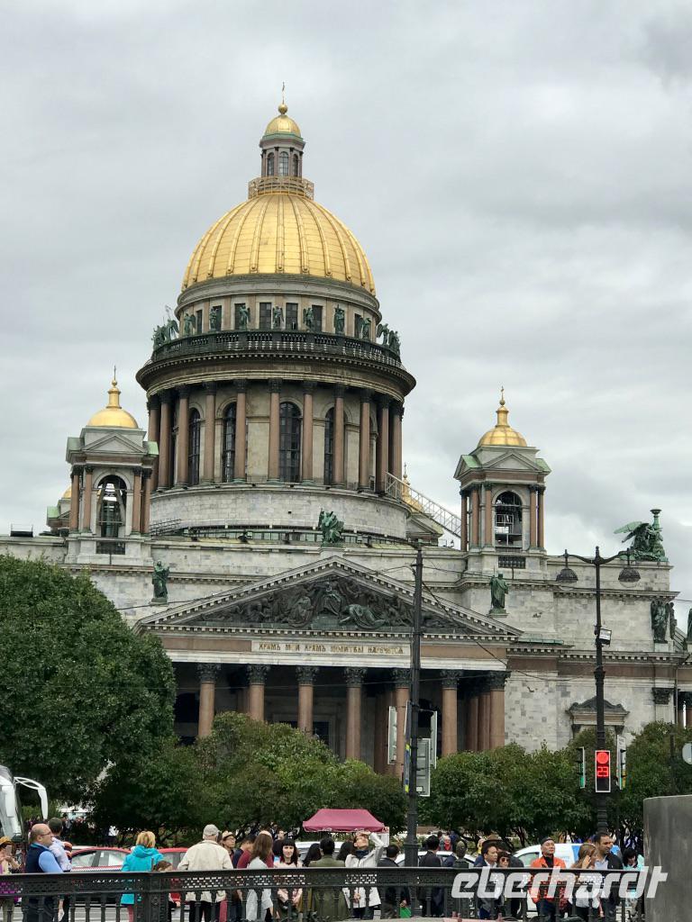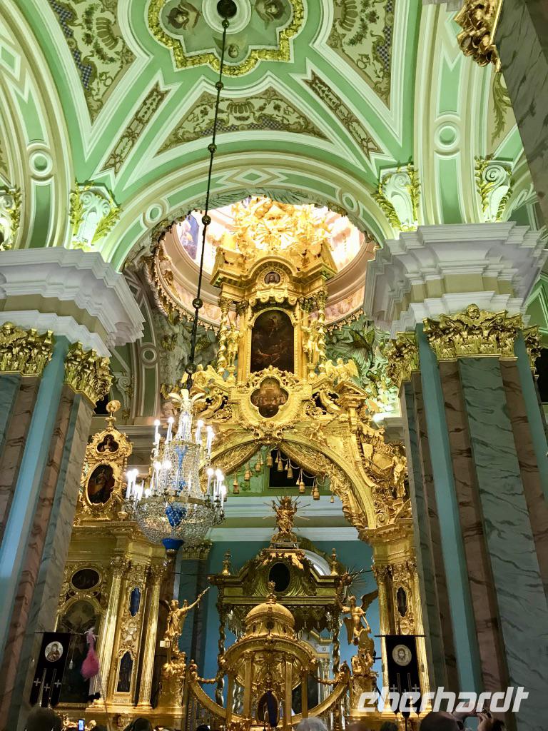 Der nächste Tag hielt für uns ein sehr umfangreiches Programm bereit. Zunächst fuhren wir mit dem Bus auf Besichtigungstour. Wir erfuhren Wissenswertes über den Stadtteil, in dem wir unser Hotel bezogen hatten, über den Heumarkt (Sennaja Ploschad) und über den Dreizack an Straßen, die an der Admiralität ihren Ausgang nehmen. Wir fuhren zum Platz vor der Isaakskathedrale, auf dem sich das Denkmal für Zar Nikolai I. befindet. Wir erfuhren mehr über die Blutskirche (Christi Auferstehungskirche) und das Attentat auf den Zaren Alexander II., wir besichtigten die Nikolaus-Marine-Kirche mit den goldenen Kuppeln und erfuhren die Geschichte um die kinderlose Zarin Elisabeth, die Tochter des Zaren Peter I. Weiter ging es zur Strelka, der Inselspitze auf der Wassili-Insel am Börsenplatz, dort wo sich der Newa-Fluß teilt. Hier befinden sich die beiden rostroten Rostrasäulen, die einst als Leuchtfeuer dienten. Von hier aus hat man einen wunderschönen Blick auf die Stadt, hinüber zum Winterpalast, man sieht die Spitze der Admiralität, die Kuppel der Isaakskathedrale und der Türme in der Peter-Paul-Festung. Es ist ein buntes Treiben an diesem Platz mit Händlern und Touristen aus aller Welt. Das Highlight der Stadtführung war dann die Besichtigung der Peter-Paul-Festung auf der Haseninsel, dort wo St. Petersburg einst seinen Anfang genommen hatte. Heute ist die Festung ein Museumskomplex, den wir gerade betraten als der Kanonenschuss ertönte, wie jeden Tag mittags um 12 Uhr. Unser Weg führte zur Peter-Paul-Kathedrale, Grablege der Zarenfamilie. Langsam gingen wir an den vielen prächtig verzierten oder manchmal auch sehr einfach gestalteten Sarkophagen vorbei und versuchten die Familienverhältnisse aus den Erzählungen unserer Reiseleiterin nachzuvollziehen. Es war nicht so einfach, aber dennoch in Erinnerung blieben vor allem die Gräber der beiden großen Zaren, Peter I. und Katharina II., und die verstrickten Familienbindungen zwischen den russischen Zaren und Großfürsten und den deutschen Fürstenhäusern. Auch die 1918 in Jekaterinburg erschossene letzte Zarenfamilie der Romanows fand hier in einer Seitenkapelle Ihre letzte Ruhestätte. Am Nachmittag dann fuhren wir zum Herz der Stadt, zum Schlossplatz mit der Alexandersäule. Zunächst bewunderten wir das architektonisch so perfekt gestaltete Ensemble und verloren unseren Blick im barocken Schloss, dem Winterpalast und seinen Anbauten, der einstigen Hauptresidenz der Zarenfamilie. Eine Führung durch die Eremitage im Winterpalast machte das überwältigende Kunsterlebnis perfekt. Den Reichtum Russlands bewundernd, die historische Aura genießend, ließen wir uns durch das Labyrinth der Säle und Gemächer treiben. So wie August der Starke für Sachsen war es Katharina die Große für Russland, die mit ihren Sammelleidenschaften für Gemälde und Kunstgüter den Anfang für große Kollektionen legten. Pflastermüde und mit Eindrücken überfüllt beendeten wir einen langen Tag.