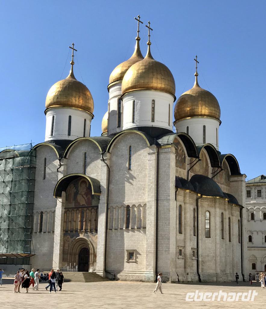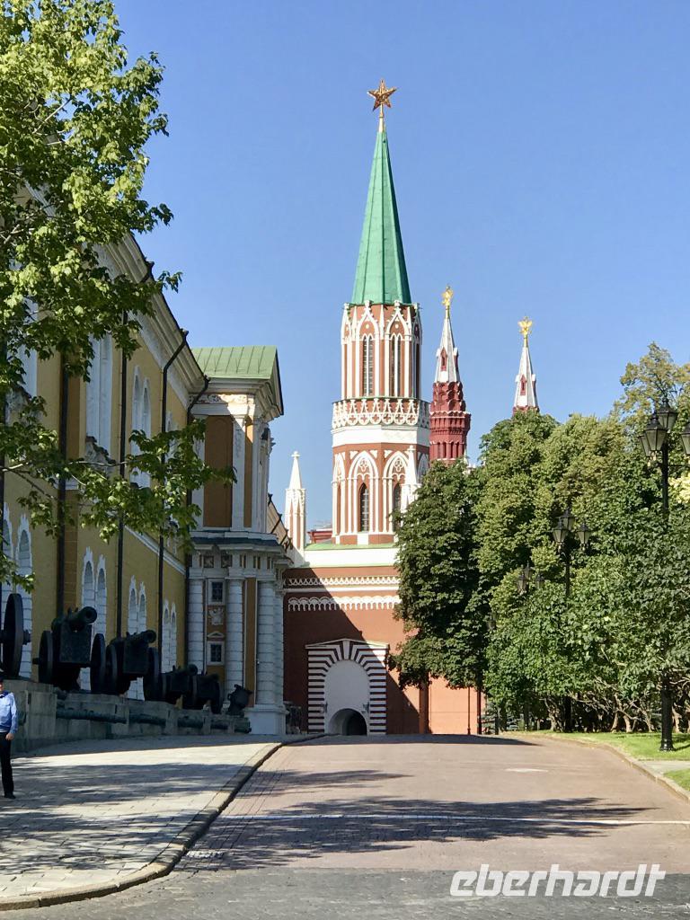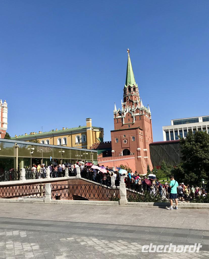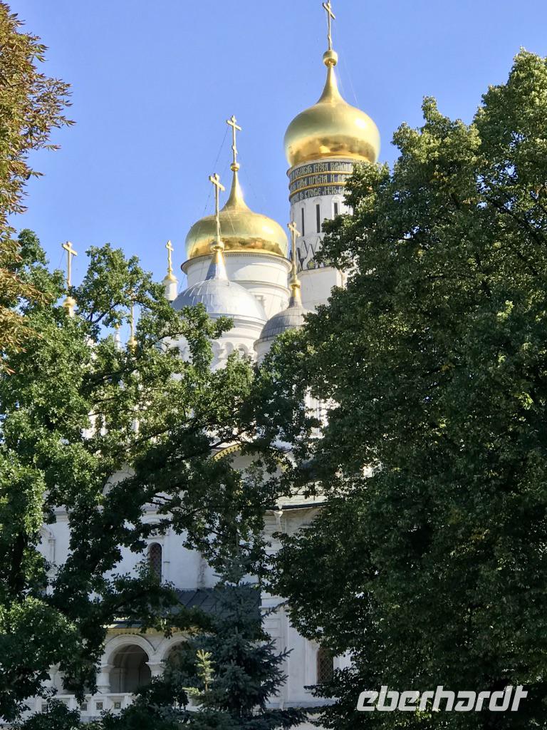 Anschließend besuchten wir den Kreml. Zunächst beeindruckten uns die endlosen Schlangen an der Kasse und den Eingängen. Aber nach recht kurzer Zeit hatten wir es dennoch geschafft, den Sicherheitscheck zu überstehen und dem Eingang entgegen zu gehen. Als sich die Kreml-Pracht vor uns entfaltet, waren wir schon sehr beeindruckt. Da waren der Große Kreml-Palast, die Kathedralen, die Zarenglocke und Zar-Puschka, die größte Kanone der Welt. Wir schlenderten über den Kathedralenplatz mit den vielen Kathedralen und suchten den Schatten. Nach einer kurzen Pause besuchten wir die Rüstkammer und bestaunten bei einer Führung die Schätze Russlands, die Kronen der Zaren, die Kleider, den Schmuck und die Kostbarkeiten der Zarenfamilien. Auf dem Weg zum Hotel besichtigten wir dann noch einige Metrostationen und die unterirdische Pracht des Moskauer Metronetzes. Die thematisch wunderbar mit Marmor, Farben und Stuckaturen gestalteten Stationen waren beiindruckend. Für uns jedoch war es auch verwirrend, wie man wohl in diesem so kaum vertrauten Netz unter der Erde zurechtkommen sollte. Einige unserer Gäste besuchten im Anschluss eine Musikshow „Wunderbares Russland", die unsere Erwartungen nicht erfüllte.