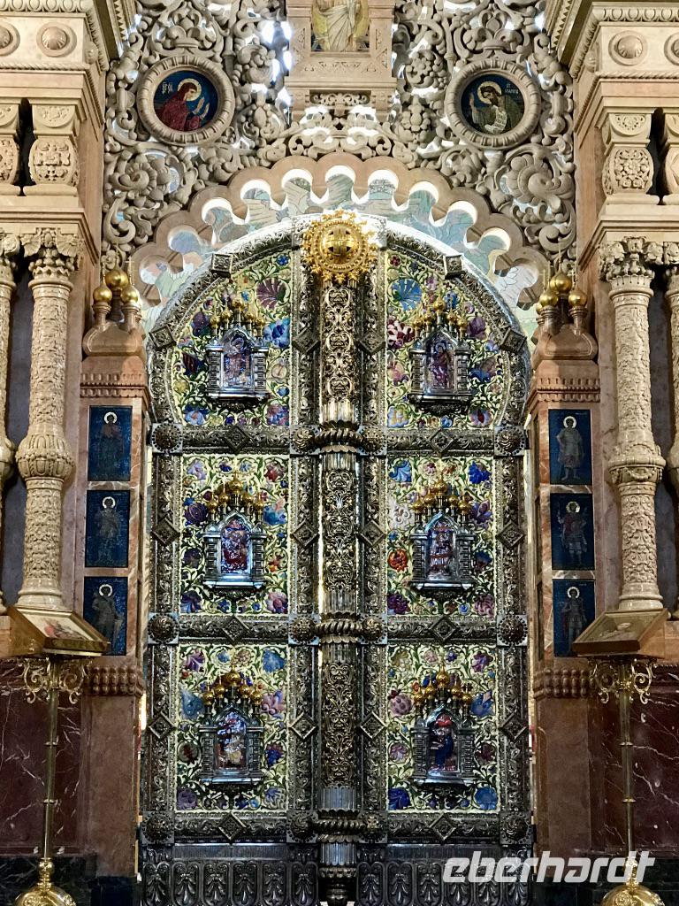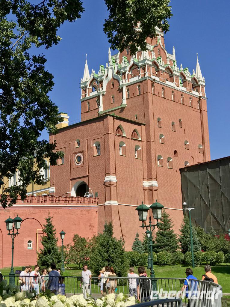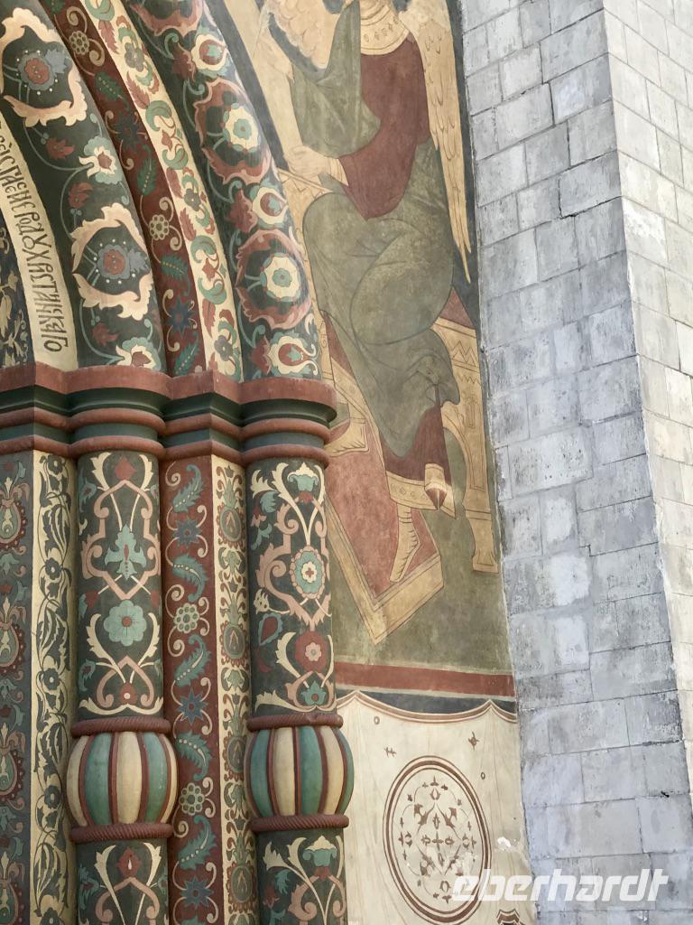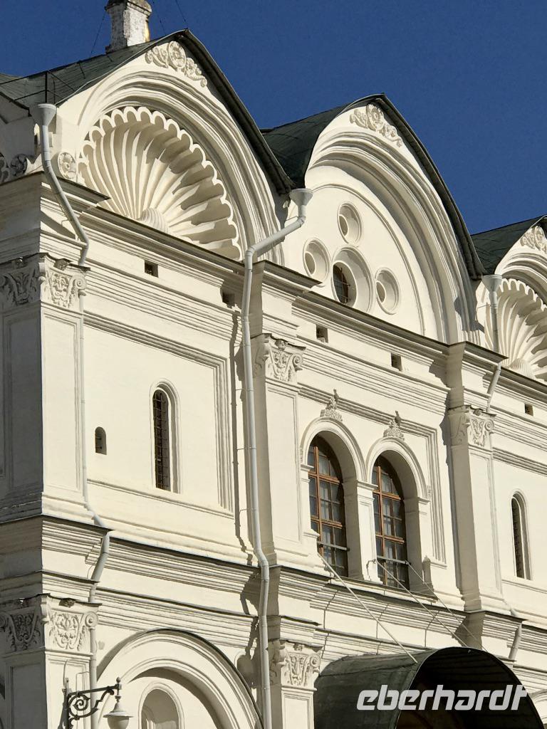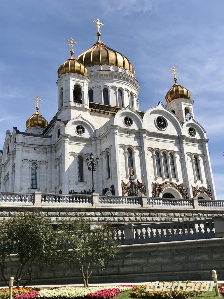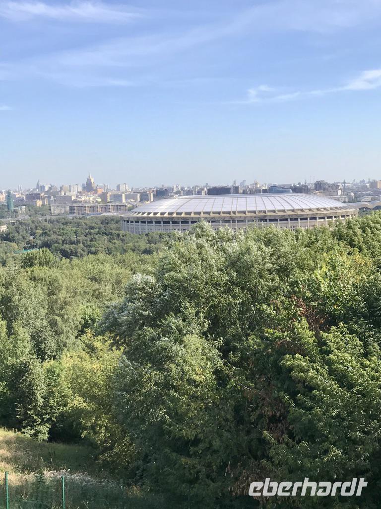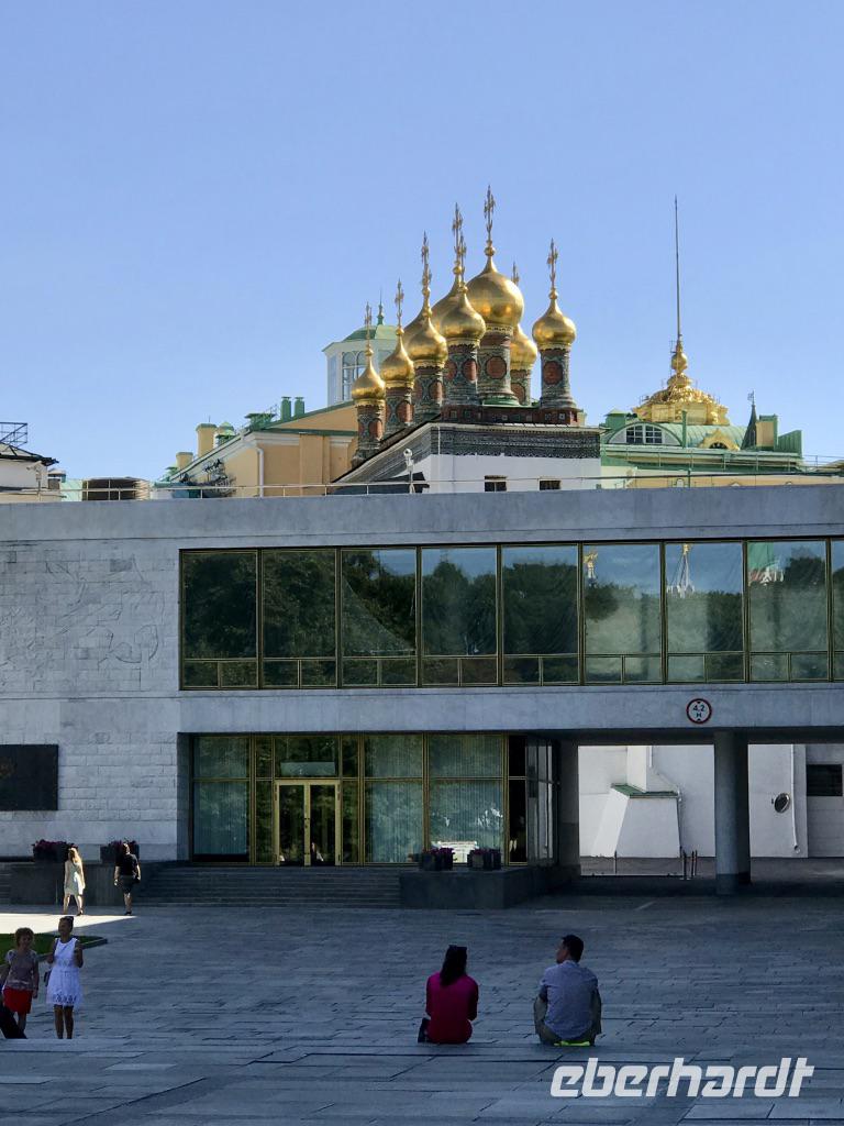 Unsere Stadtrundfahrt führte uns durch das Zentrum der Stadt, vorbei an Moskaus neuer Banken- und Verwaltungscity und den in den Himmel strebenden Hochhäusern. Zunächst führte uns der Weg hinauf zu den Sperlingsbergen mit dem Hauptgebäude der Lomonossow-Universität. Von hier hatten wir einen wunderbaren Blick auf die Stadt mit den 7 Schwestern aus der Stalinzeit, den Türmchen reichen Hochhäusern im Zuckerbäckerstil. Unter uns lag direkt das Olympia-Stadion Luschniki. Von hier aus fuhren wir weiter zum Neujungfrauenkloster. Eine Zeit lang war es eine Art Frauengefängnis für die Adligen. Vom Wehrcharakter des Klosters zeugen noch heute die dicken Wehrmauern. Leider war das Kloster zu großen Teilen eingerüstet, den dank der UNESCO konnten nunmehr weitreichende Restaurierungsarbeiten am Kloster vorgenommen werden. Der Höhepunkt unsere Fahrt war die Besichtigung der Christus-Erlöser-Kathedrale, die ursprünglich errichtet worden war als Gedächtniskirche für den russischen Sieg über Napoleon in den Jahren 1838-88. Einst war es die größte orthodoxe Kirche der Welt. Die Kathedrale hat ein furchtbares Schicksal ereilt. Stalin ließ die Kathedrale sprengen und Chruschtschow ein Schwimmbad an dieser Stelle bauen. 1997 wurde die Kathedrale wiedereröffnet. Wenn man die Kathedrale betritt, ist man zu tiefst beeindruckt von der Schönheit und dem Glanz. Unsere Stadtrundfahrt endete auf dem Roten Platz. Leider konnten wir den Platz selbst nicht bewundern, da eine große Menge an Tribünen für eine kulturelle Veranstaltung installiert worden war. Die Mittagspause verlegten wir in das GUM, Moskaus alter und neuer Einkaufsmeile. Das Sortiment hat gewechselt, die Marken auch und vor allem die Preise. Ein bisschen des alten Flairs ist geblieben.