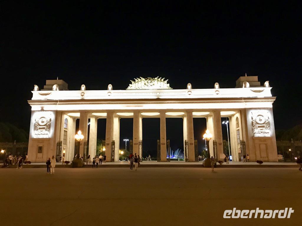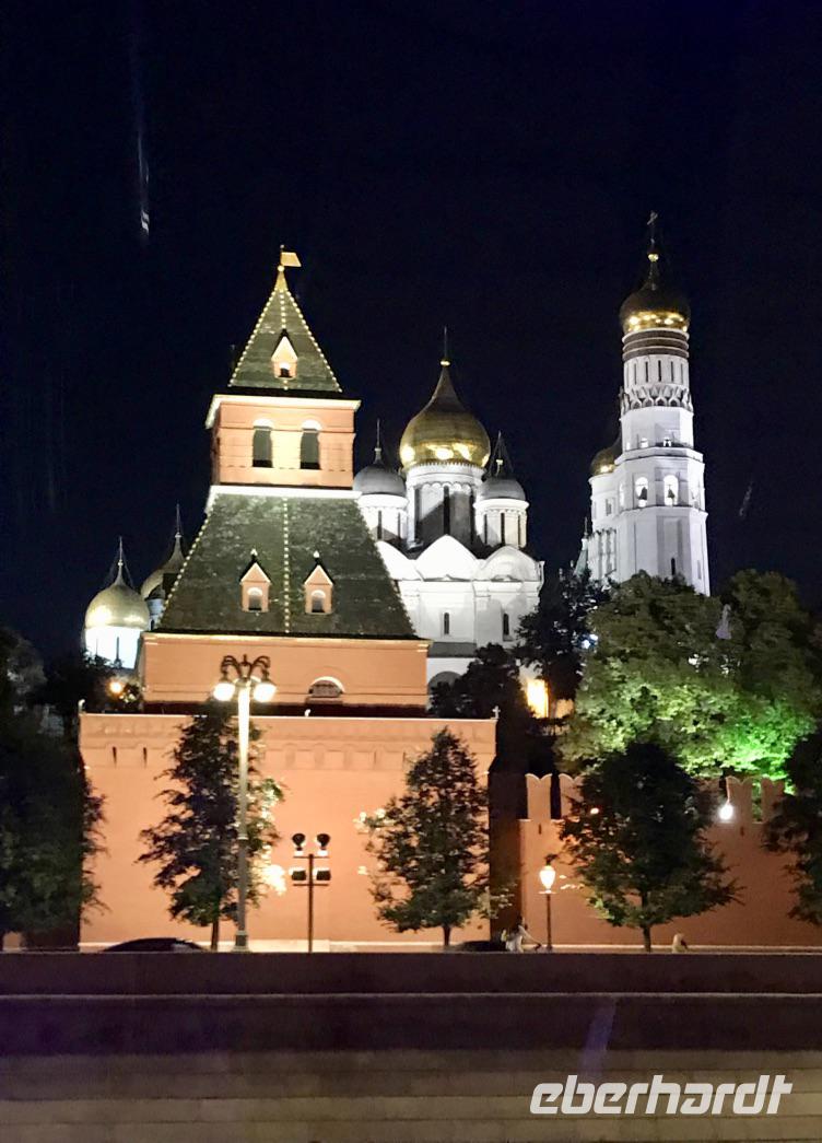 Unsere Reisegruppe wurde immer größer je näher wir dem Ziel kamen, zum Schluss waren wir 18 Personen. Zunächst flogen wir mit einem kleinen Kern von Dresden nach Frankfurt, dort gesellten sich Gäste aus Leipzig und aus dem Süden der Republik zu uns, dann flogen wir mit Lufthansa nach Moskau und im Hotel trafen wir noch weitere Gäste. Für einige von uns war es der erste Besuch in Russland, für andere war es ein Wiedersehen. Unser Hotel Radisson Blue Belorusskaja lag nicht sehr weit vom Stadtzentrum entfernt, in der Nähe des Bahnhofes Belorusskij Vokzal. Man kann geradewegs die Twerskaja hinab schlendern und erreicht dann den Kreml oder man nimmt die Metro. Die Busfahrt zum Hotel führte am historischen Zentrum der Stadt vorbei und wir sahen schon bald den Kreml, das Wahrzeichen der Stadt. Den Nachmittag verbrachten wir recht individuell und abends trafen wir uns zu einem Ausflug in dem Gorki-Kulturpark, der sich zu einem riesigen Vergnügungs- und Erholungspark für Jung und Alt entwickelt hat und gerade in diesen Tagen 90 Jahre alt geworden ist. Hier war unsere Anlegestelle für die Fluss-Schifffahrt auf der Moskwa. Ganz passend zum Lied - wenn es Abend wird an der Moskwa - konnten wir nun Moskau von allen Seiten bewundern, das Panoramaschiff von Radisson Cruise hatte große Fenster, um auch Fotos von dieser schönen, beleuchteten Stadt machen zu können. Gleichzeitig bekamen wir ein reichhaltiges Menü und waren allseits gesättigt.
