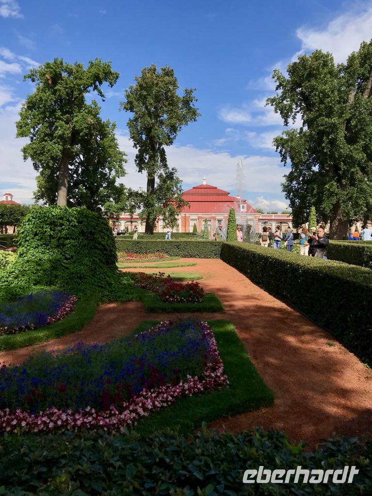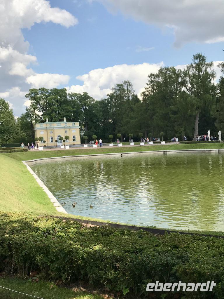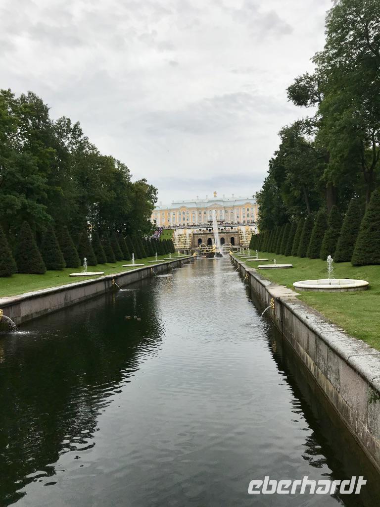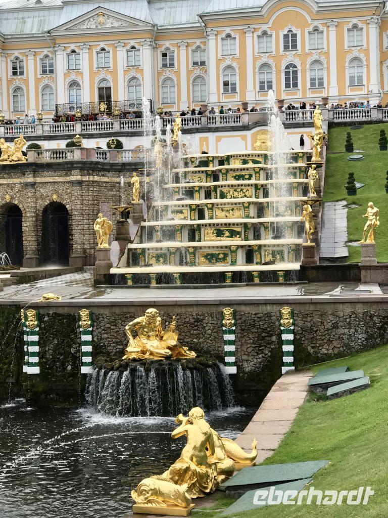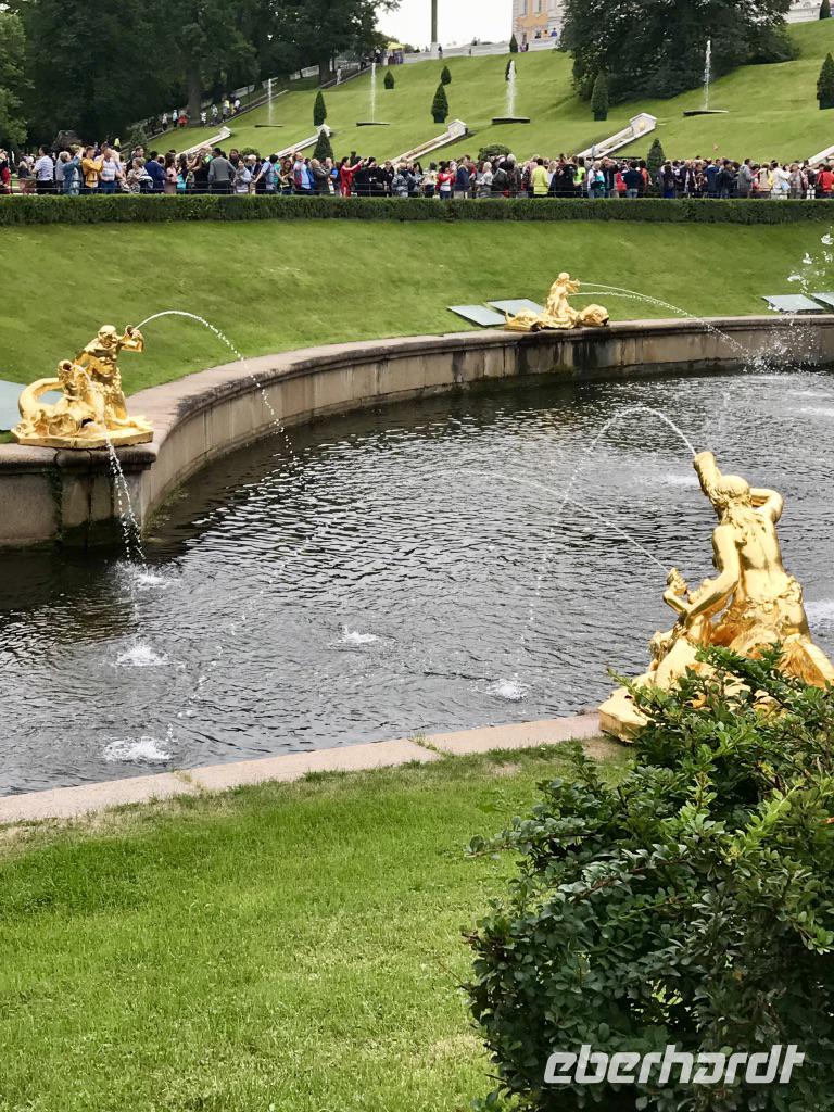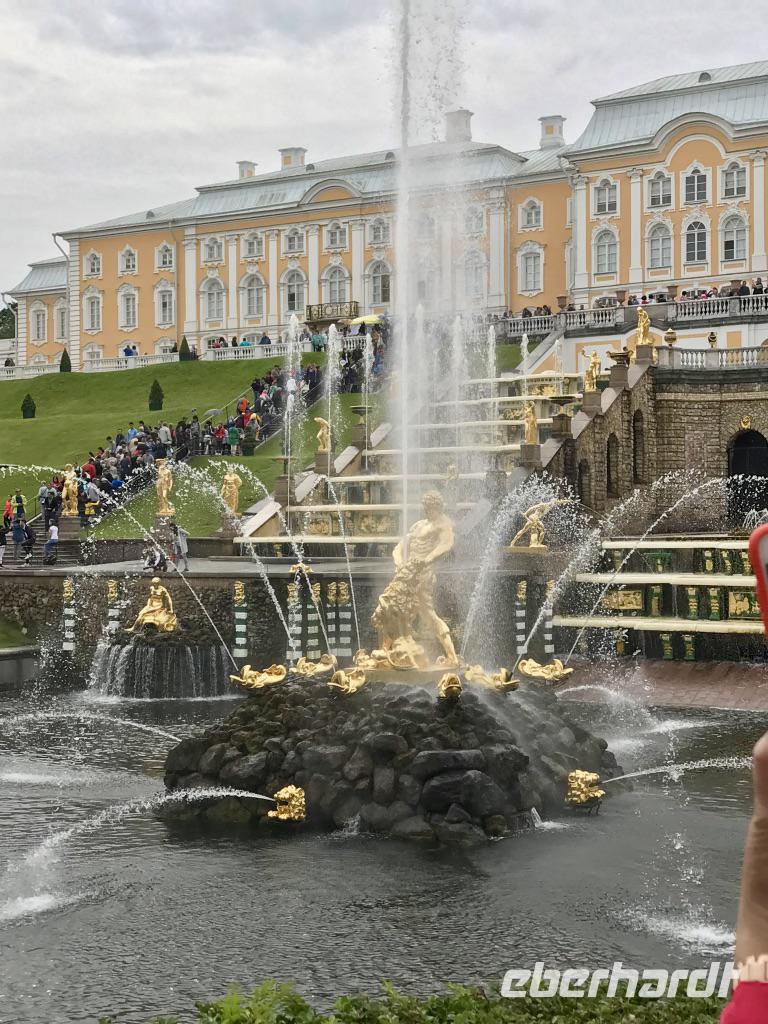 Heute wollten wir die Sommerresidenz der Zaren an der Newamündung kennenlernen, das russische Versailles. Wir erreichten das Areal mit dem Schnellboot Meteor. Schon von weitem konnte man die wunderschöne Anlage am Newaufer erkennen. Und dann - wir kamen noch rechtzeitig an der Großen Kaskade an, die sich treppenartig vom Schlossplateau hinab in einen Wasserkanal und dann in die Ostsee ergießt. Es war gerade 11 Uhr, als die Wasserspiele angestellt wurden und bei ergreifender Musik erst einige Tropfen und dann ganze Fontänen aus den Figuren und Wasserspeiern herausströmten. Welche ein Prunk, welch ein Konzert aus Gold, Marmor, Tuffstein und Wasser. Nach einem kurzen Verweilen besuchten wir das Lustschloss, den Großen Palast. Und wir hörten wie so oft den Namen des großen Baumeisters Bartolomeo Rastrelli, der diese Pracht erdacht und erschaffen hatte. Und wir versuchten das Machtstreben und den Reichtum der russischen Zaren, der Herrscher eines riesigen Reiches, in unser kleines Leben einzuordnen. Ein wenig von der Kurzweil der Herrscher verstanden wir später beim Rundgang durch den Unteren Park mit den vielen kleineren Fontänen und Kaskaden, dem Schlösschen Montplaisir, den wasserspeienden Drachen, den vielen Scherzspringbrunnen. Es ist eine Wonne an einem Sommernachmittag in diesem Ambiente zu lustwandeln.