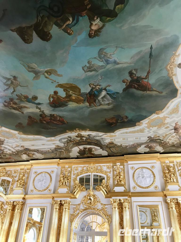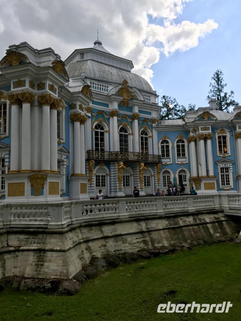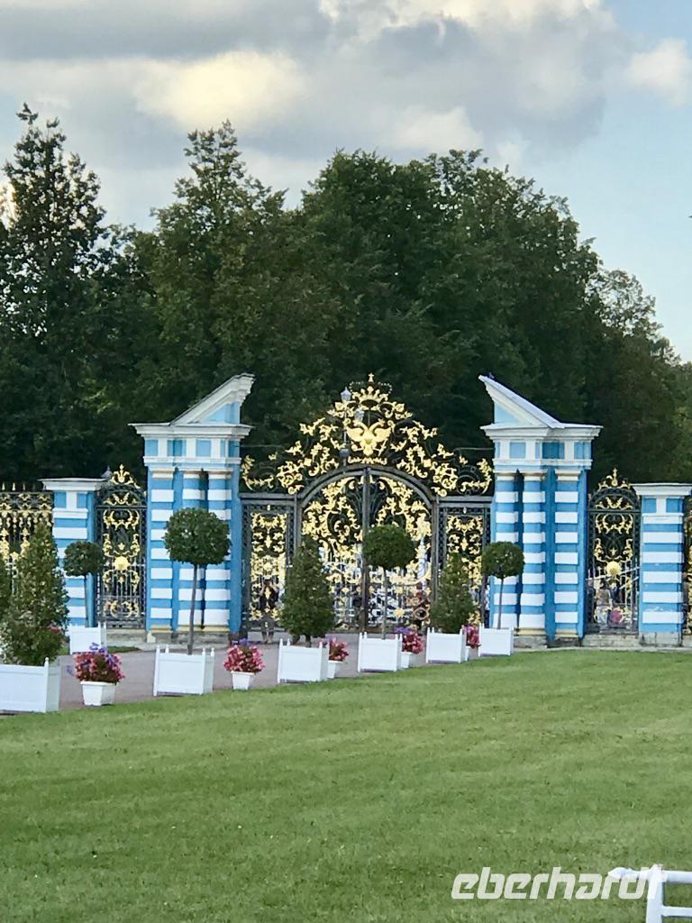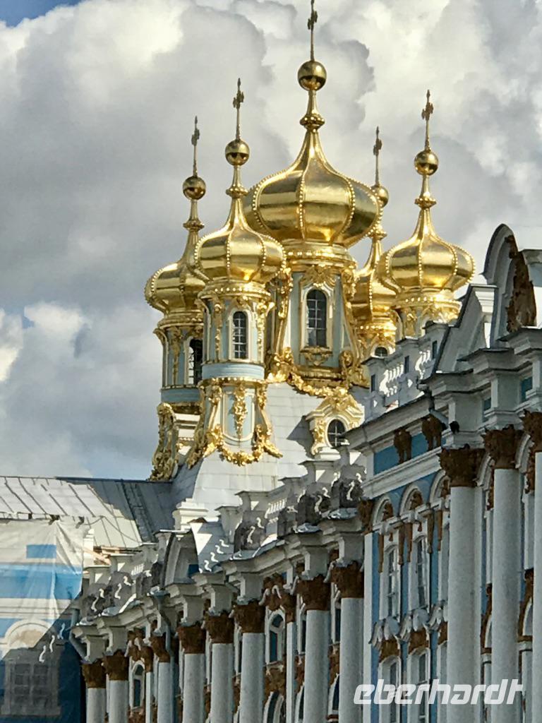 Es war unser letzter erlebnisreicher Tag. Wir starteten auf eine kleine Busreise nach Puschkin, zum geschichtsträchtigen Residenzvorort außerhalb St. Petersburgs, der in den politischen Wirren der Zeit oftmals seinen Namen gewechselt hatte, Zarskoje Selo (Zarendorf), Kinderdorf, Puschkin. Wenn auch unser Ziel Bernsteinzimmer heiß, so erlebten wir zunächst die Welt um das Schlossensemble des Katharinenpalastes, der nach Katharina I., der Ehefrau und Nachfolgerin von Peter dem Großen benannt ist. Das Schloss brachte uns erneut die Pracht dieser Zeit nahe, einen reich verzierten Thronsessel, üppige Stuckaturen, prächtig verziertes Porzellan (auch aus Meißen), riesige farbenfreudige Decken- und Wandgemälde, große reflektierende Wandspiegel, weite Ausblicke nach beiden Seiten zum Park und hinab auf die Ostsee, vergoldetes, barockes Schnitzwerk. Beeindruckend die Goldene Enfilade, eine lange Zimmerflucht von in barocker Üppigkeit gestalteten Räumen. Und dann das Bernsteinzimmer, Geschenk des preußischen Königs Friedrich Wilhelm I., Ausdruck der tiefen russisch-deutschen Beziehungen, die einen Vergleich zur Gegenwart aufkommen lassen. Nur ein kurzer Blick war uns vergönnt auf das Wunder in der Vielfalt der Farben des Bernsteins, des Wunders, das nach seinem bislang ungeklärten Verlust auf der Grundlage von Zeichnungen und Fotos neu entstanden ist. Welche Handwerkskunst. Wir hätten noch gern lange die Schnitzereien und Verzierungen bewundert, aber die Touristen strömten und schoben. Schade, welch kurzer Moment. Vielleicht sollte uns der Besuch in einem neu aus Holz gebauten Bojarenhof „Podworje" mit einem reichhaltigen Mittagessen entschädigen. Wir haben auch dies genossen, natürlich bei einem Wodka. Am Abend dann zurück in das moderne St. Petersburg, ein Abschied von den Mitreisenden und von Russland bei einem gemeinsamen Essen im Restaurant „Polny Balett". Auch nicht schlecht, bei Galina Ulanowa, der berühmten Balletttänzerin, virtuell zu Besuch gewesen zu sein.