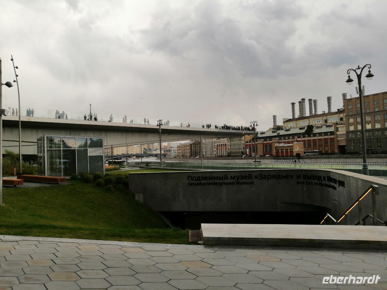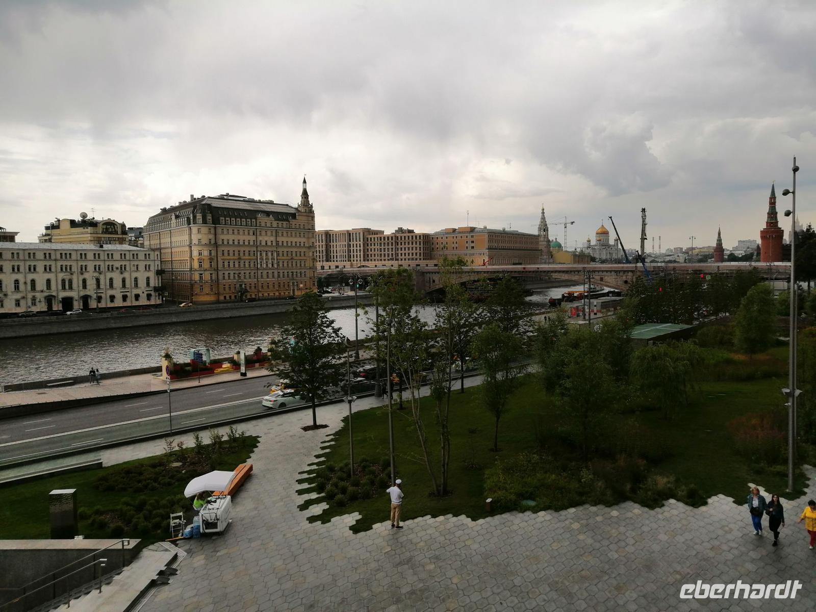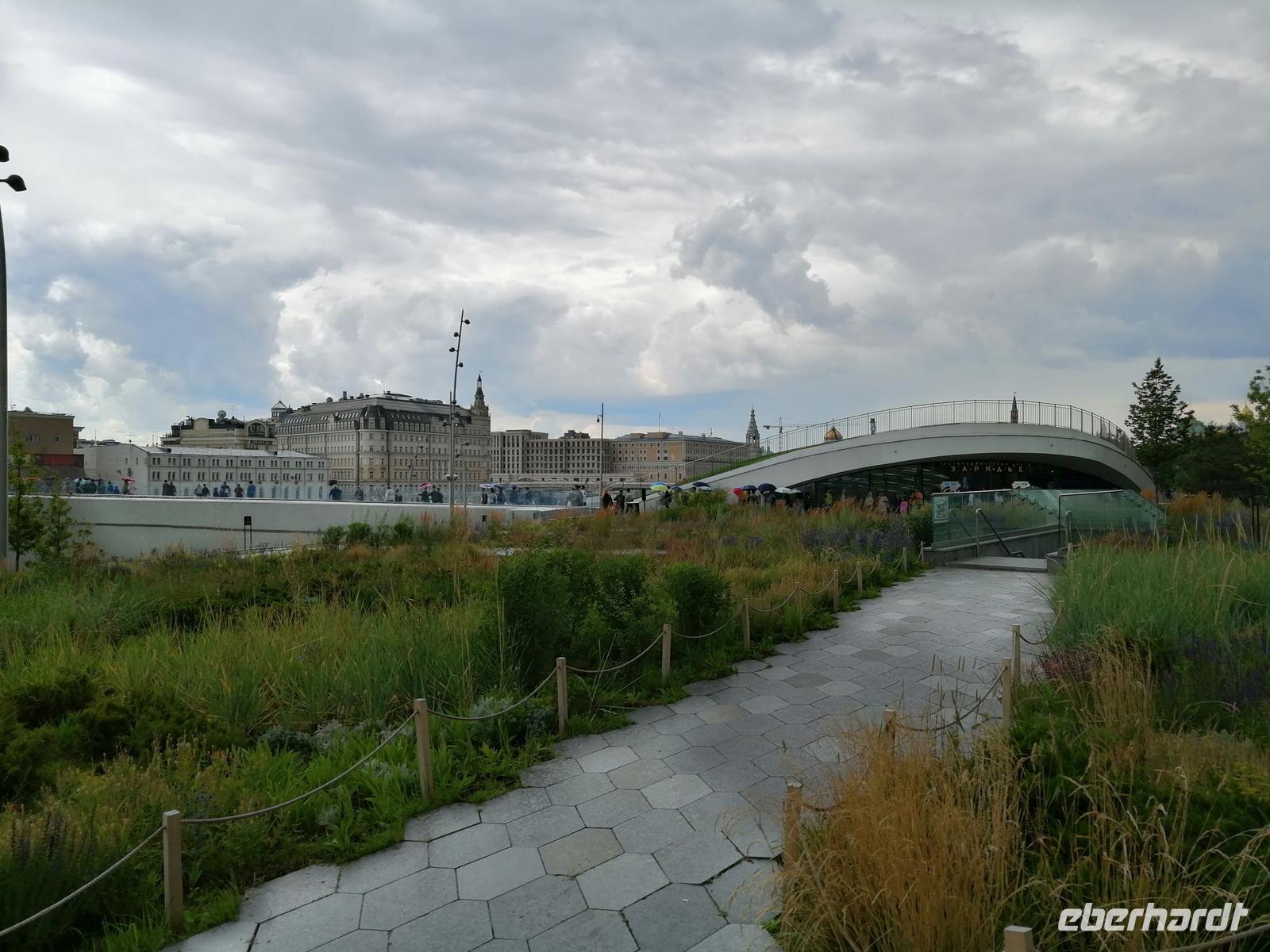 Nach dem guten Frühstück starteten wir unsere heutige Stadtrundfahrt gegen 10 Uhr. Auf Wunsch vieler Reisegäste besichtigten wir den neuen Park Sarjadje, der sich an der Uferpromenade der Moskwa, direkt vor dem Kreml befindet. Dort wo zu Sowjetzeiten das gigantische Hotel Rossija stand, wurde 2017 einen neuen Park eingeweiht. Der Park ist ca. 13 ha groß und bepflanzt mit geschützten Bäumen, Sträuchern und Blumen, die in Moskau gar nicht vorkommen. Das Konzept eines Architekturbüros aus New York sah vor, ganz Russland in Klein zu präsentieren, mit vier Vegetationszonen von der Tundra im Norden bis zur Steppe im Süden. Besonders spannend fanden wir die sehr beeindruckende schwebende Brücke, über die die Besucher des Sarjadje-Parks über die Uferpromenade hinweg an einen Aussichtspunkt über der Moskwa gelangen und Fotos machen können.