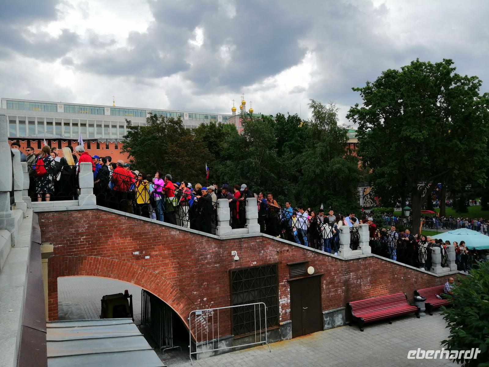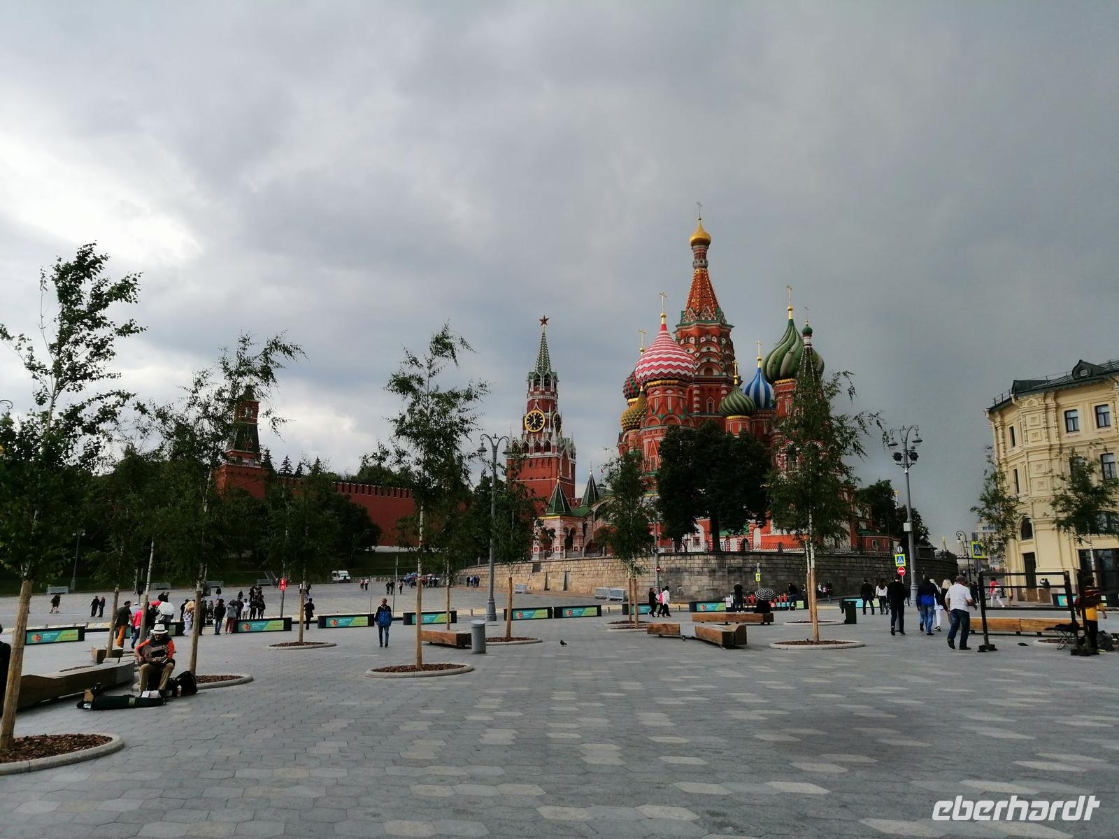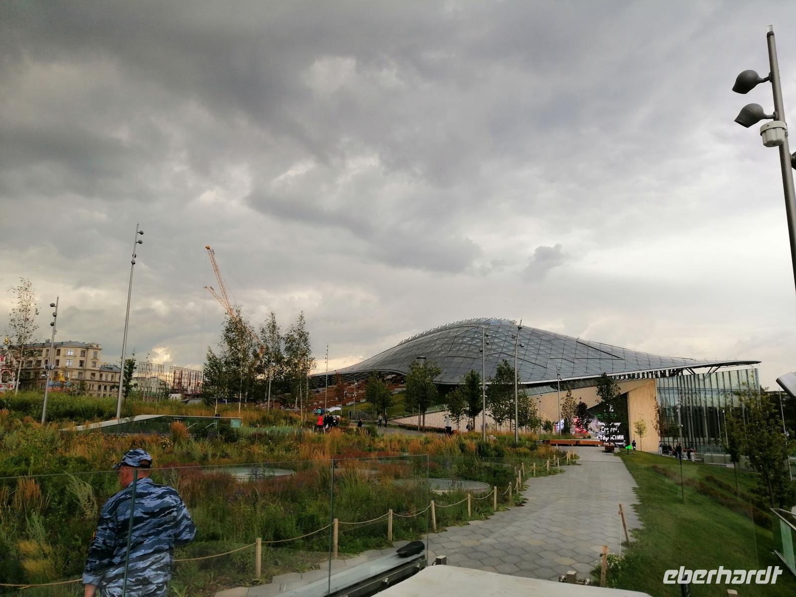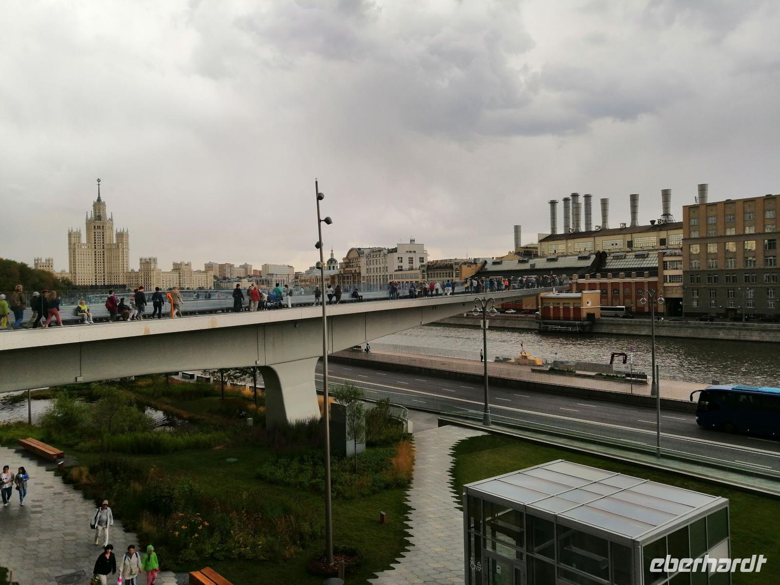 Nach dem guten Frühstück starteten wir unsere heutige Stadtrundfahrt gegen 10 Uhr. Auf Wunsch vieler Reisegäste besichtigten wir den neuen Park Sarjadje, der sich an der Uferpromenade der Moskwa, direkt vor dem Kreml befindet. Dort wo zu Sowjetzeiten das gigantische Hotel Rossija stand, wurde 2017 einen neuen Park eingeweiht. Der Park ist ca. 13 ha groß und bepflanzt mit geschützten Bäumen, Sträuchern und Blumen, die in Moskau gar nicht vorkommen. Das Konzept eines Architekturbüros aus New York sah vor, ganz Russland in Klein zu präsentieren, mit vier Vegetationszonen von der Tundra im Norden bis zur Steppe im Süden. Besonders spannend fanden wir die sehr beeindruckende schwebende Brücke, über die die Besucher des Sarjadje-Parks über die Uferpromenade hinweg an einen Aussichtspunkt über der Moskwa gelangen und Fotos machen können.