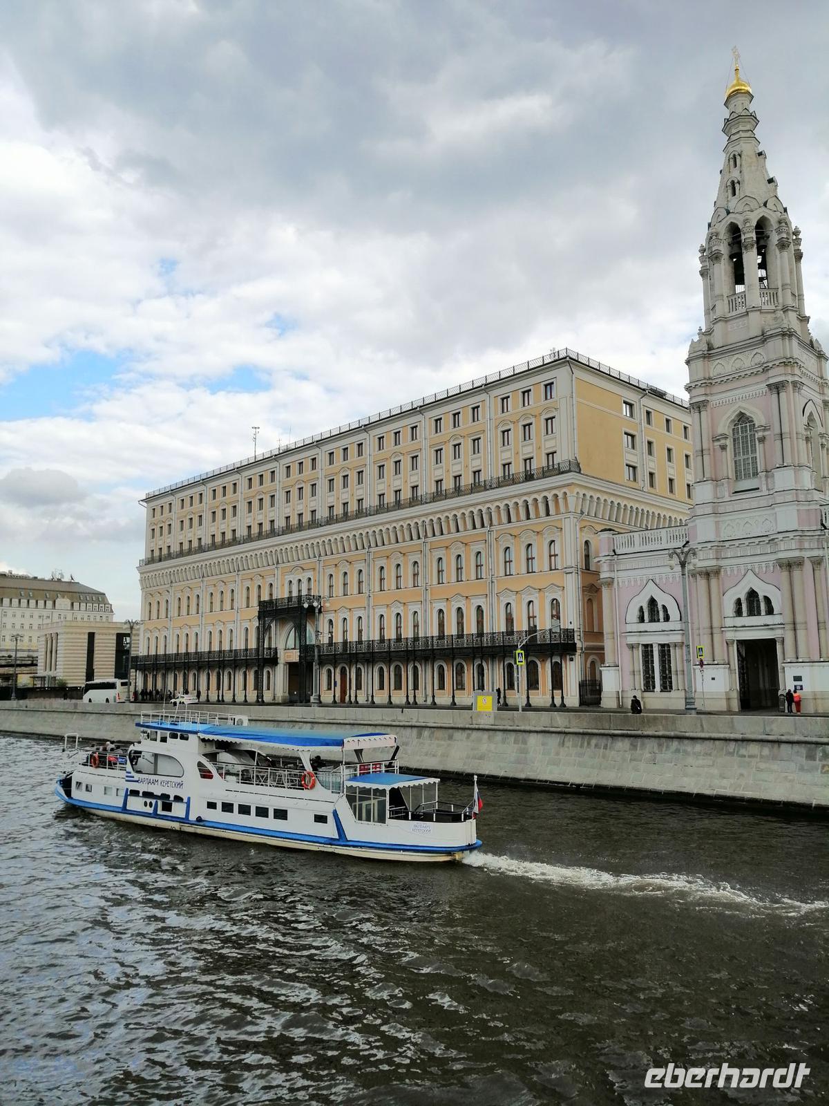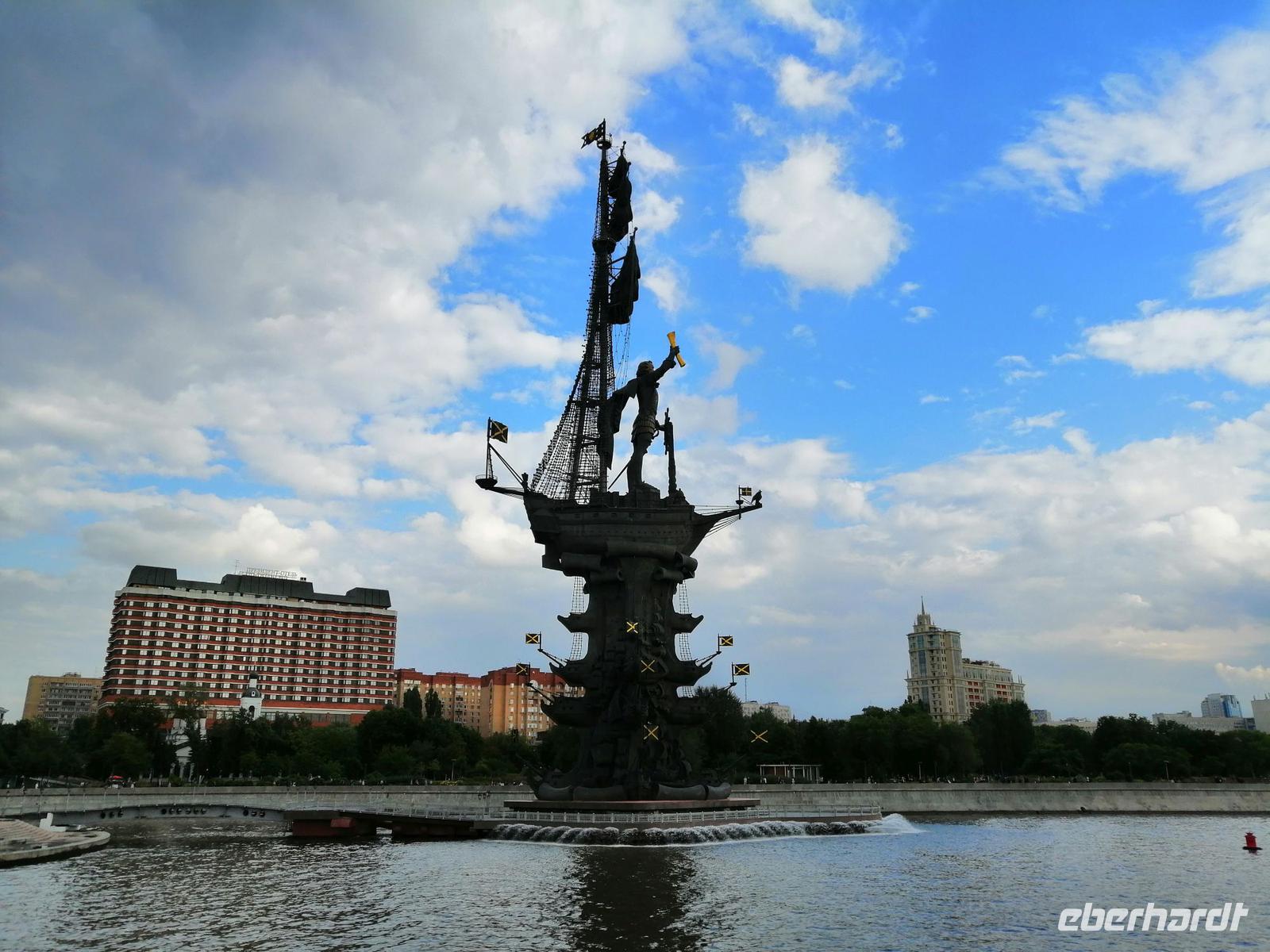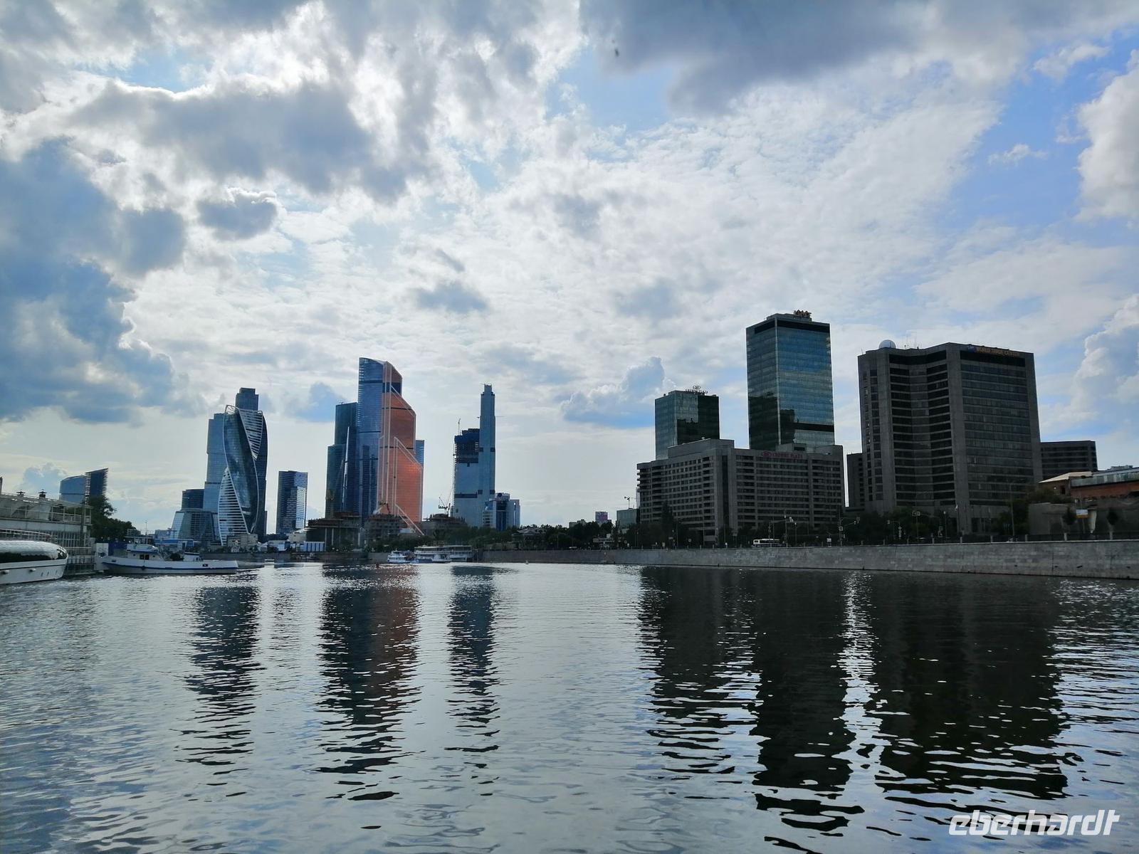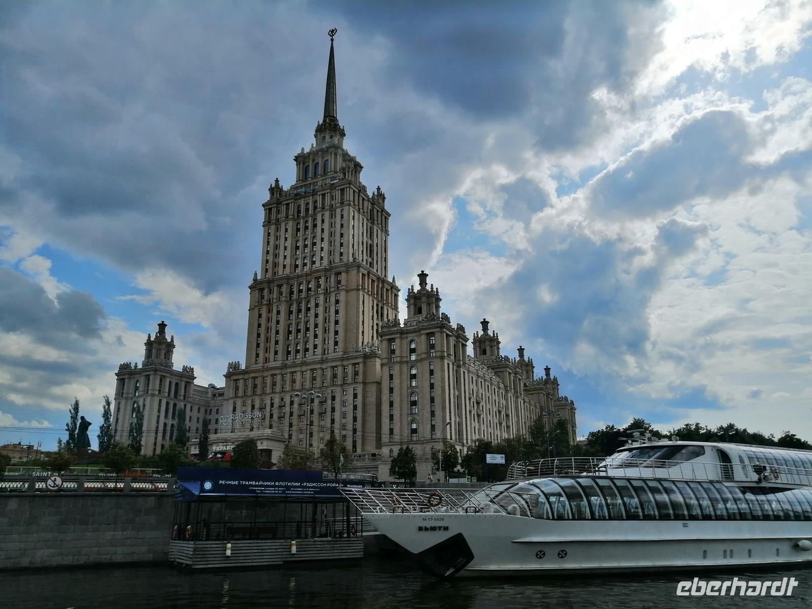 Wir gingen durch den Park zur Uferpromenade, wo sich die Anlegerstellen befanden. Der Fluß Moskwa fließt übrigens auf einer Strecke von 3 km am Park entlang. Die Schifffahrt auf dem Panoramaschiff war sehr komfortabel und angenehm. Nach dem leckeren Mittagessen erzählte uns Valeria über die Gebäude und Sehenswürdigkeiten, die wir links und rechts von uns sahen.