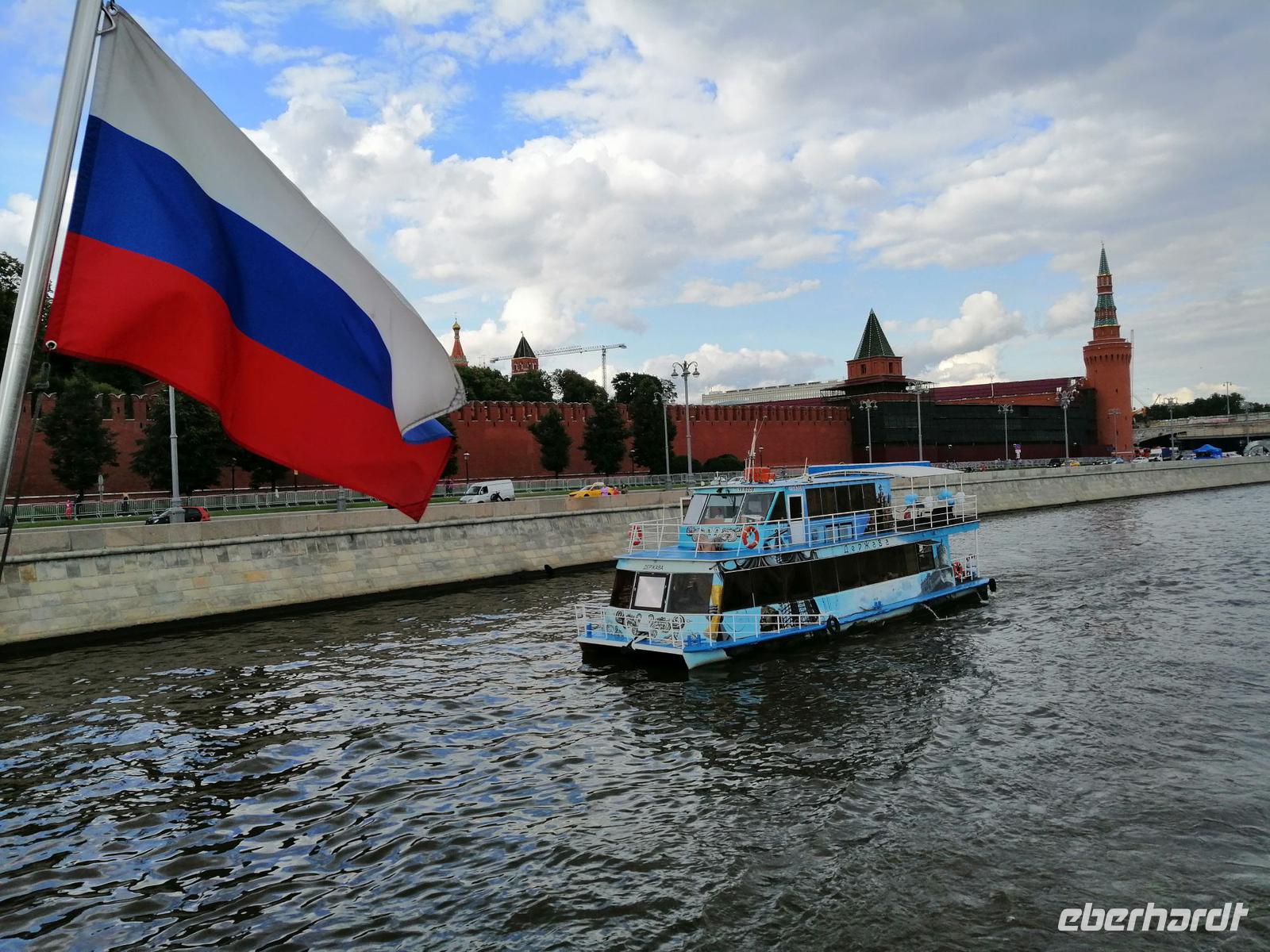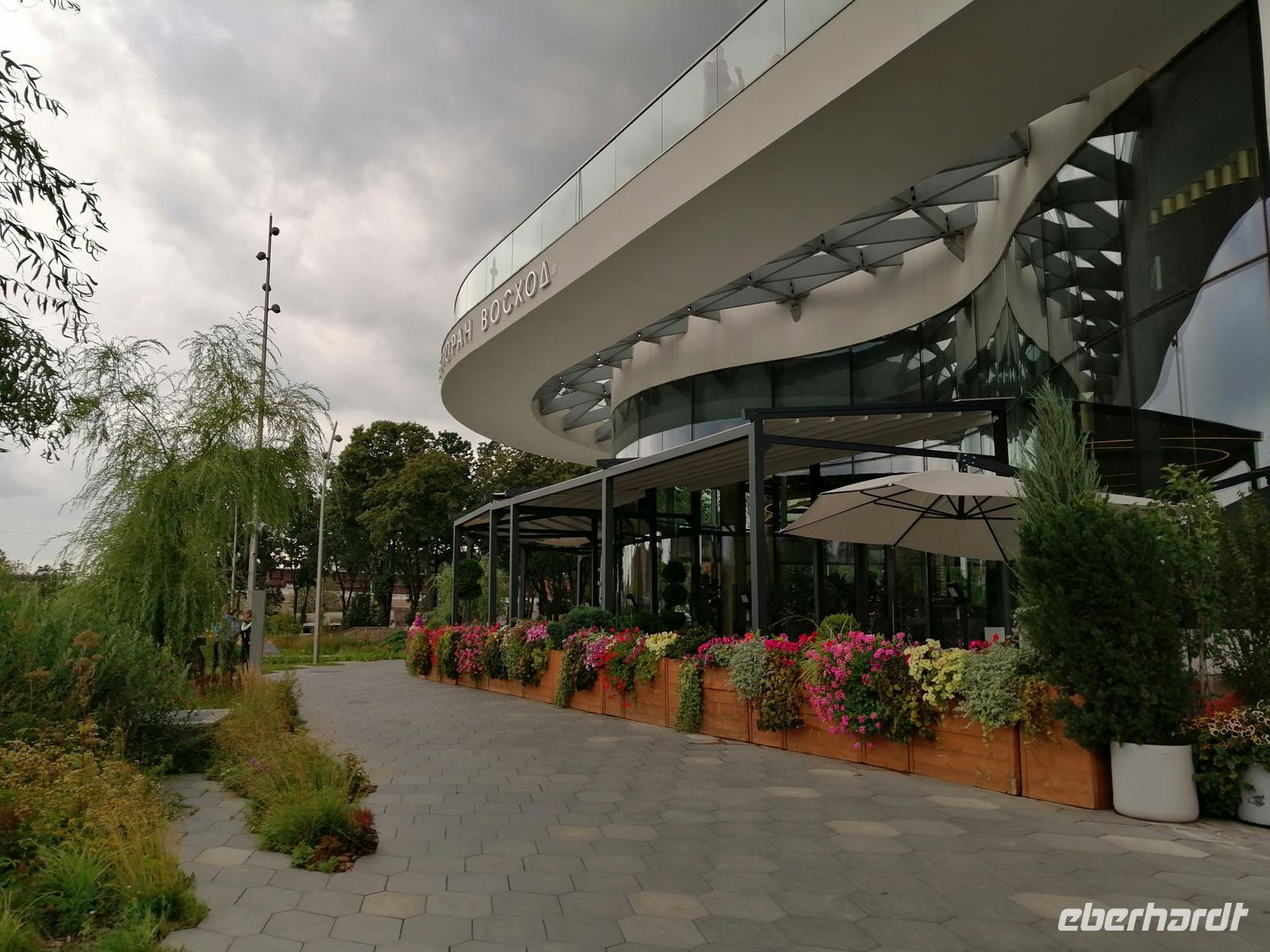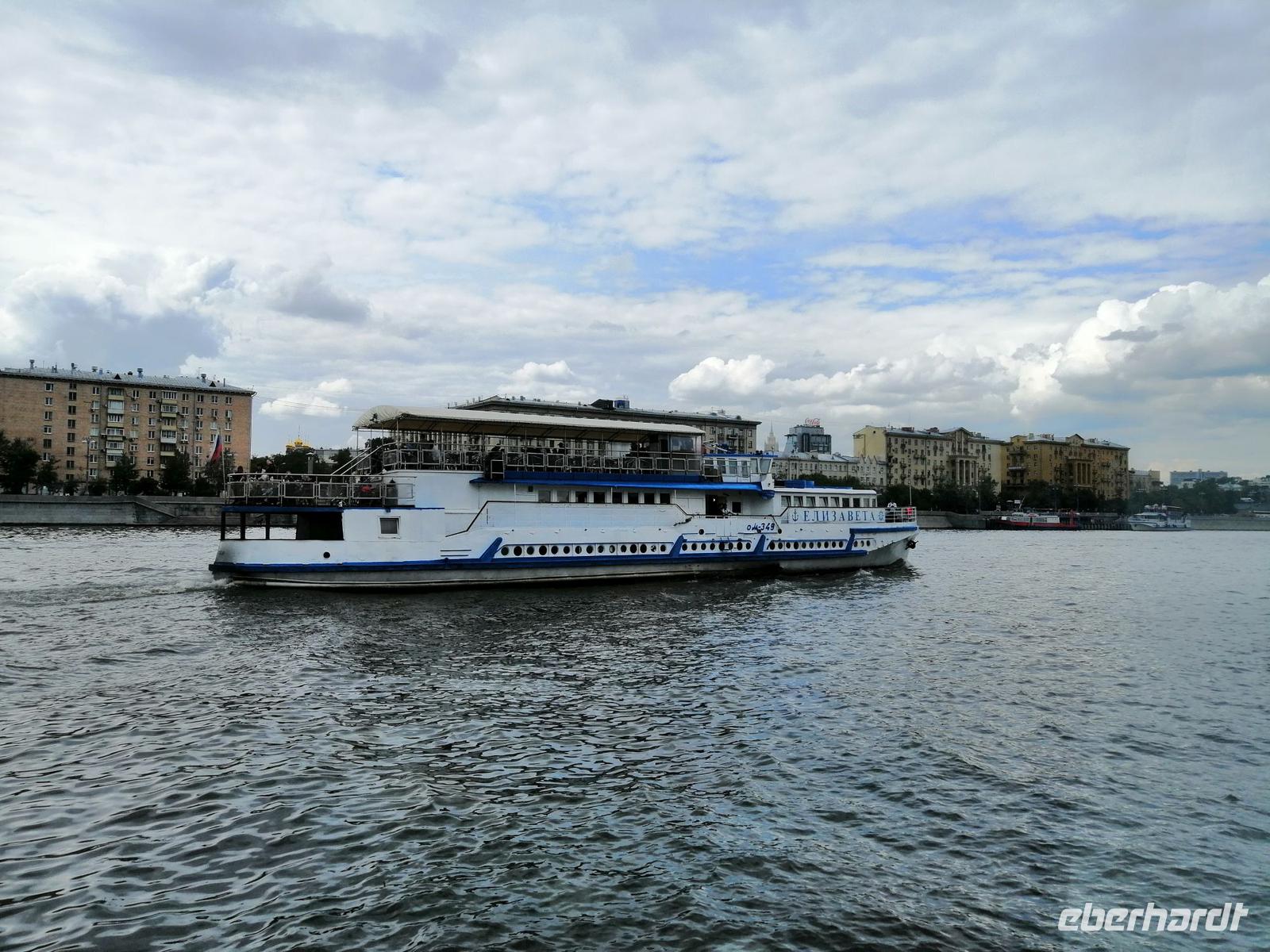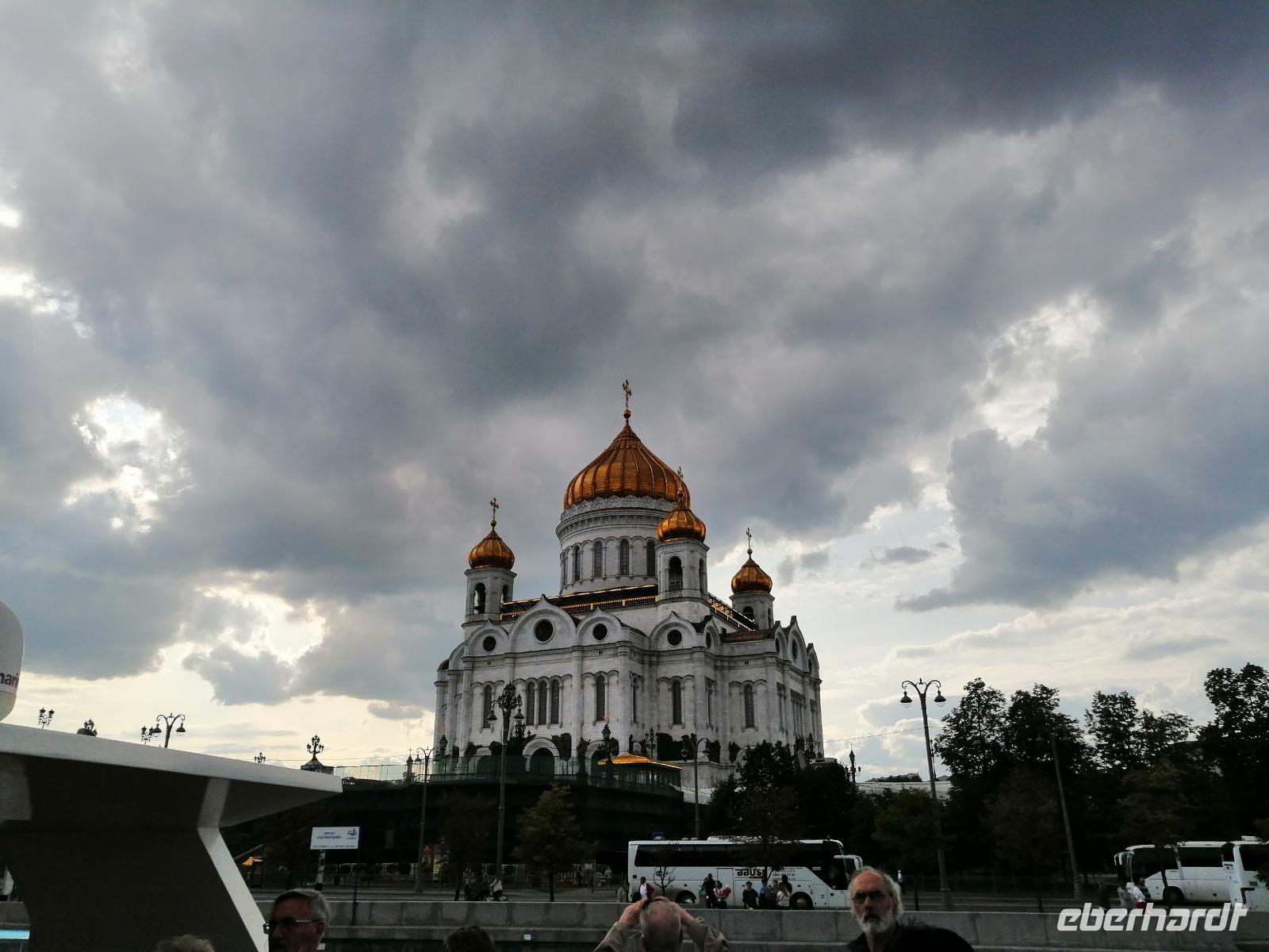 Wir gingen durch den Park zur Uferpromenade, wo sich die Anlegerstellen befanden. Der Fluß Moskwa fließt übrigens auf einer Strecke von 3 km am Park entlang. Die Schifffahrt auf dem Panoramaschiff war sehr komfortabel und angenehm. Nach dem leckeren Mittagessen erzählte uns Valeria über die Gebäude und Sehenswürdigkeiten, die wir links und rechts von uns sahen.
