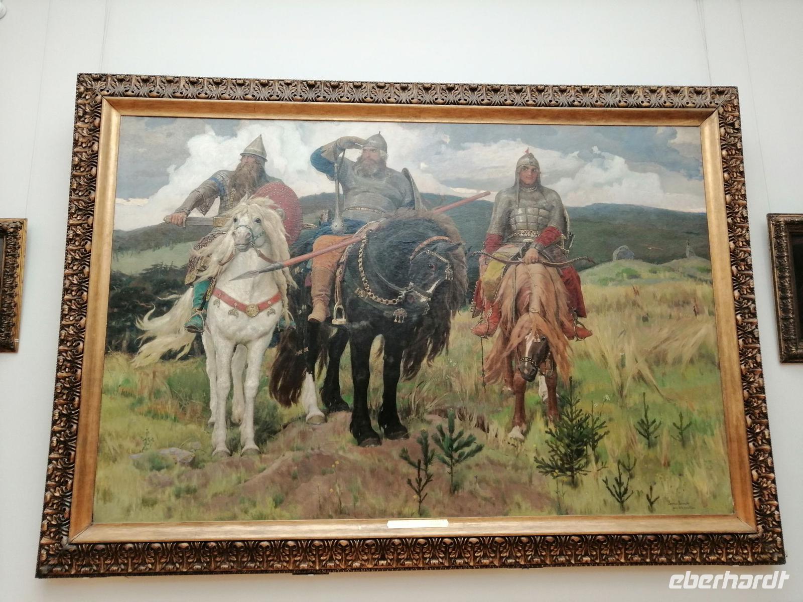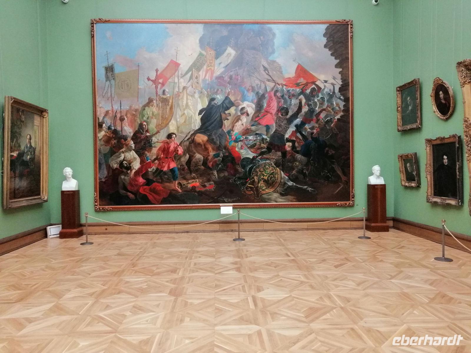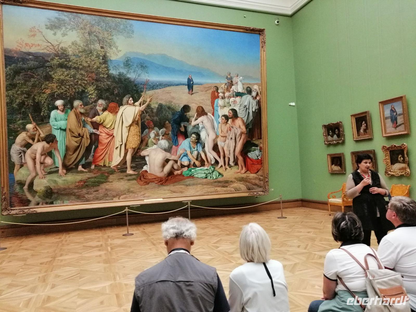 Nach der Schifffahrt fuhr ein Teil unserer Gruppe gleich ins Hotel und die anderen Reisegäste setzten ihre kulturelle Erkundung der russischen Hauptstadt fort: wir fuhren in die Tretjakow-Galerie. Sie liegt in einer kleinen Gasse im Samoskworeschje-Bezirk, unweit des Kremls. 1892 wurde sie als Stadtmuseum gegründet. Doch ihr Begründer, der Moskauer Kaufmann Pawel Tretjakow (1832 - 1898), begann die besten Werke russischer Künstler bereits von 1856 an zu sammeln. Nach 36 Jahren machte Tretjakow seine Kunstsammlung der Stadt Moskau zum Geschenk. Als die Galerie eröffnet wurde, beherbergte sie 1.200 Gemälde und einige hundert Plastiken und Graphiken. Gegenwärtig werden in der Tretjakow-Galerie über 6.000 Bilder, 3.000 Werke der altrussischen Kunst, über 1.000 Plastiken, 30.000 Zeichnungen und Stiche aufbewahrt. Valeria erzählte uns viele Geschichten zu den Bildern: dadurch wurde unsere Führung durch die Ausstellung besonders spannend.