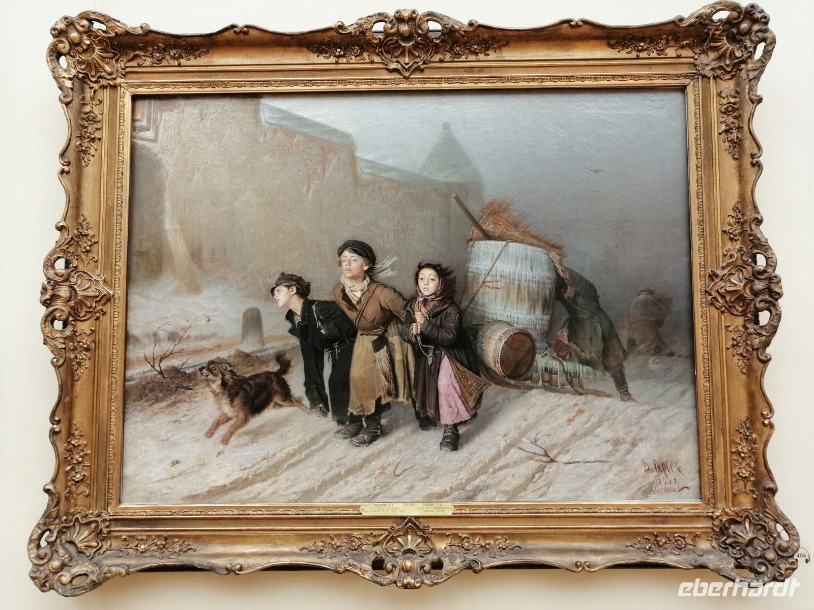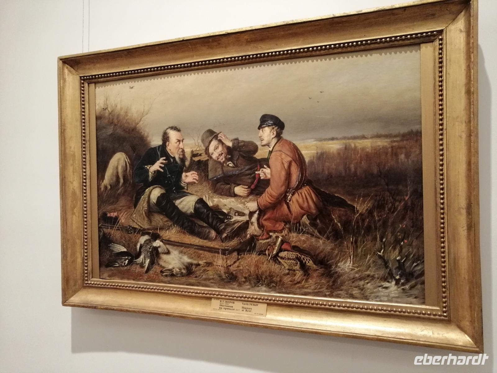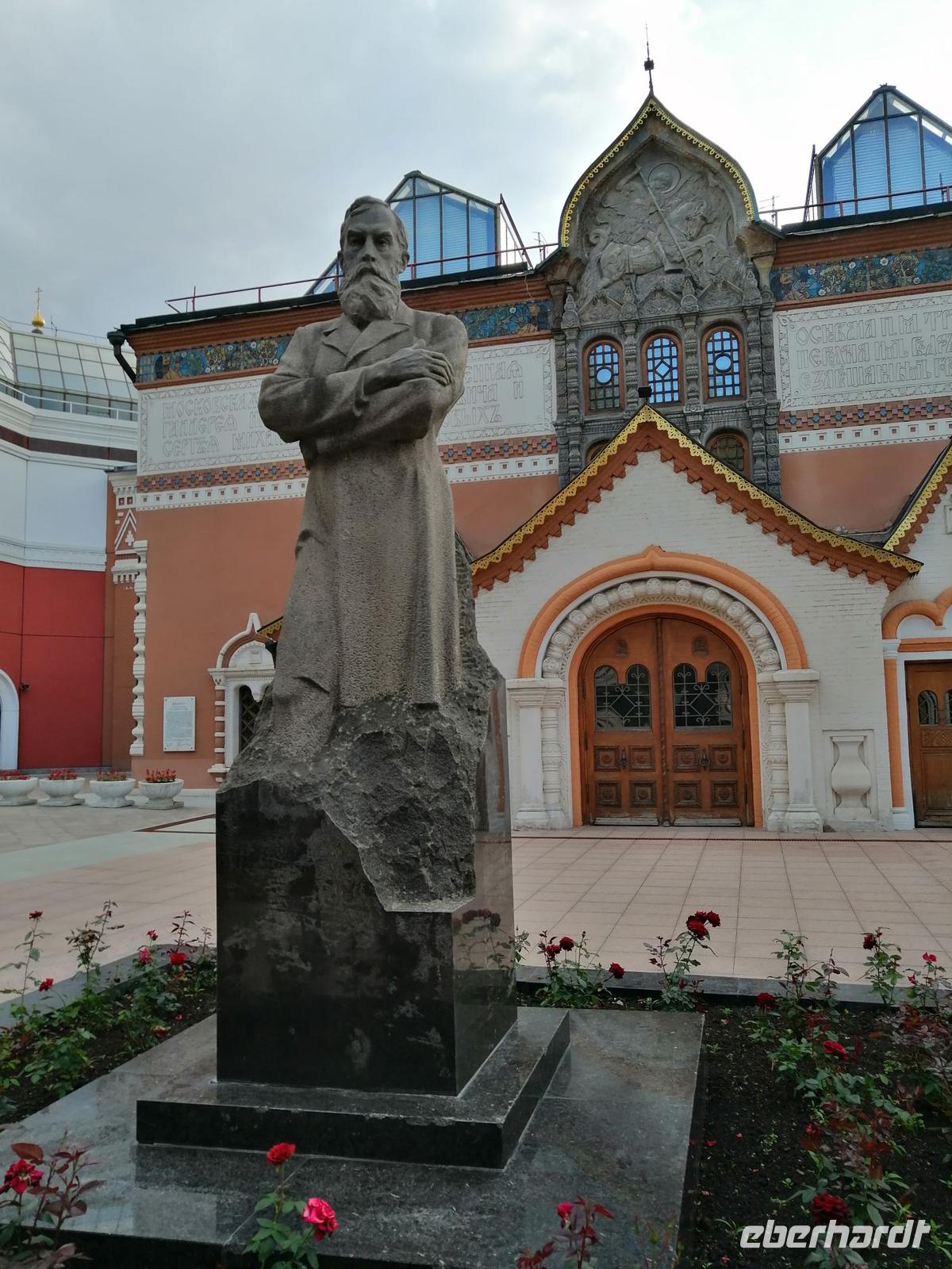 Nach der Schifffahrt fuhr ein Teil unserer Gruppe gleich ins Hotel und die anderen Reisegäste setzten ihre kulturelle Erkundung der russischen Hauptstadt fort: wir fuhren in die Tretjakow-Galerie. Sie liegt in einer kleinen Gasse im Samoskworeschje-Bezirk, unweit des Kremls. 1892 wurde sie als Stadtmuseum gegründet. Doch ihr Begründer, der Moskauer Kaufmann Pawel Tretjakow (1832 - 1898), begann die besten Werke russischer Künstler bereits von 1856 an zu sammeln. Nach 36 Jahren machte Tretjakow seine Kunstsammlung der Stadt Moskau zum Geschenk. Als die Galerie eröffnet wurde, beherbergte sie 1.200 Gemälde und einige hundert Plastiken und Graphiken. Gegenwärtig werden in der Tretjakow-Galerie über 6.000 Bilder, 3.000 Werke der altrussischen Kunst, über 1.000 Plastiken, 30.000 Zeichnungen und Stiche aufbewahrt. Valeria erzählte uns viele Geschichten zu den Bildern: dadurch wurde unsere Führung durch die Ausstellung besonders spannend.
