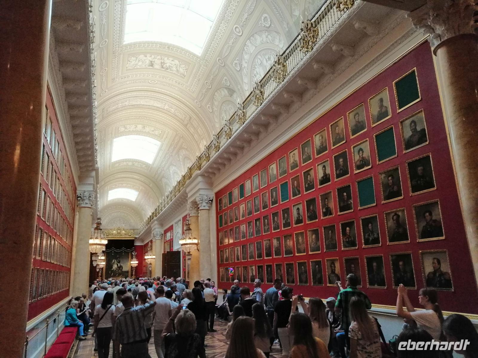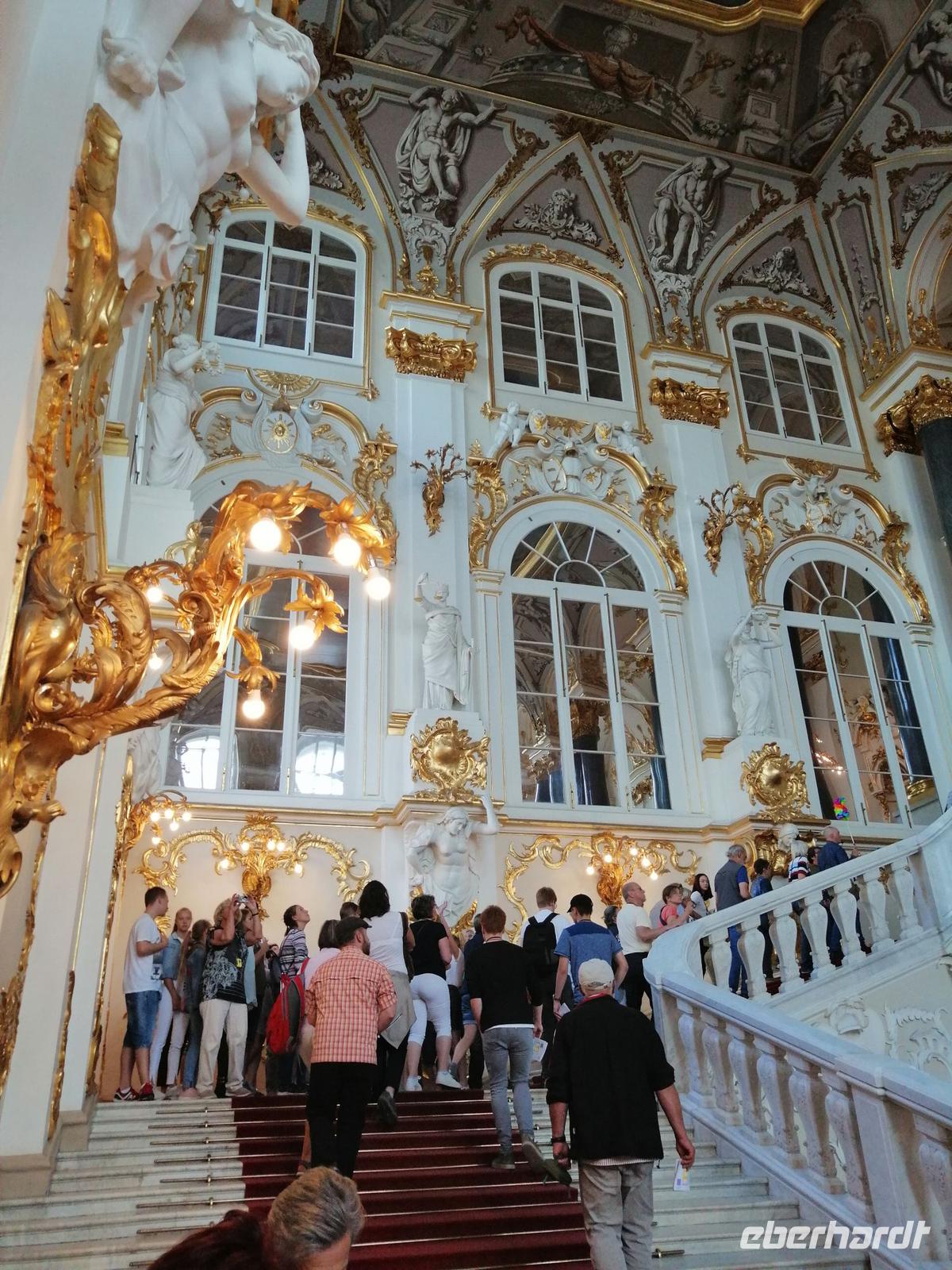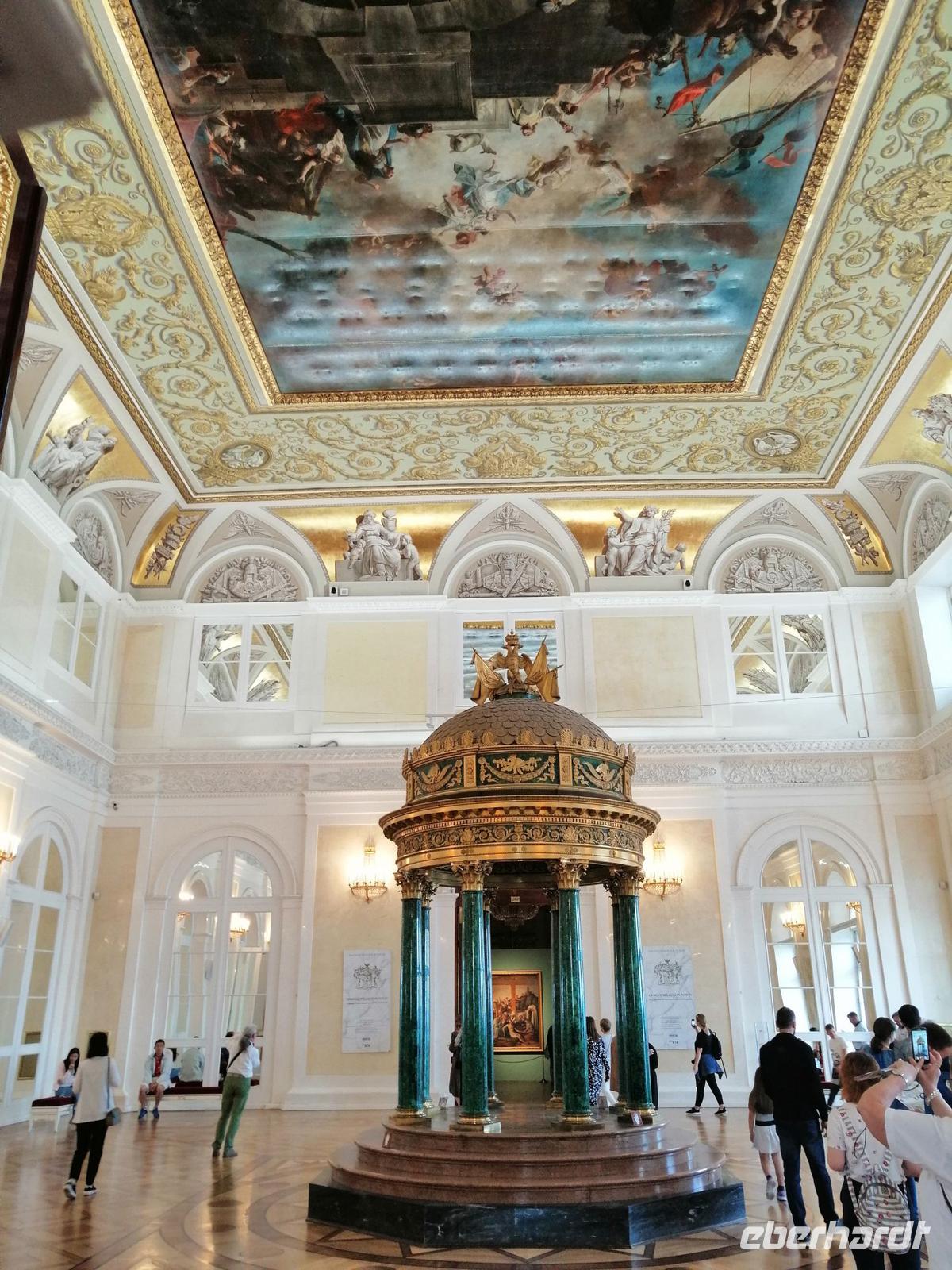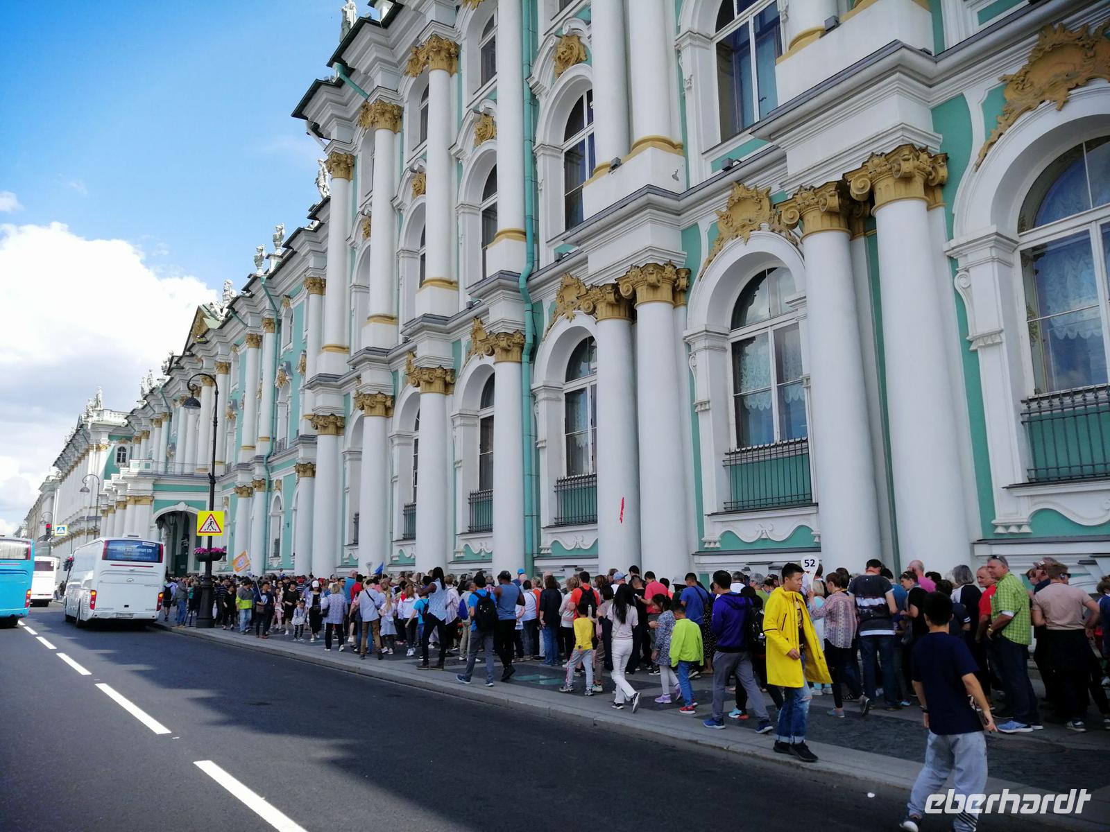 Danach gingen wir in die Eremitage, die vom Architekten Domenico Trezzini entworfen wurde. Die Eremitage ist ein echtes Wahrzeichen von Sankt Petersburg und ist durch die Touristen aus der ganzen Welt sehr beliebt. Eine große lange Warteschlange stand vor dem Eingang. Das Warten dauerte aber nicht lange und der Besuch lohnt sich auf jeden Fall. Besonders interessant wurde unsere Führung durch die Erzählungen von Eugen zu den ausgestellten Gemälden. Natürlich hat uns die Zeit nicht gereicht, alle wunderschöne Bilder anzuschauen aber nach ca. zwei Stunden Besichtigung bekamen wir einen guten Eindruck über die Schätze von Katharina die Große, die den Grundstock für diese Sammlung legte.