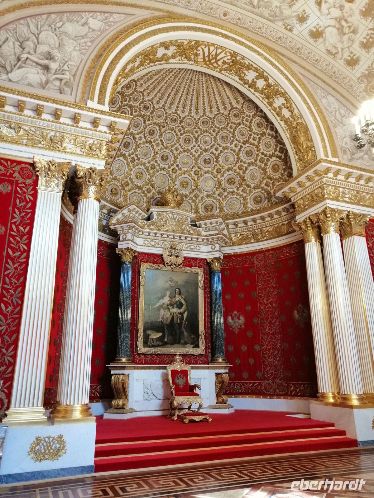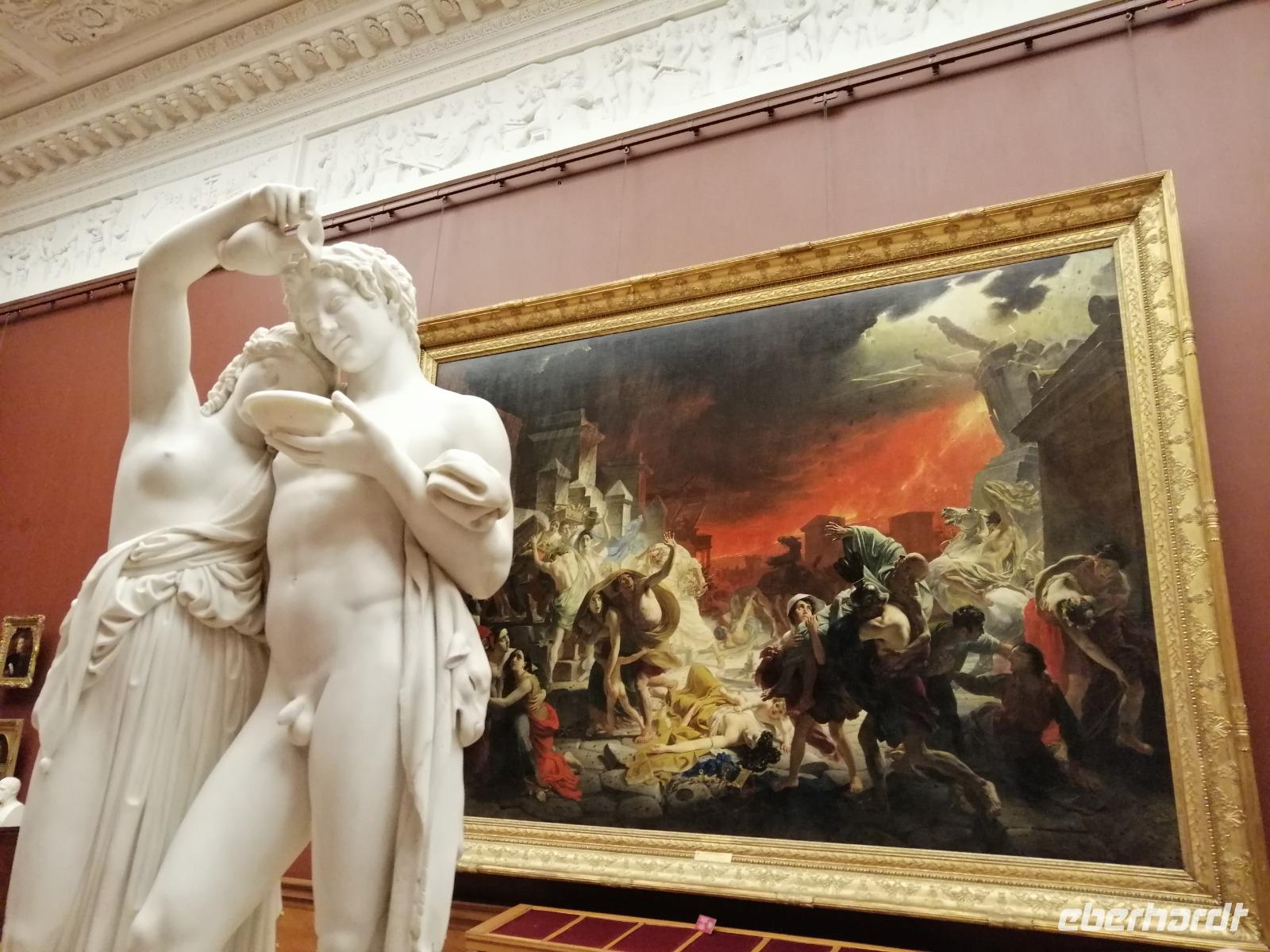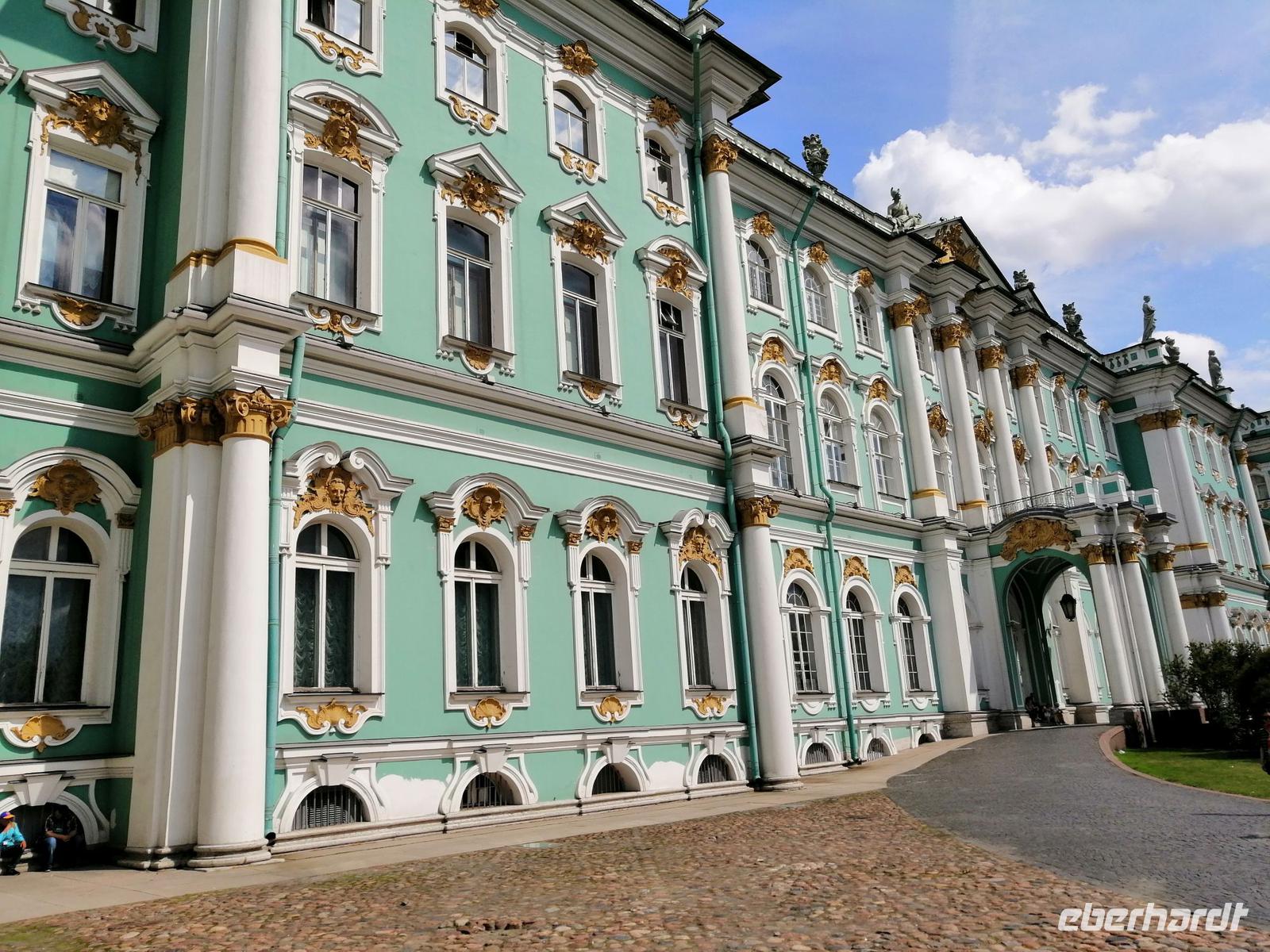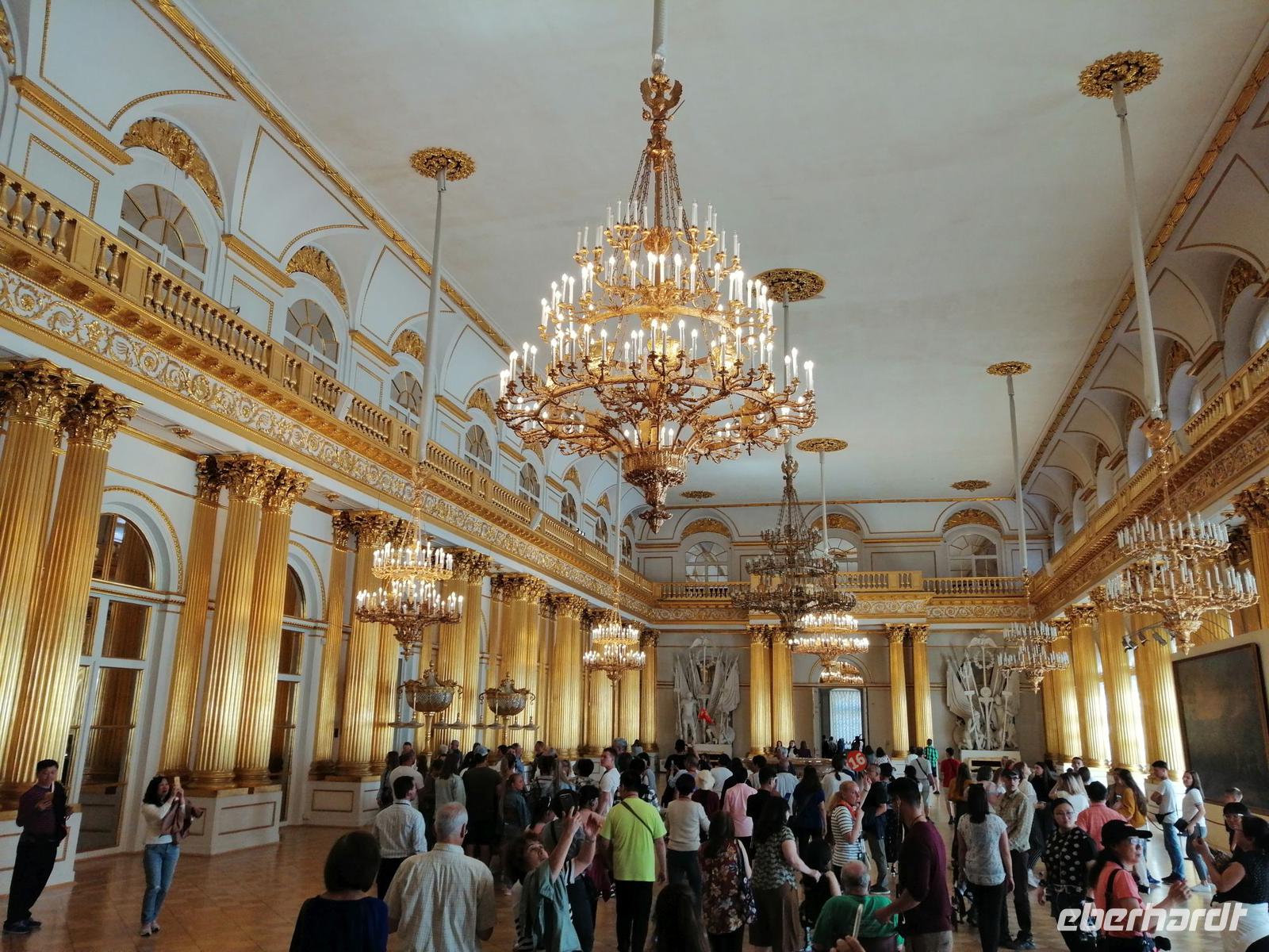 Danach gingen wir in die Eremitage, die vom Architekten Domenico Trezzini entworfen wurde. Die Eremitage ist ein echtes Wahrzeichen von Sankt Petersburg und ist durch die Touristen aus der ganzen Welt sehr beliebt. Eine große lange Warteschlange stand vor dem Eingang. Das Warten dauerte aber nicht lange und der Besuch lohnt sich auf jeden Fall. Besonders interessant wurde unsere Führung durch die Erzählungen von Eugen zu den ausgestellten Gemälden. Natürlich hat uns die Zeit nicht gereicht, alle wunderschöne Bilder anzuschauen aber nach ca. zwei Stunden Besichtigung bekamen wir einen guten Eindruck über die Schätze von Katharina die Große, die den Grundstock für diese Sammlung legte.