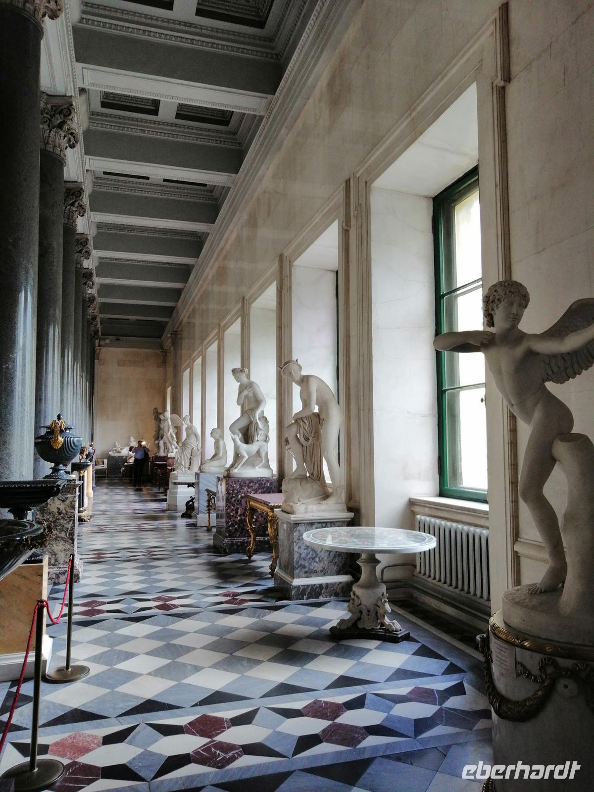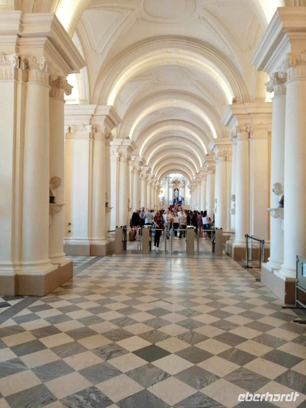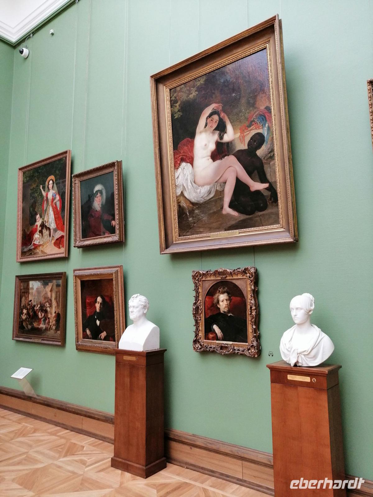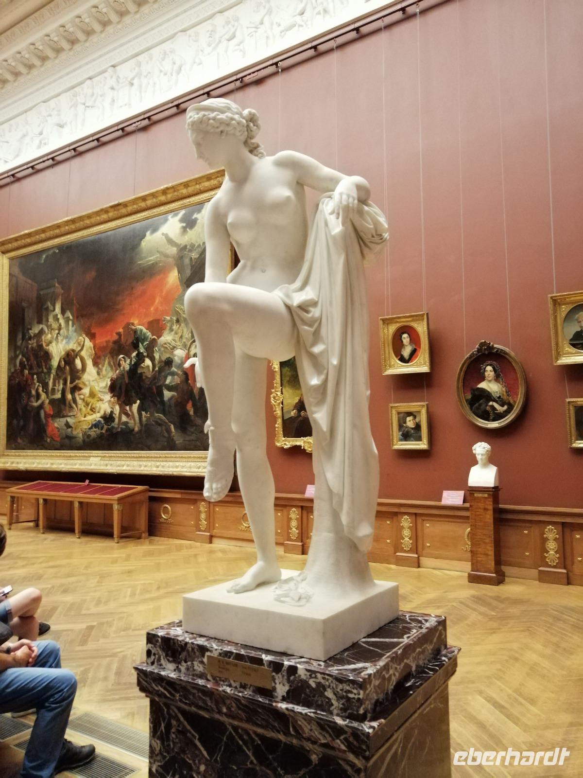 Danach gingen wir in die Eremitage, die vom Architekten Domenico Trezzini entworfen wurde. Die Eremitage ist ein echtes Wahrzeichen von Sankt Petersburg und ist durch die Touristen aus der ganzen Welt sehr beliebt. Eine große lange Warteschlange stand vor dem Eingang. Das Warten dauerte aber nicht lange und der Besuch lohnt sich auf jeden Fall. Besonders interessant wurde unsere Führung durch die Erzählungen von Eugen zu den ausgestellten Gemälden. Natürlich hat uns die Zeit nicht gereicht, alle wunderschöne Bilder anzuschauen aber nach ca. zwei Stunden Besichtigung bekamen wir einen guten Eindruck über die Schätze von Katharina die Große, die den Grundstock für diese Sammlung legte.