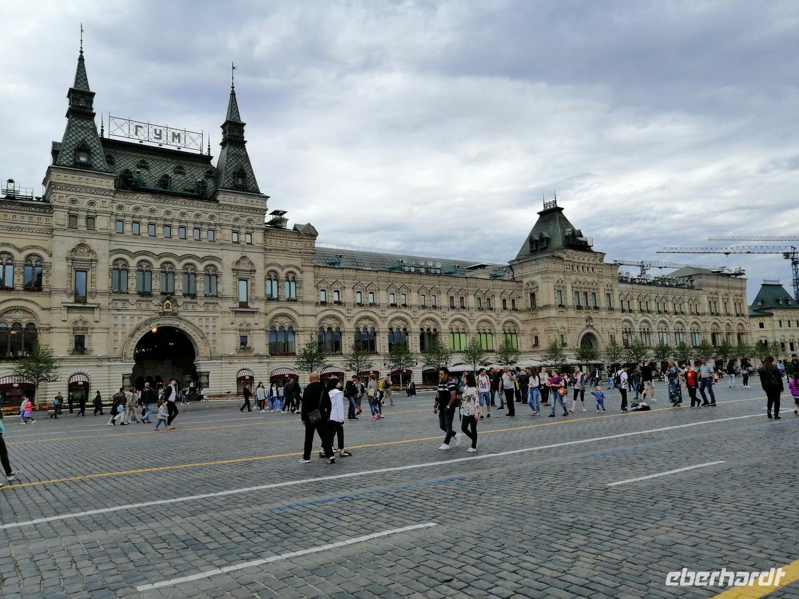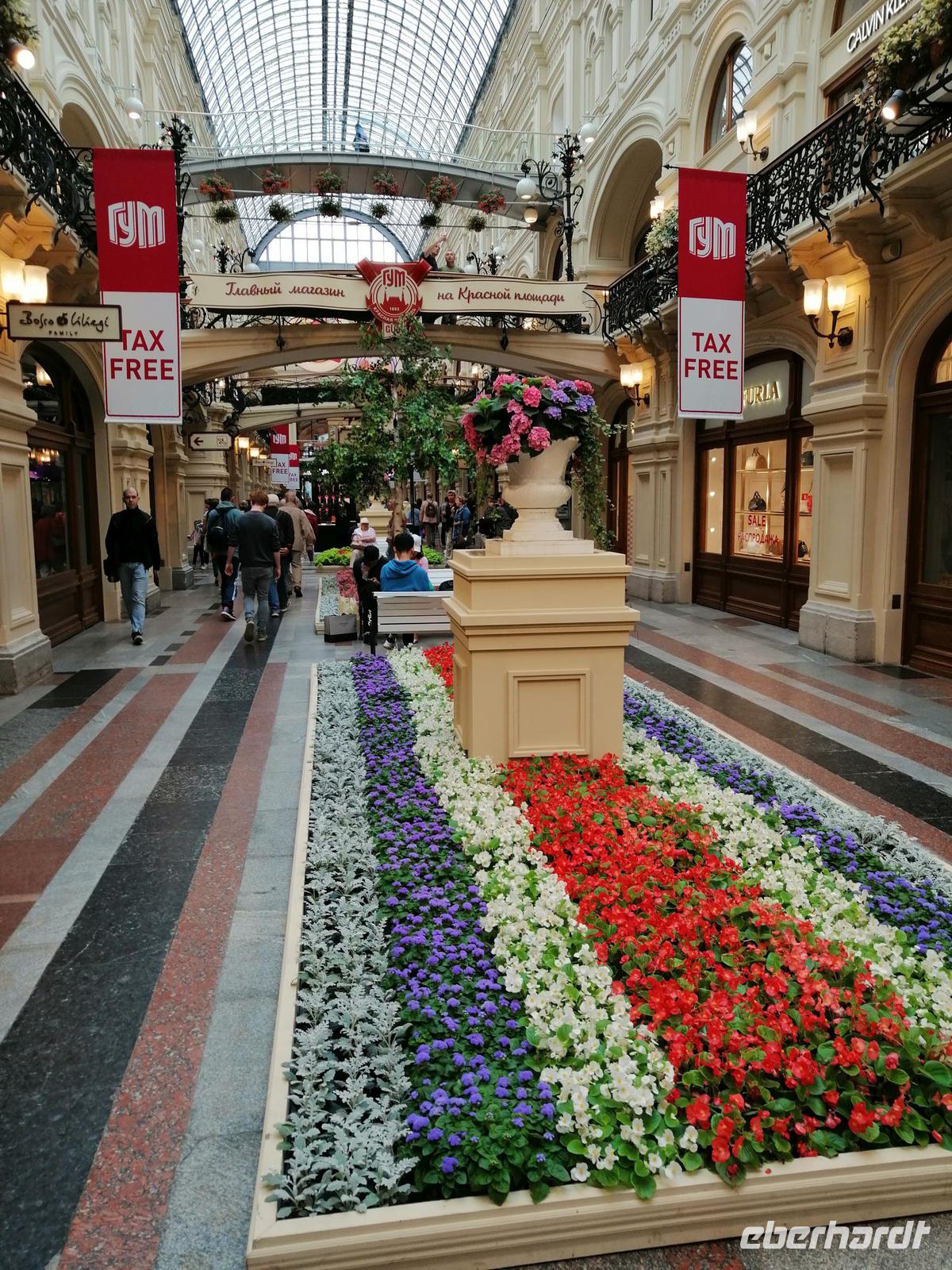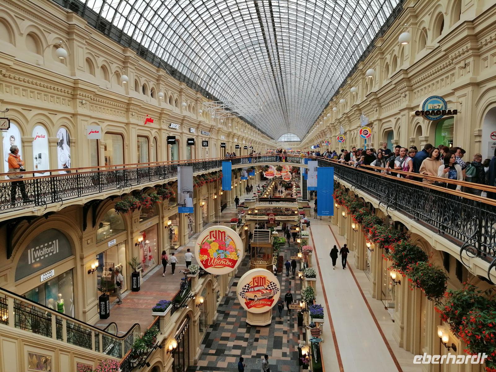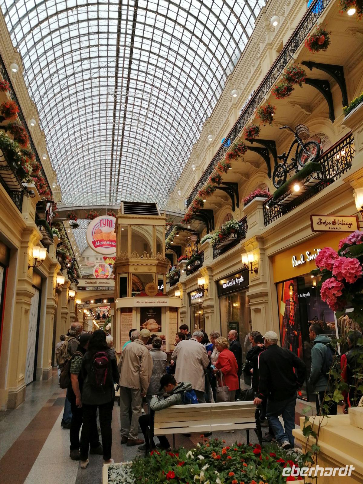 Anschließend besichtigten wir das Kaufhaus GUM: das älteste Kaufhaus Moskaus. Das Wort GUM steht für staatliches Universal-Geschäft. Das einstöckige Gebäude mit spiegelnden Schaufenstern befindet sich gegenüber der Kremlmauer und erstreckt sich über den ganzen Roten Platz. Dieses Gebäude, die ehemaligen Oberen Handelsreihen, wurde 1890-1893 nach einem Entwurf von Architekt Alexander Pomeranzew erbaut. Vor der Revolution befanden sich hier über 200 kleine Läden. 1953 wurde das Gebäude völlig rekonstruiert. Die Gesamtlänge der Verkaufsstände beträgt 2,5 km, die Gesamtlänge der Speicherregale 5 km.