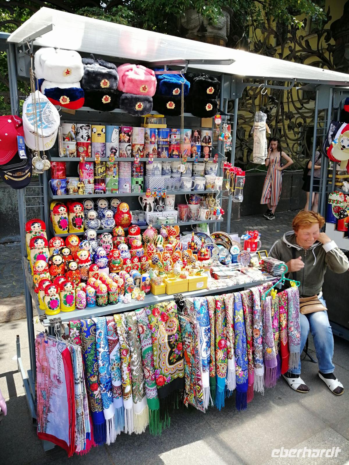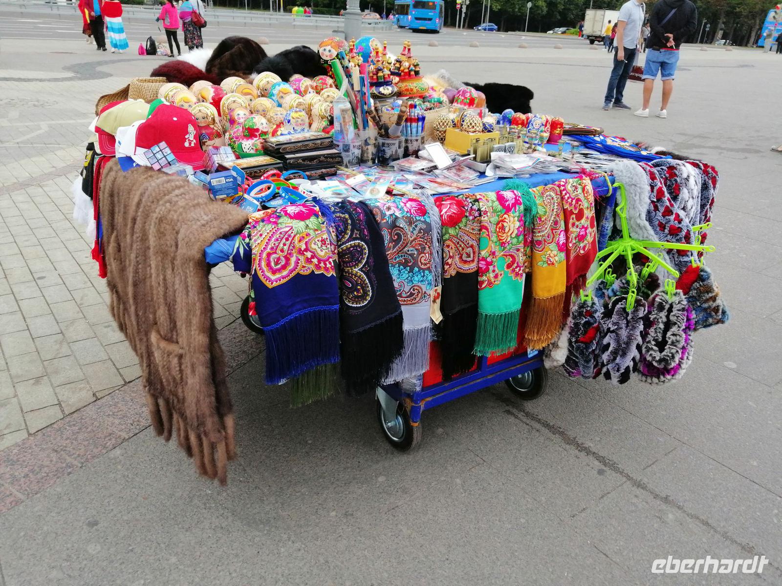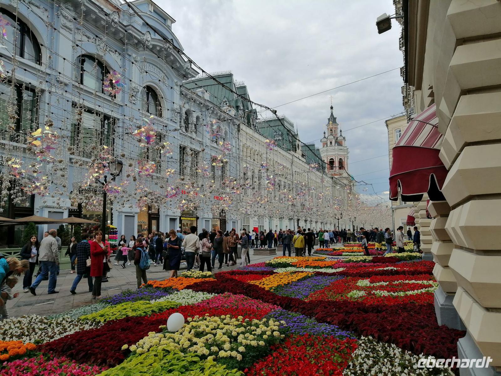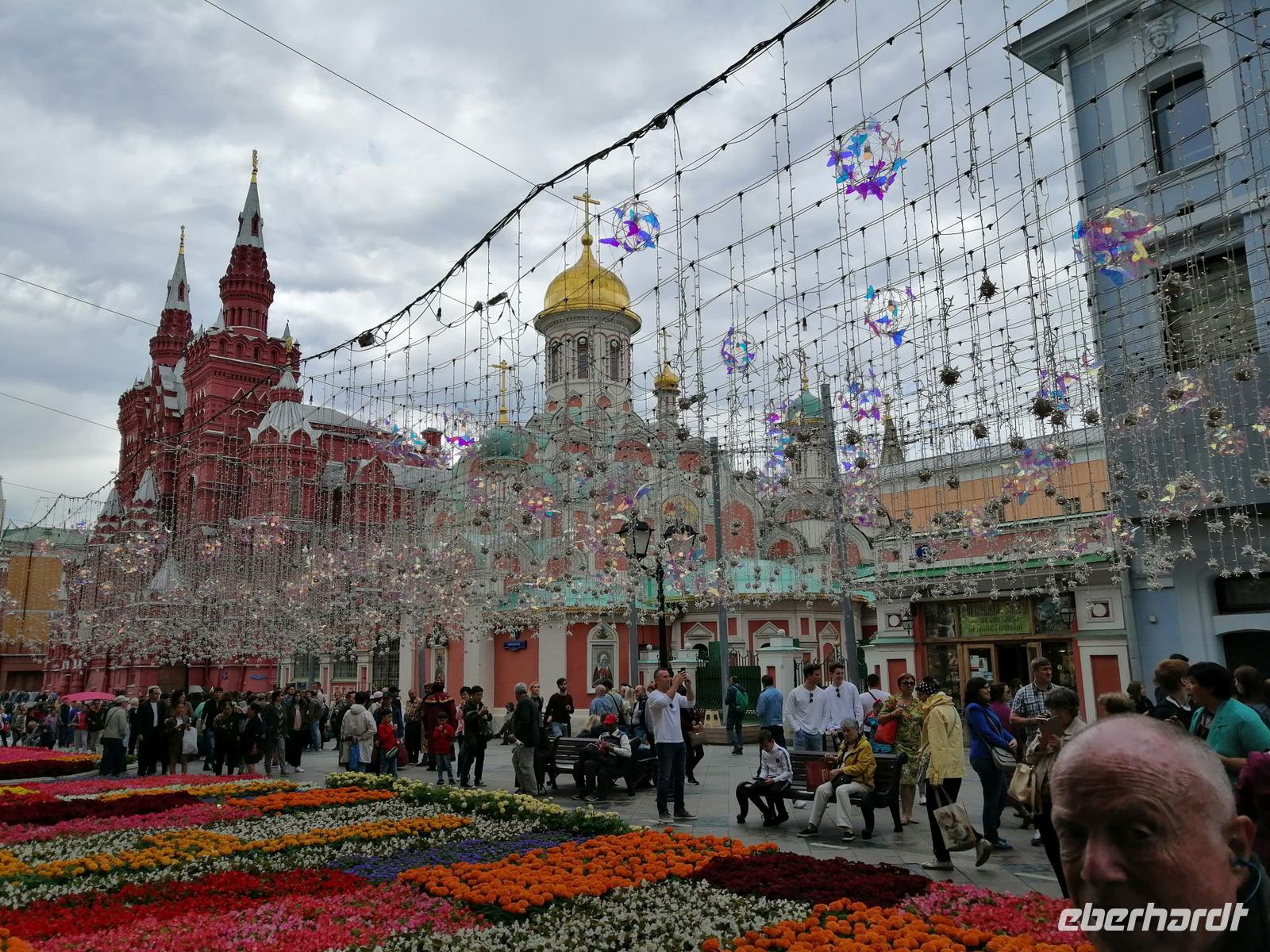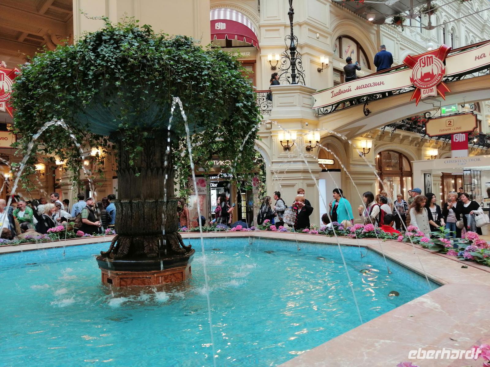 Anschließend besichtigten wir das Kaufhaus GUM: das älteste Kaufhaus Moskaus. Das Wort GUM steht für staatliches Universal-Geschäft. Das einstöckige Gebäude mit spiegelnden Schaufenstern befindet sich gegenüber der Kremlmauer und erstreckt sich über den ganzen Roten Platz. Dieses Gebäude, die ehemaligen Oberen Handelsreihen, wurde 1890-1893 nach einem Entwurf von Architekt Alexander Pomeranzew erbaut. Vor der Revolution befanden sich hier über 200 kleine Läden. 1953 wurde das Gebäude völlig rekonstruiert. Die Gesamtlänge der Verkaufsstände beträgt 2,5 km, die Gesamtlänge der Speicherregale 5 km.