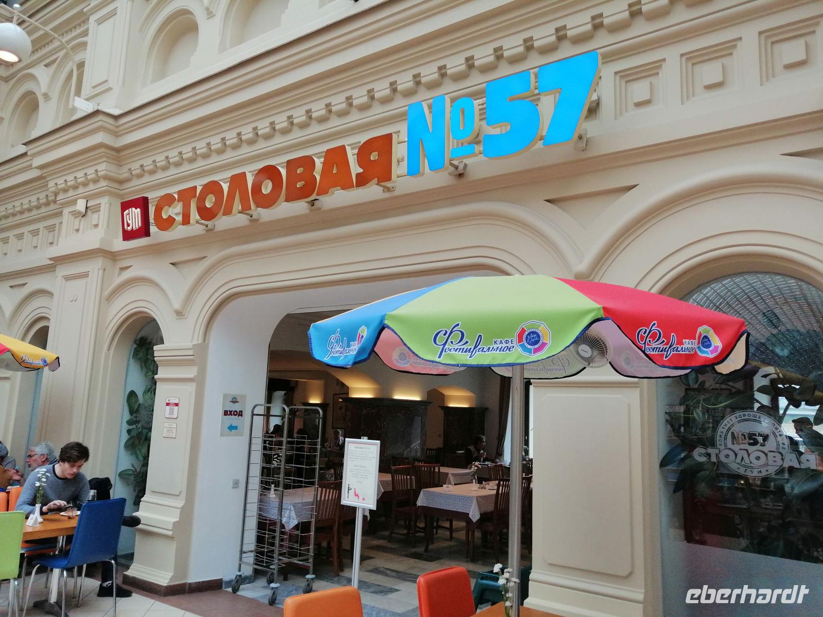 Ganz oben in GUM, im Café Stolovaja gab es eine Überraschung: Kaffee und Tee mit leckeren Pirogen! Anschließend besichtigten wir den Roten Platz und Valeria erzählte uns über Sehenswürdigkeiten ringsum: das Lenin-Mausoleum, das Historische Museum, Kremlmauer u.v.m.