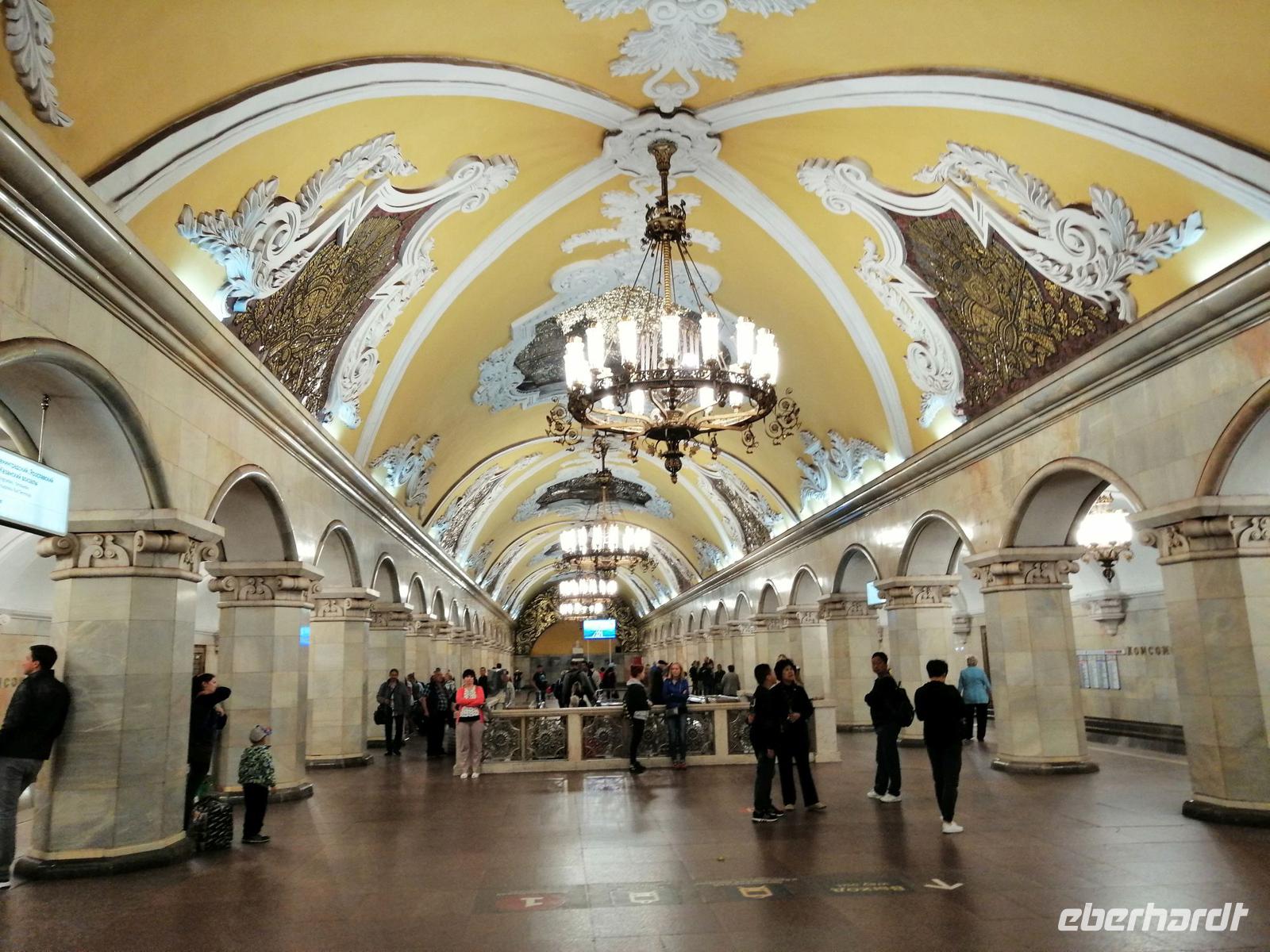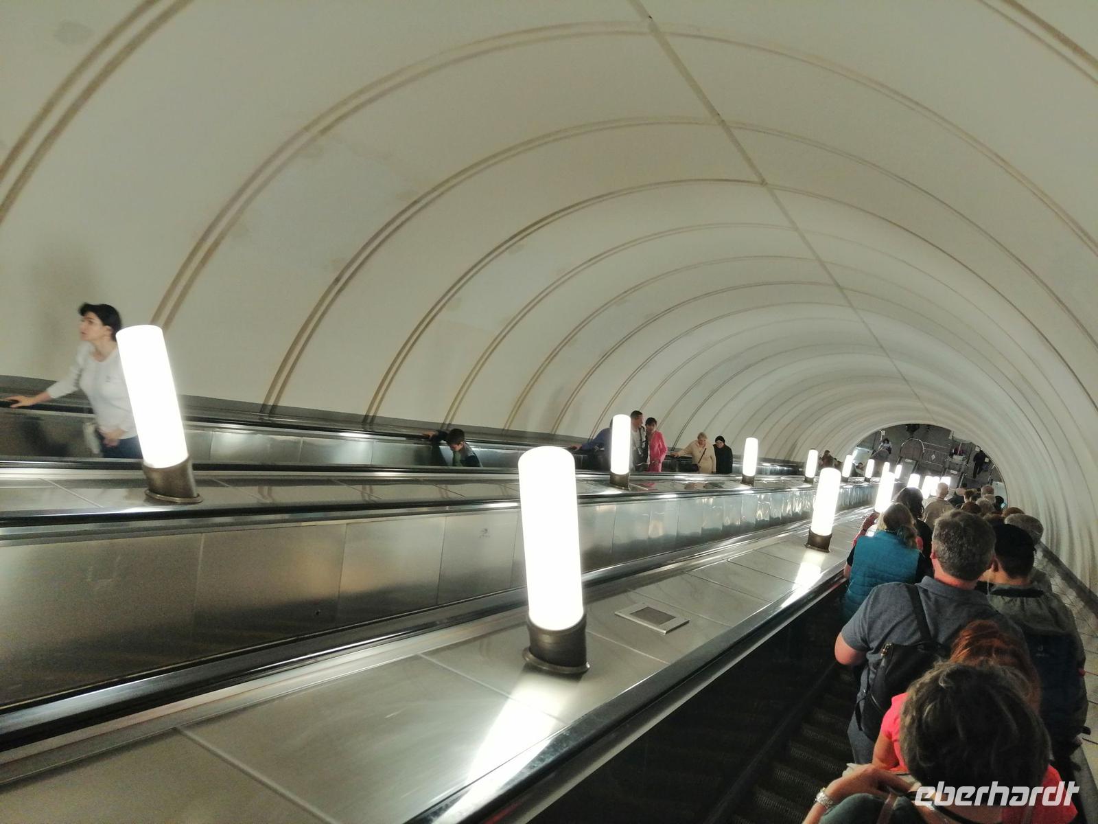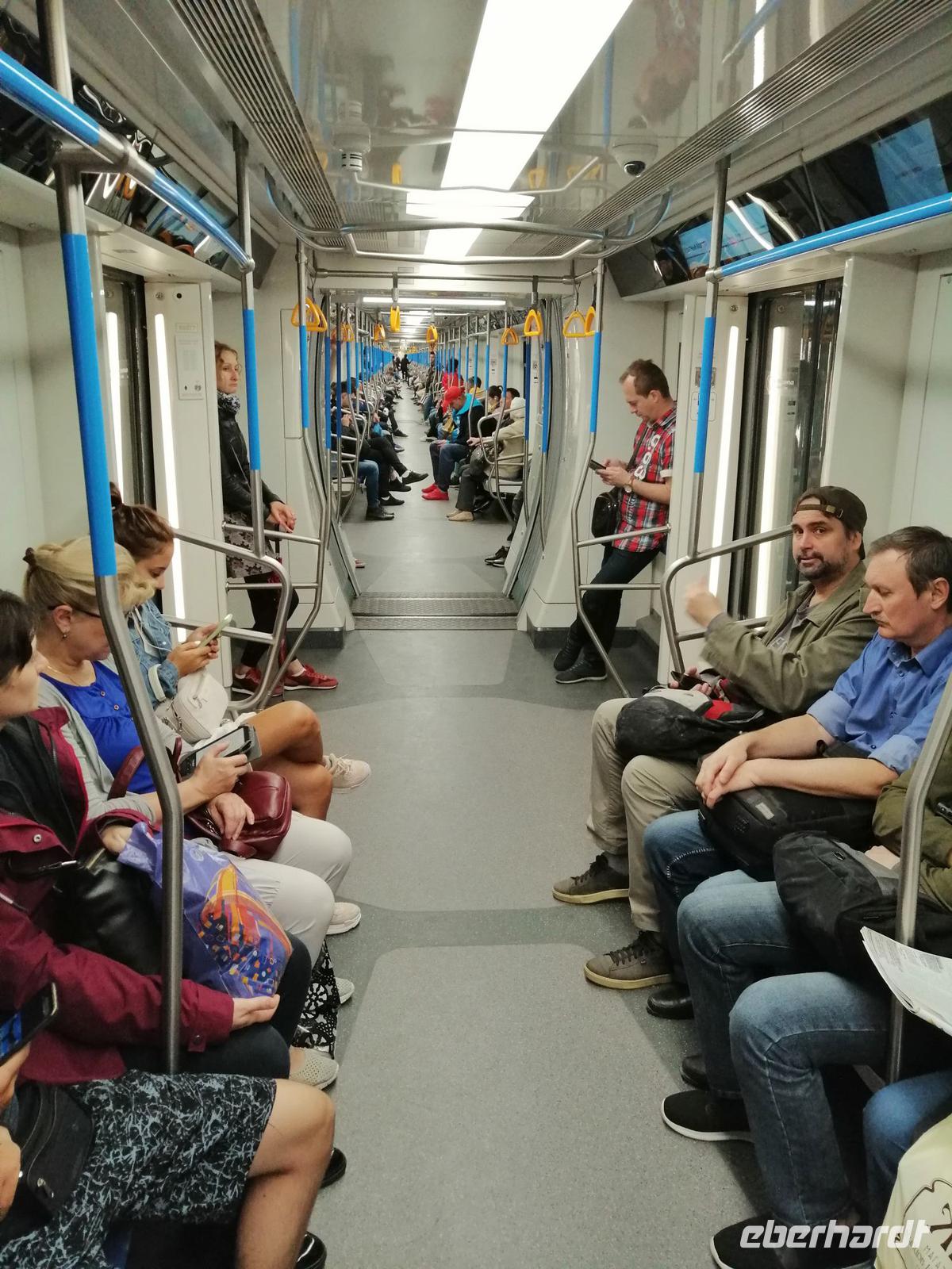 Am Flughafen Domodedowo (Ankunft gegen 15:30 Uhr) wartete auf uns schon unsere nette Reiseleiterin Valeria. Da unser Bus leider eine Panne hatte, entschieden wir uns spontan mit einer S-Bahn (Aeroexpress) vom Flughafen ins Stadtzentrum zu fahren. Die Fahrt war sehr komfortabel: alle Moskauer Flughäfen sind per Aeroexpress sehr bequem innerhalb von 35 bis 40 Minuten erreichbar. Die Fahrt kostet ca. 7 EUR. Am Pawelezkij Bahnhof angekommen, setzten wir unsere Fahrt mit öffentlichen Verkehrsmitteln fort: nun ging es zur berühmten Moskauer U-Bahn. An der Stelle möchte ich mich bei allen Reisegästen für Ihr Verständnis und Ihre Disziplin bedanken und die Unannehmlichkeiten, die Ihnen dadurch entstanden sind zu entschuldigen!