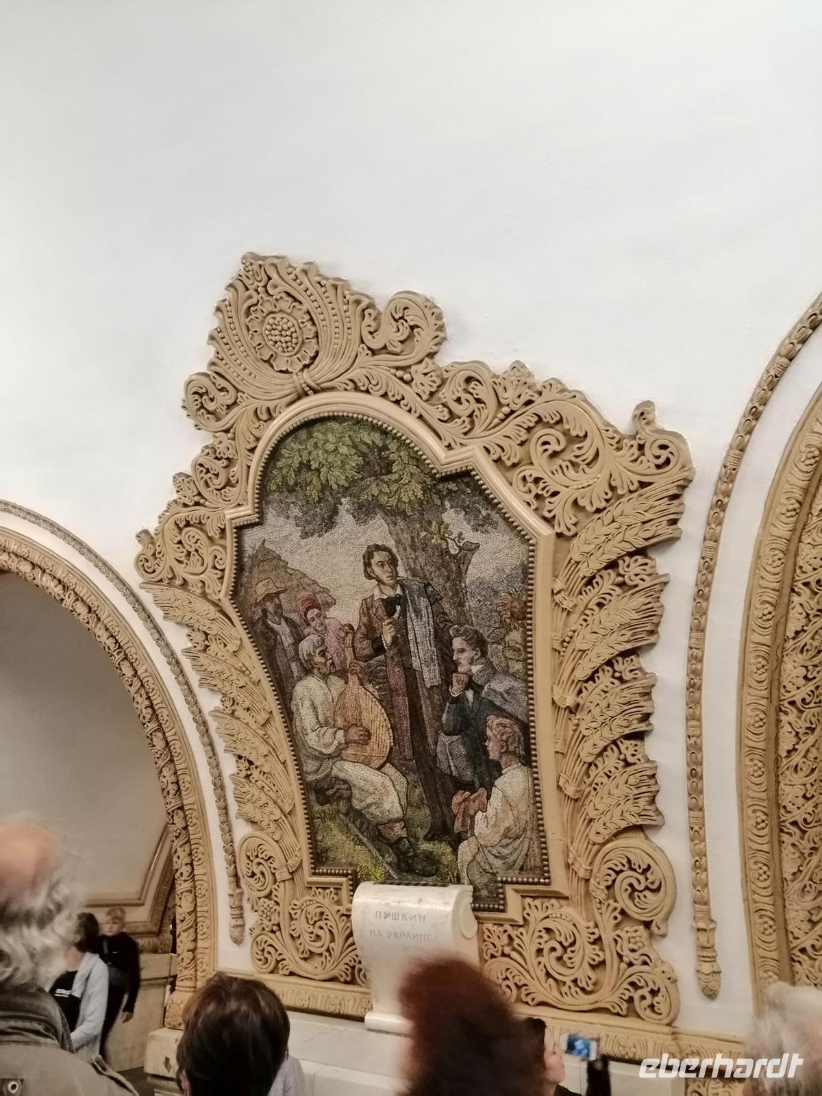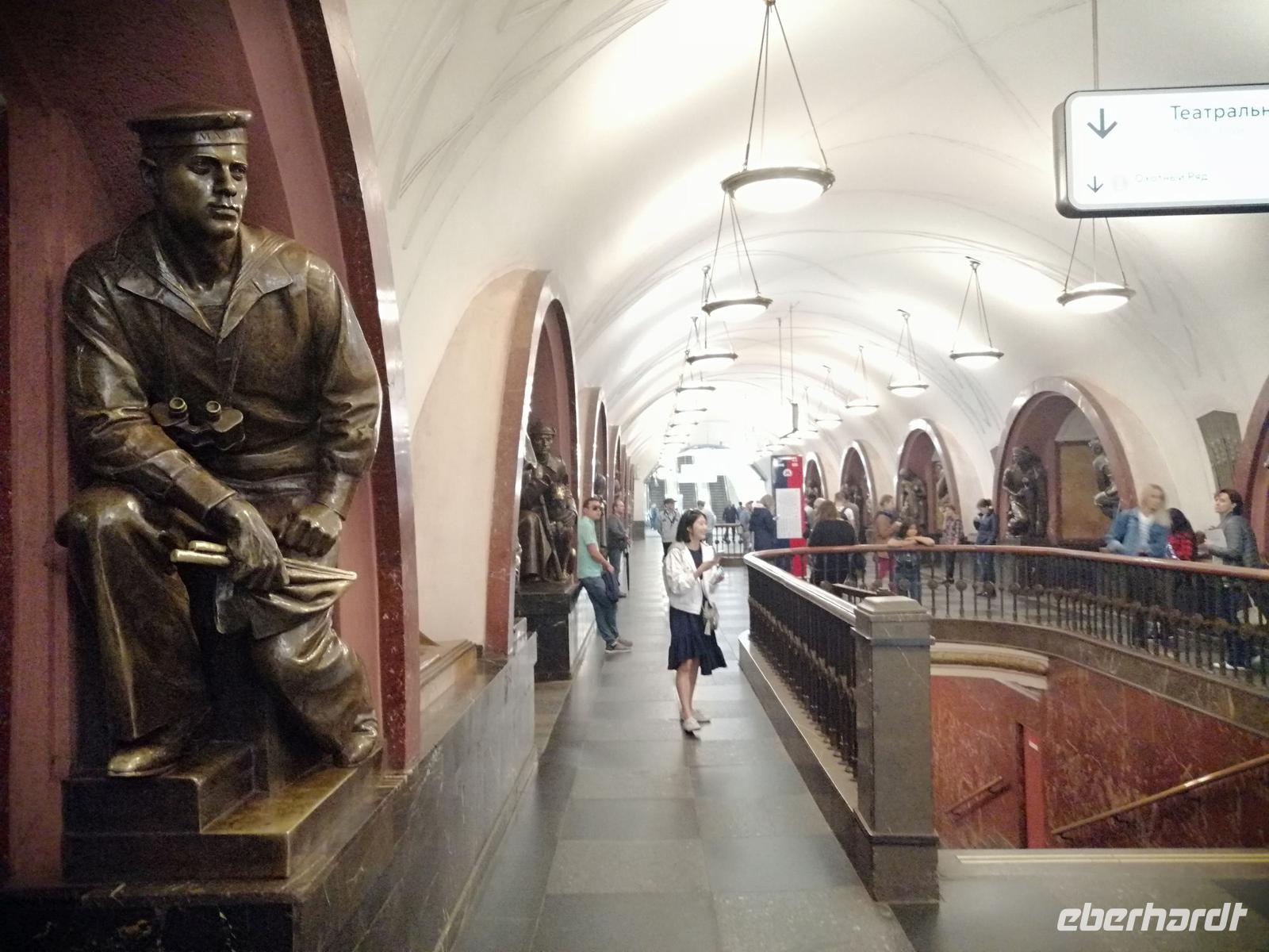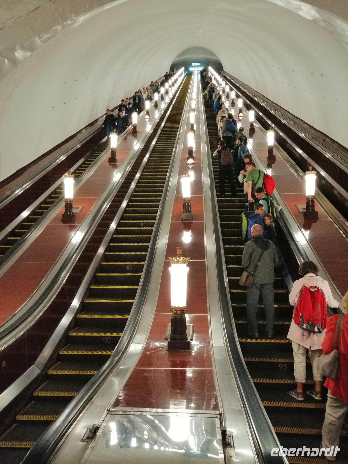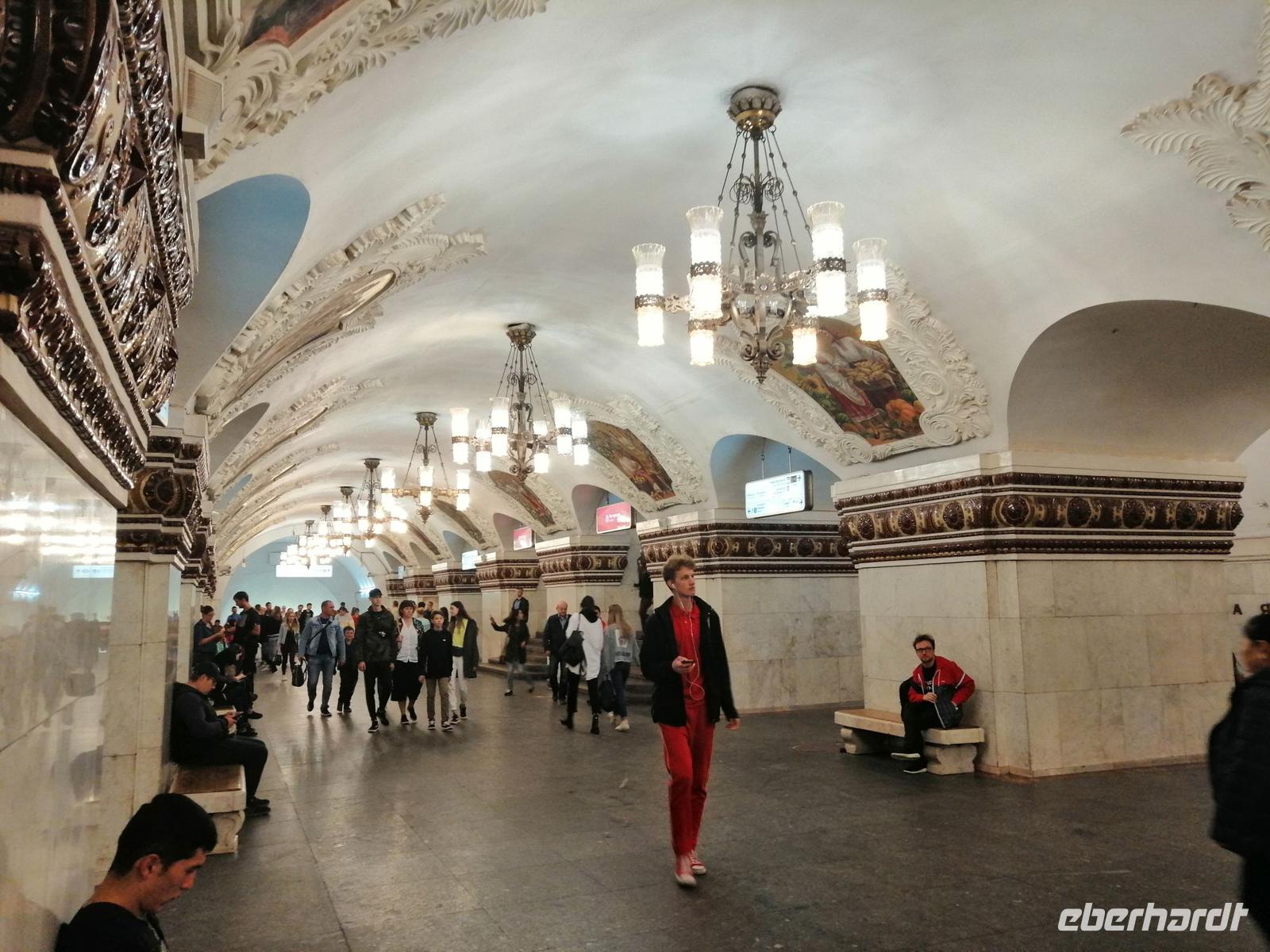 Danach starteten wir unsere Metro-Tour. Begonnen haben wir vor dem großen Metro-Schema, gleich am Eingang in die Moskauer U-Bahn Teatralnaja, wo uns Valeria zuerst über die Eckdaten der Metro informierte. Danach zeigte uns Valeria nur einige der schönsten U-Bahnstationen der Moskauer Metro: Platz der Oktoberrevolution, Komsomolskaja, Arbatskaja, Novoslobodskaja, Kiewskaja (radial und ring), Lenin-Bibliothek.