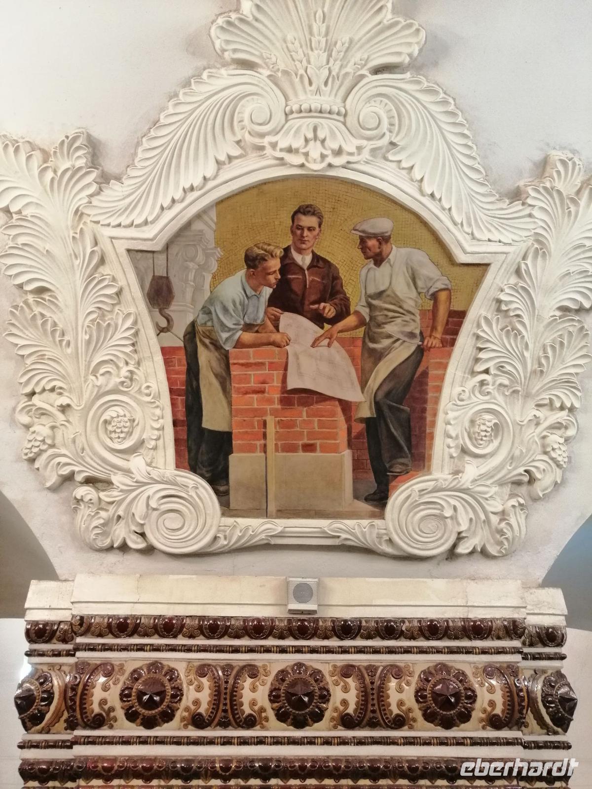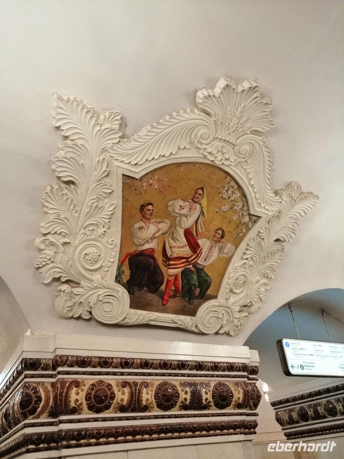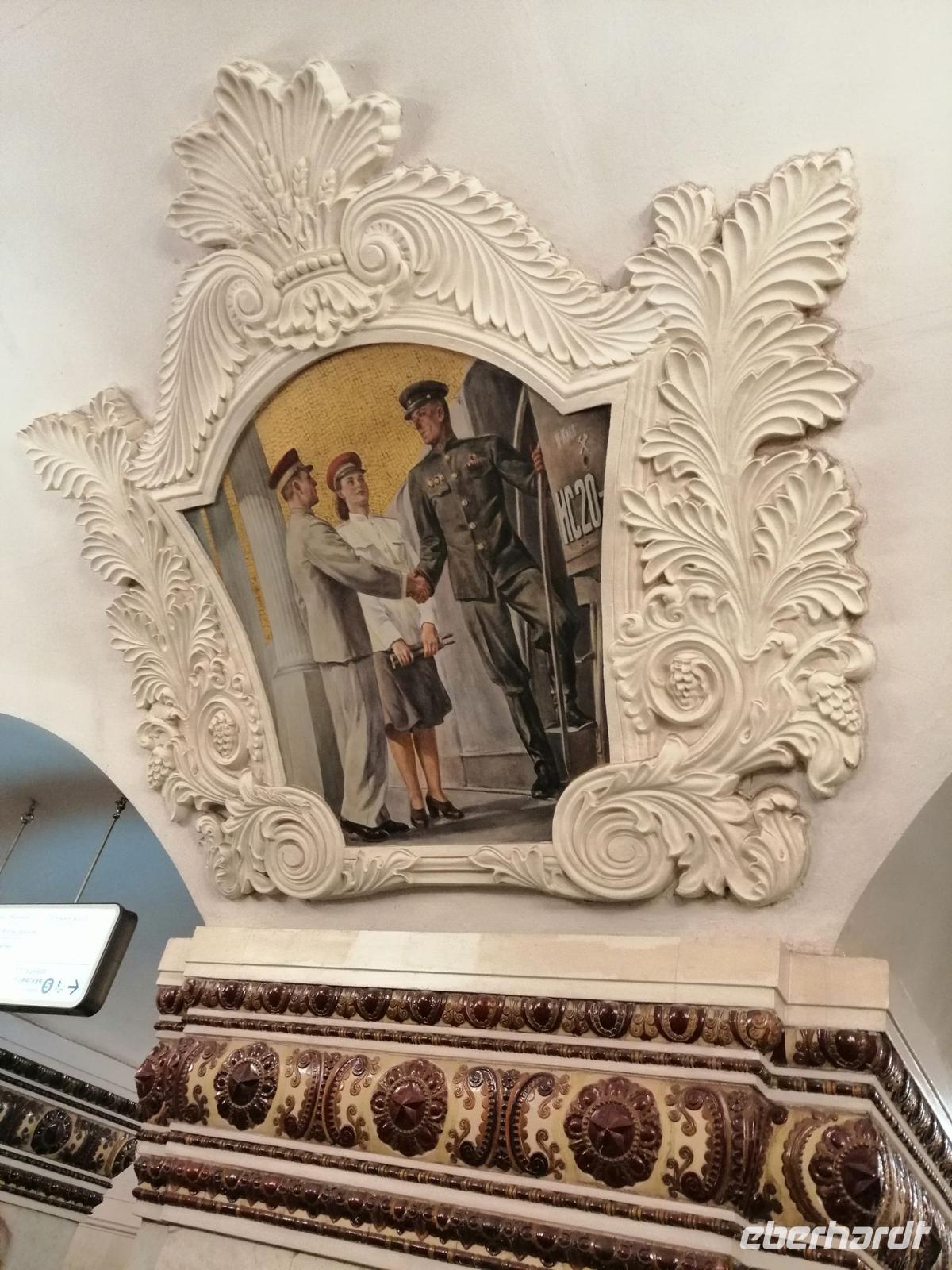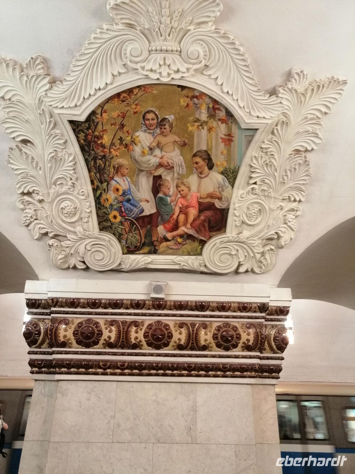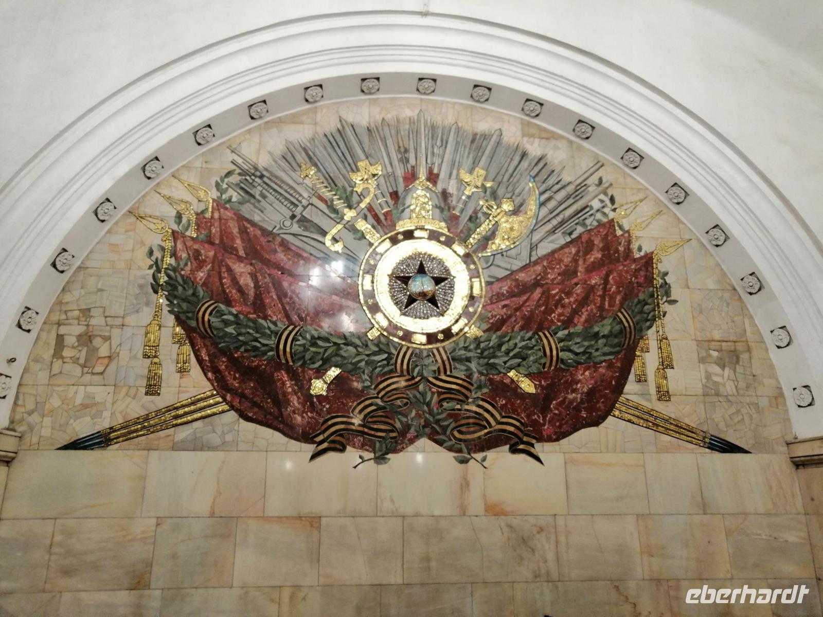 Danach starteten wir unsere Metro-Tour. Begonnen haben wir vor dem großen Metro-Schema, gleich am Eingang in die Moskauer U-Bahn Teatralnaja, wo uns Valeria zuerst über die Eckdaten der Metro informierte. Danach zeigte uns Valeria nur einige der schönsten U-Bahnstationen der Moskauer Metro: Platz der Oktoberrevolution, Komsomolskaja, Arbatskaja, Novoslobodskaja, Kiewskaja (radial und ring), Lenin-Bibliothek.