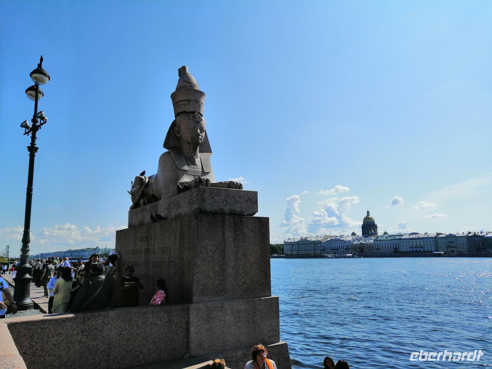 Anschließend wurden wir vor der Eremitage von unserem Bus abgeholt und setzten unsere Stadtrundfahrt mit Eugen fort. Wir schauten uns den Senat-Platz (mit Regierungssenat und Verfassungsgericht), das Denkmal des Peter I., die Issaak-Kathedrale, in der bis zu 10.000 Menschen zum Gottesdienst Platz finden, die Sphinx-Figuren vor der Akademie der Künste, Menschikow-Palast und viele andere Sehenswürdigkeiten während der Fahrt an.