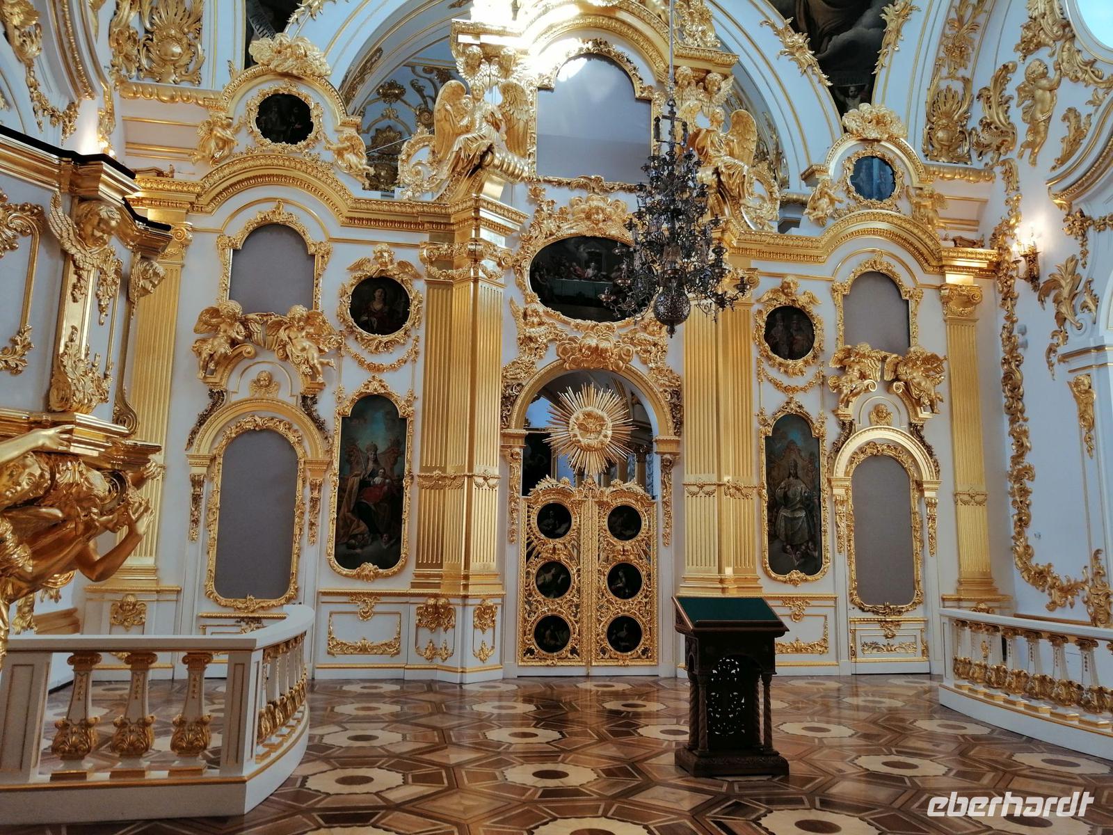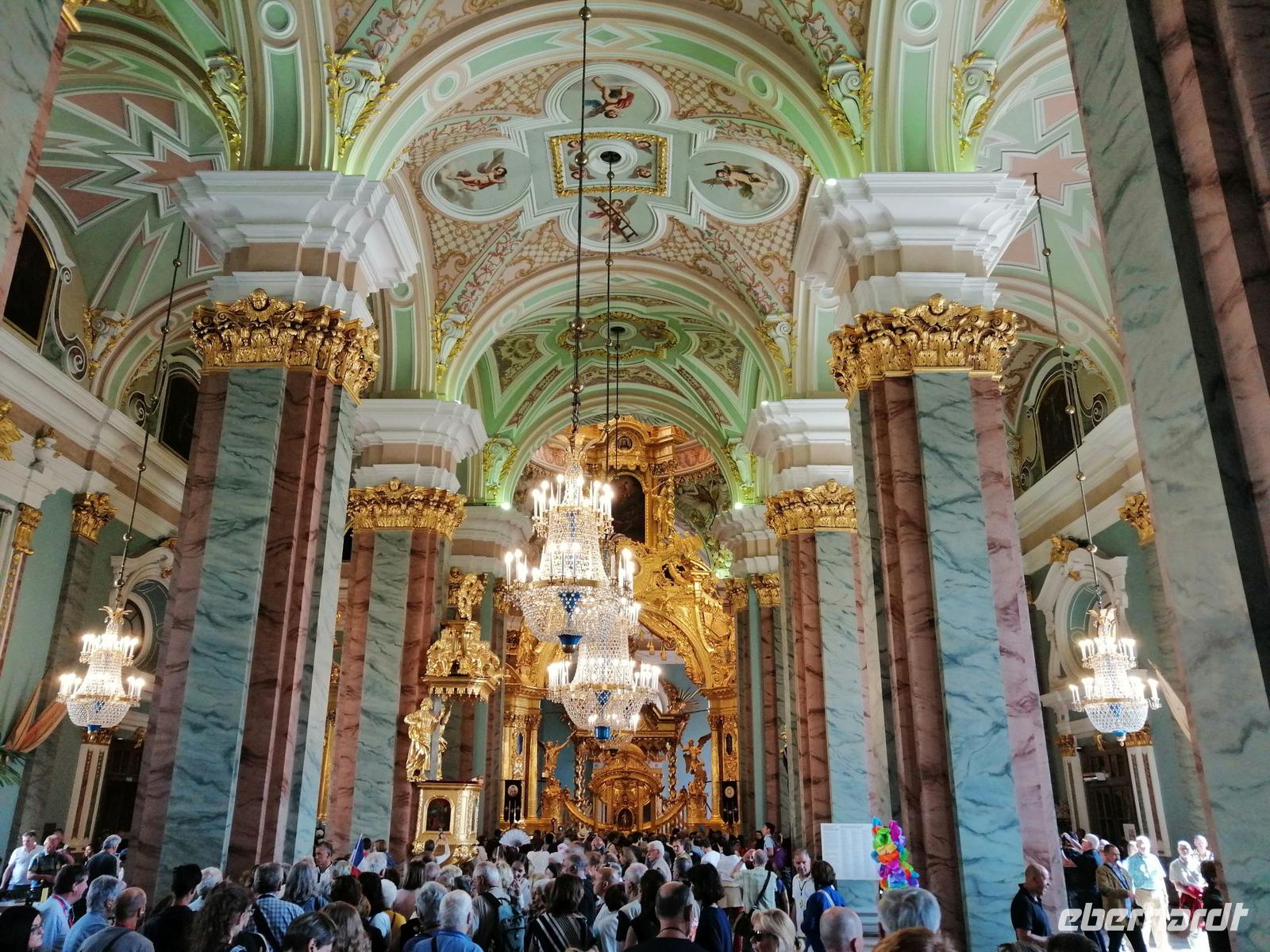 Wir besichtigten den Katharinenpalast mit dem weltberühmten Bernsteinzimmer. Das Gebäude wurde von der Ehefrau des Peter I. - der Katharina I. - in den Jahren 1717 bis 1724 errichtet. Eugen begleitete uns durch die Räume des Palastes und erzählte uns seine Geschichte. Erstaunlicherweise ist heute wenig los im Schloss, so dass wir uns in Ruhe und ohne Andrang bewegen können. Nach einem entspannten Spaziergang durch den großen Schlossgarten, gelangten wir zum Eingang und wurden durch die lange Warteschlange mit angegebenen 4 Stunden Wartezeit geschockt! So ein Glück, dass wir eine gut organisierte Reise haben! Nach einem Mittagessen in Restaurant „Sotschi" fuhren wir wieder zurück nach Sankt Petersburg.