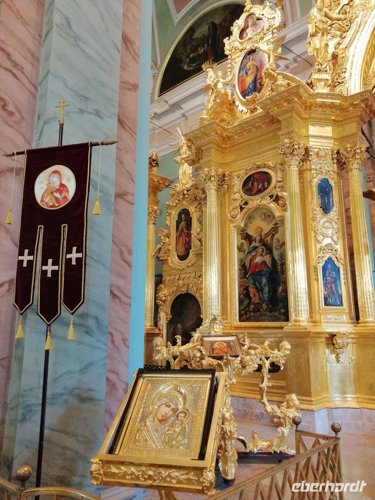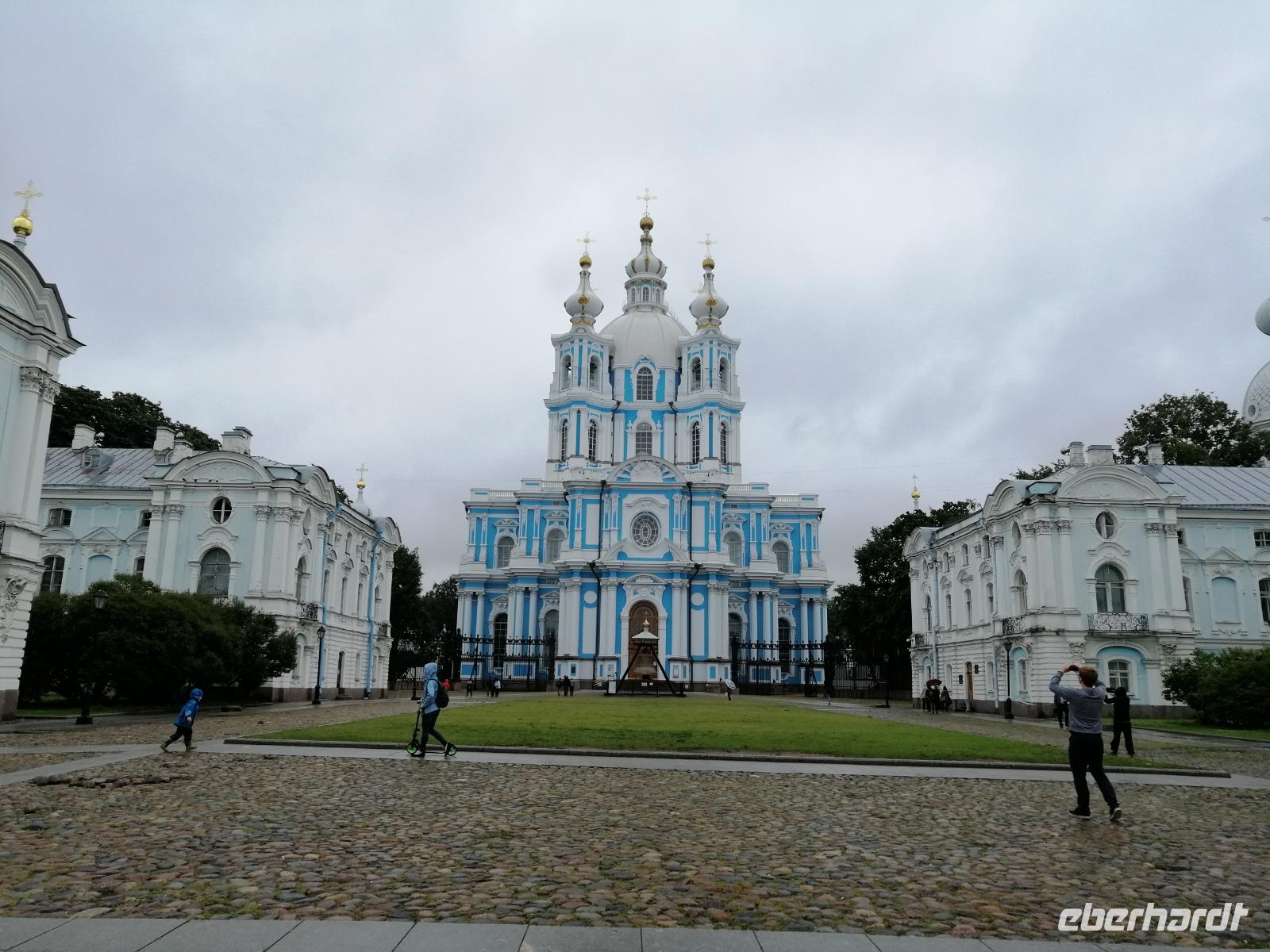 Unterwegs zum Flughafen besichtigten wir noch das Smolny-Kloster. Eugen informierte uns, dass diese Anlage nie als Kloster funktioniert hat. Aus Mangel an Finanzierung konnte der Bau zur damaligen Zeit nicht umgesetzt werden und so richtete Zarin Elisabeth im Jahr 1764 ein Mädcheninternat hier ein. Die kräftige hellblaue Farbe des Klosters soll an die Augenfarbe der Zarin erinnern.