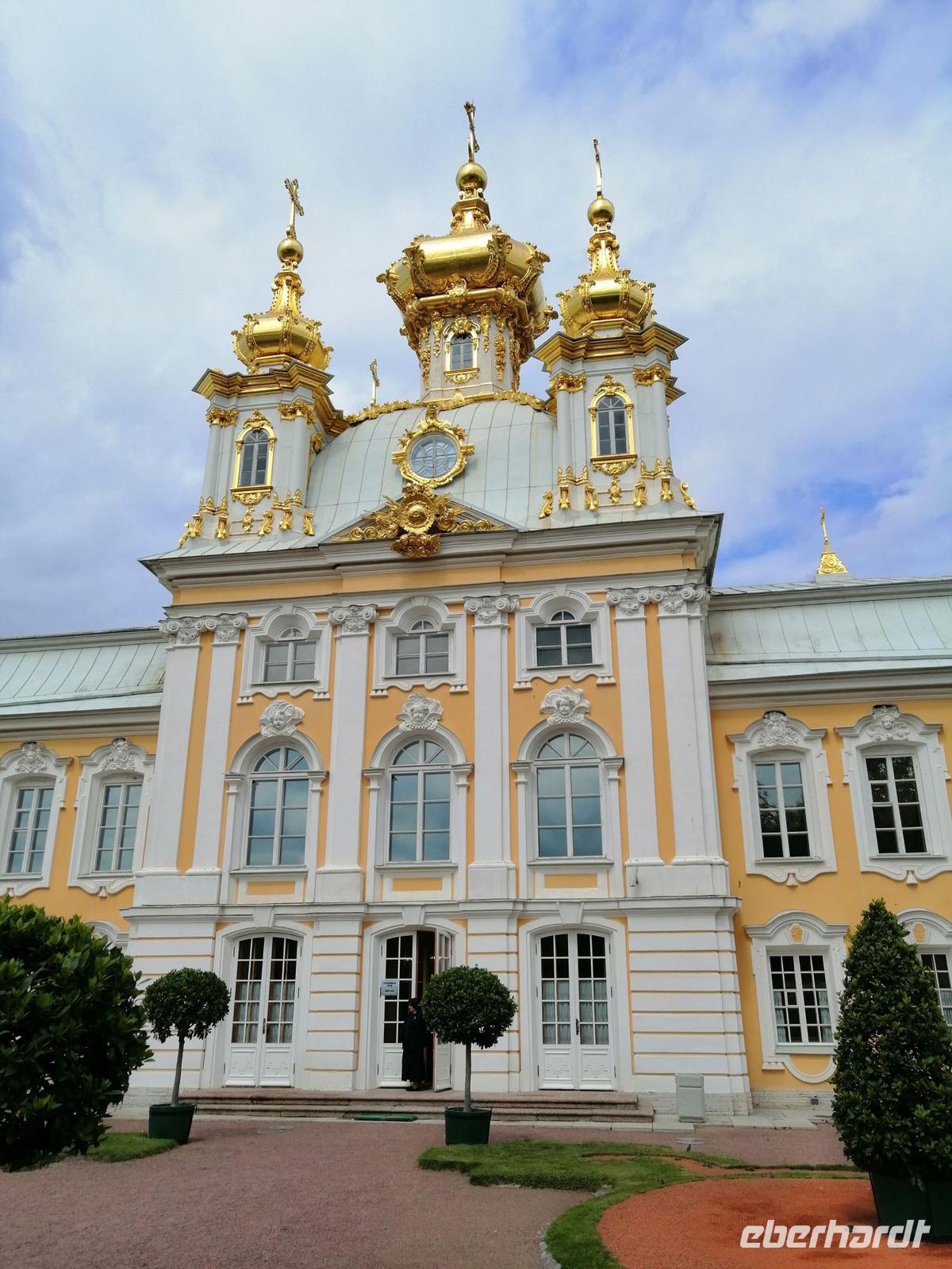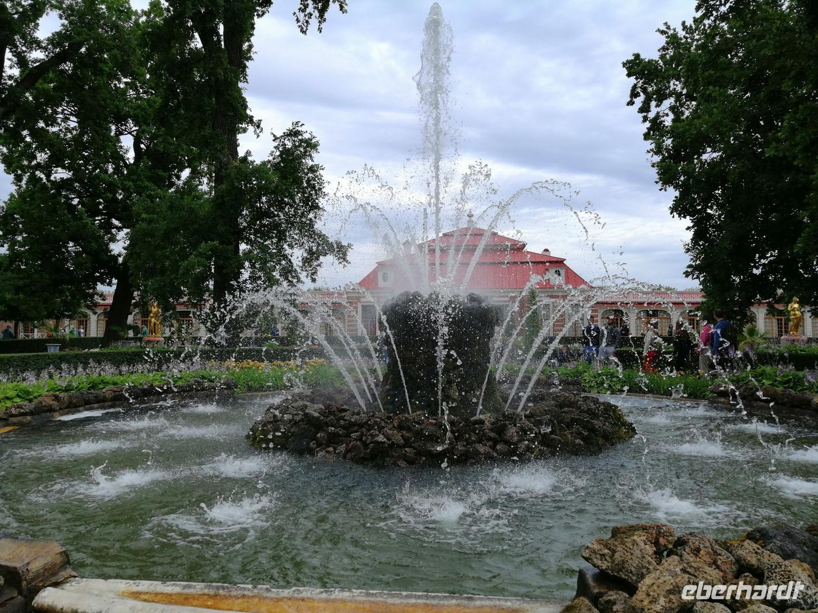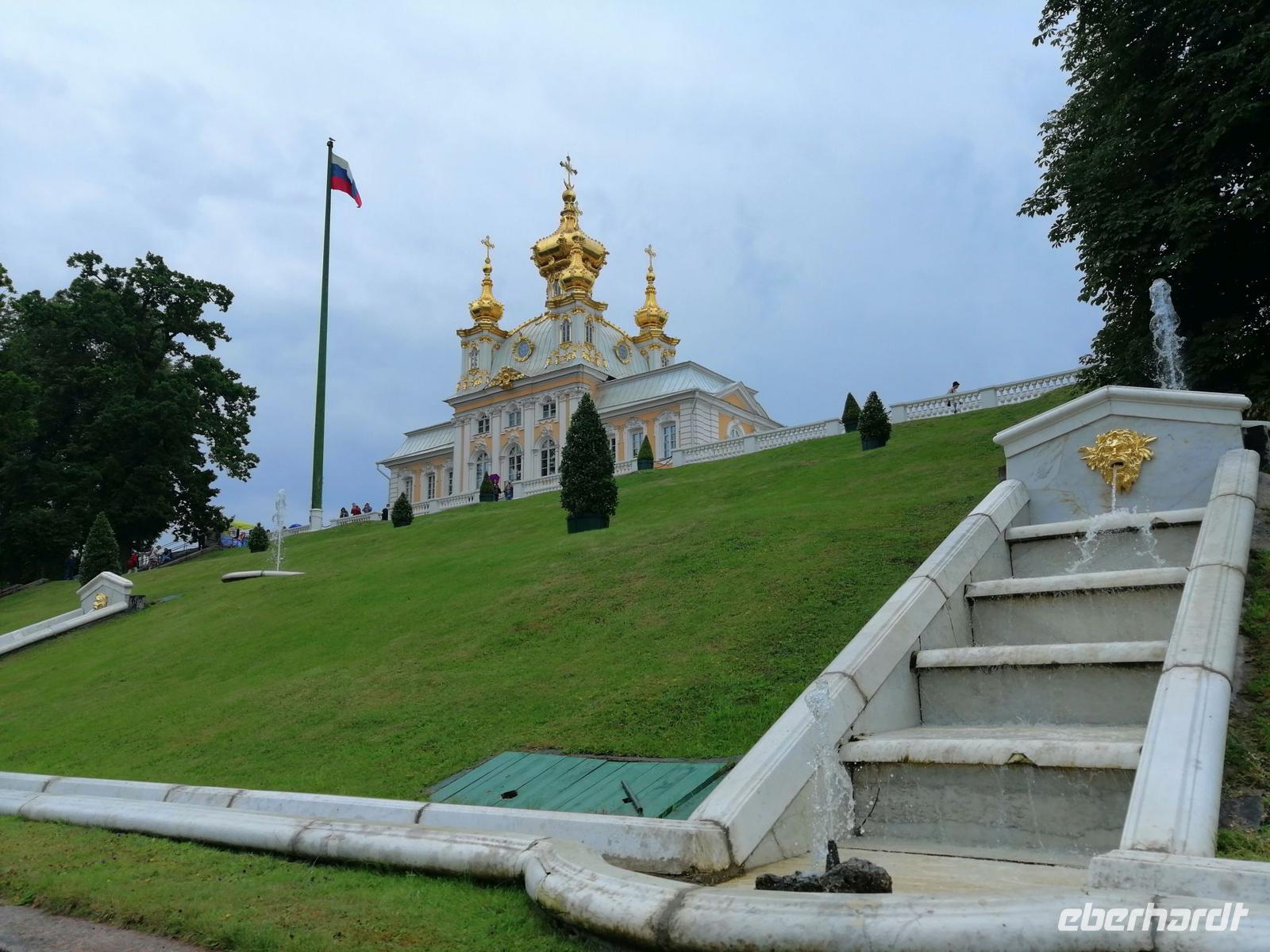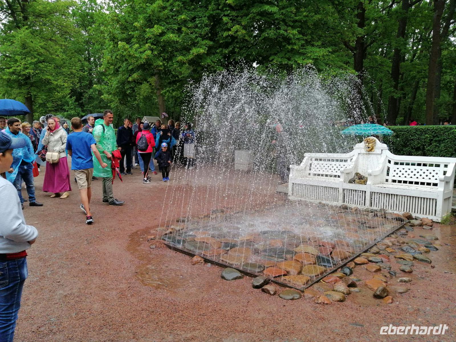 Die Fahrt nach Peterhof mit dem Tragflächenboot „Raketa" war sehr komfortabel und dauerte nur eine halbe Stunde. Trotz des für Sankt Petersburg typisch regnerischen Wetters schauten wir uns die wunderschöne Parkanlage der ehemaligen Zaren-Sommerresidenz an. Eugen verriet uns glücklicherweise rechtszeitig die versteckten „Spritz-Fallen" im Park, die neugierigen Touristen unerwartet mit Wasser bespritzten. Danach teilten wir uns in zwei Gruppen auf und besuchten das kleine Schlösschen Monplaisir, direkt an der Ostsee gelegen. Das Gebäude ließ der Zar Peter I. im holländischen Still errichten. Das Haus ist zwar sehr lang aber nicht so breit und ist durch die vielen Fenster sehr hell.