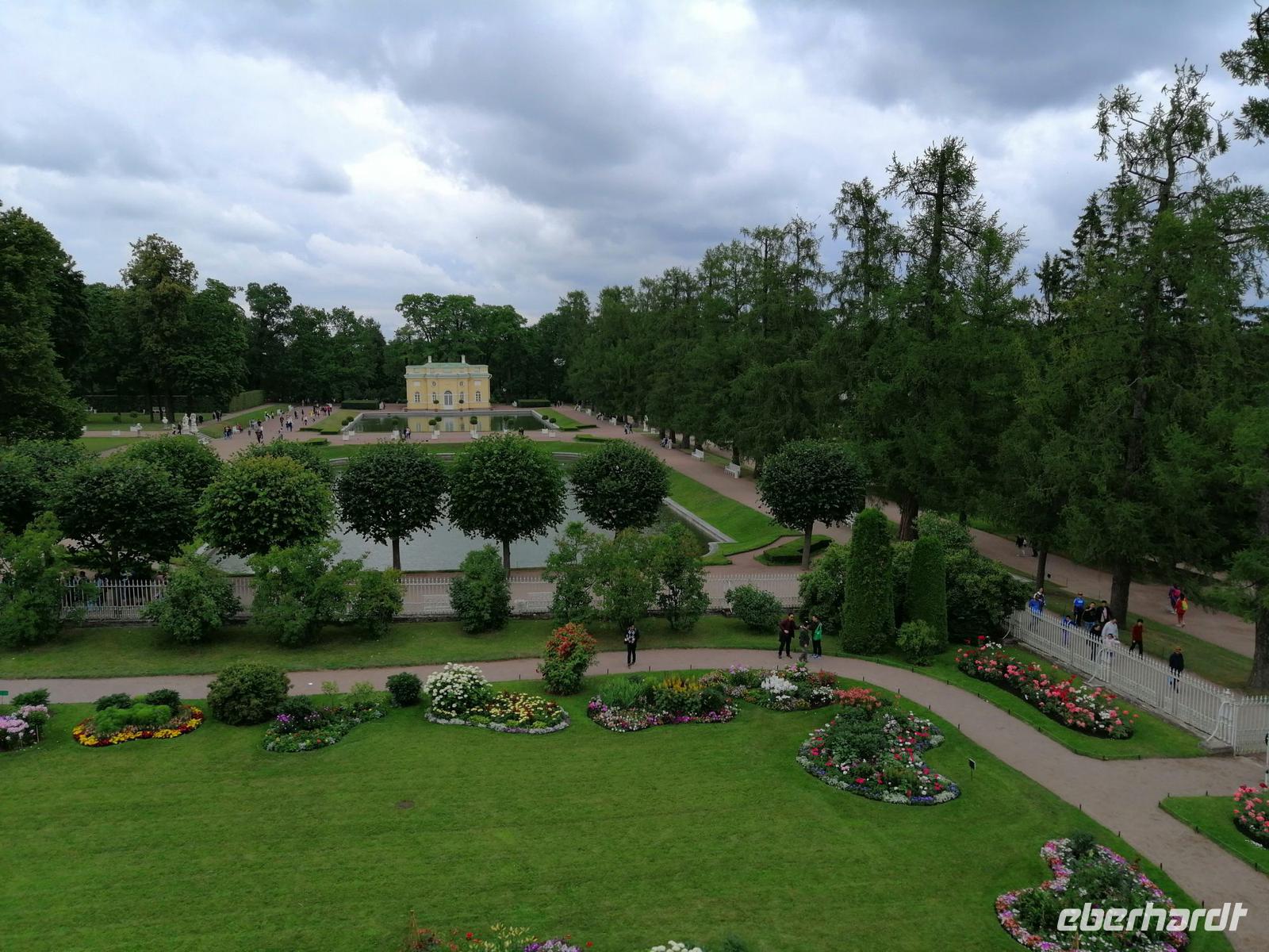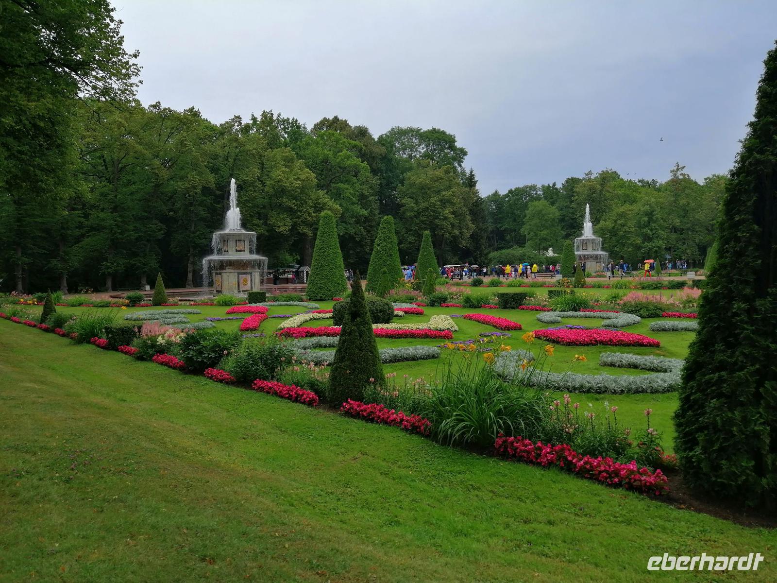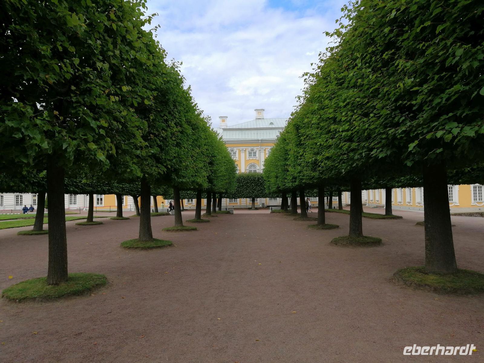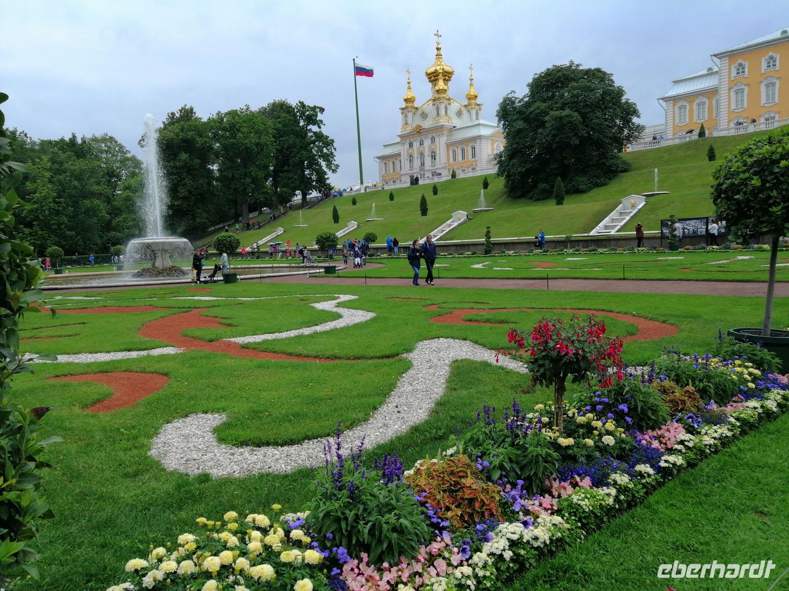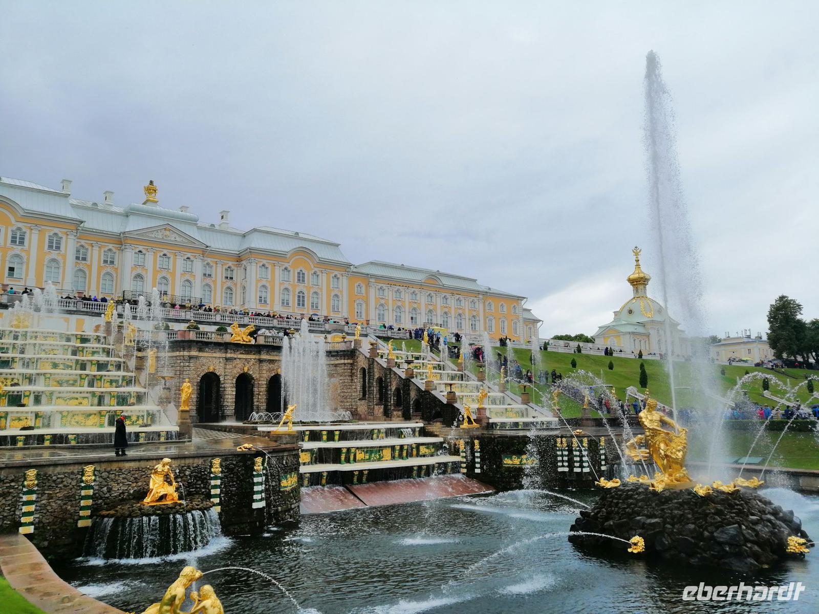 Die Fahrt nach Peterhof mit dem Tragflächenboot „Raketa" war sehr komfortabel und dauerte nur eine halbe Stunde. Trotz des für Sankt Petersburg typisch regnerischen Wetters schauten wir uns die wunderschöne Parkanlage der ehemaligen Zaren-Sommerresidenz an. Eugen verriet uns glücklicherweise rechtszeitig die versteckten „Spritz-Fallen" im Park, die neugierigen Touristen unerwartet mit Wasser bespritzten. Danach teilten wir uns in zwei Gruppen auf und besuchten das kleine Schlösschen Monplaisir, direkt an der Ostsee gelegen. Das Gebäude ließ der Zar Peter I. im holländischen Still errichten. Das Haus ist zwar sehr lang aber nicht so breit und ist durch die vielen Fenster sehr hell.