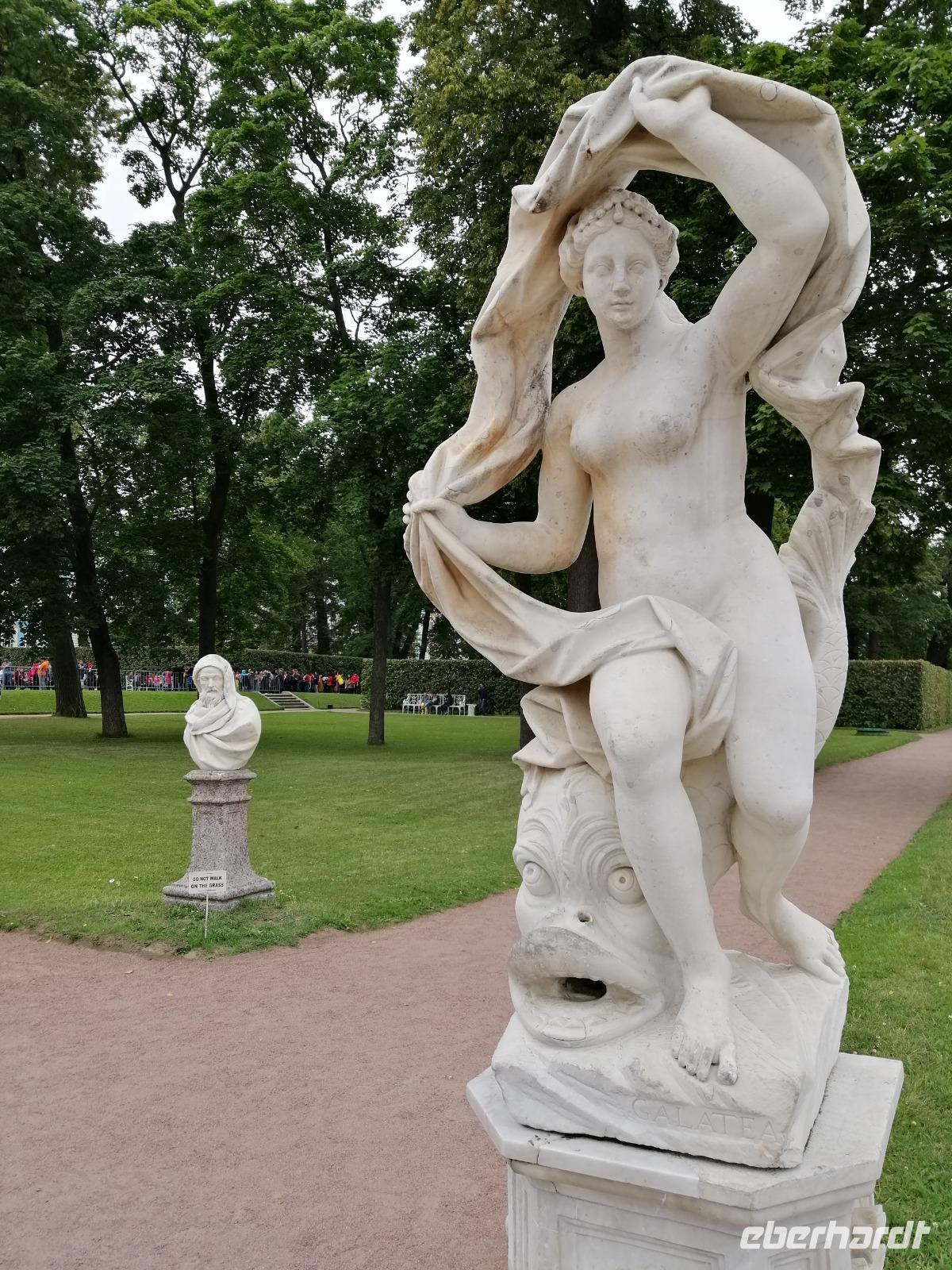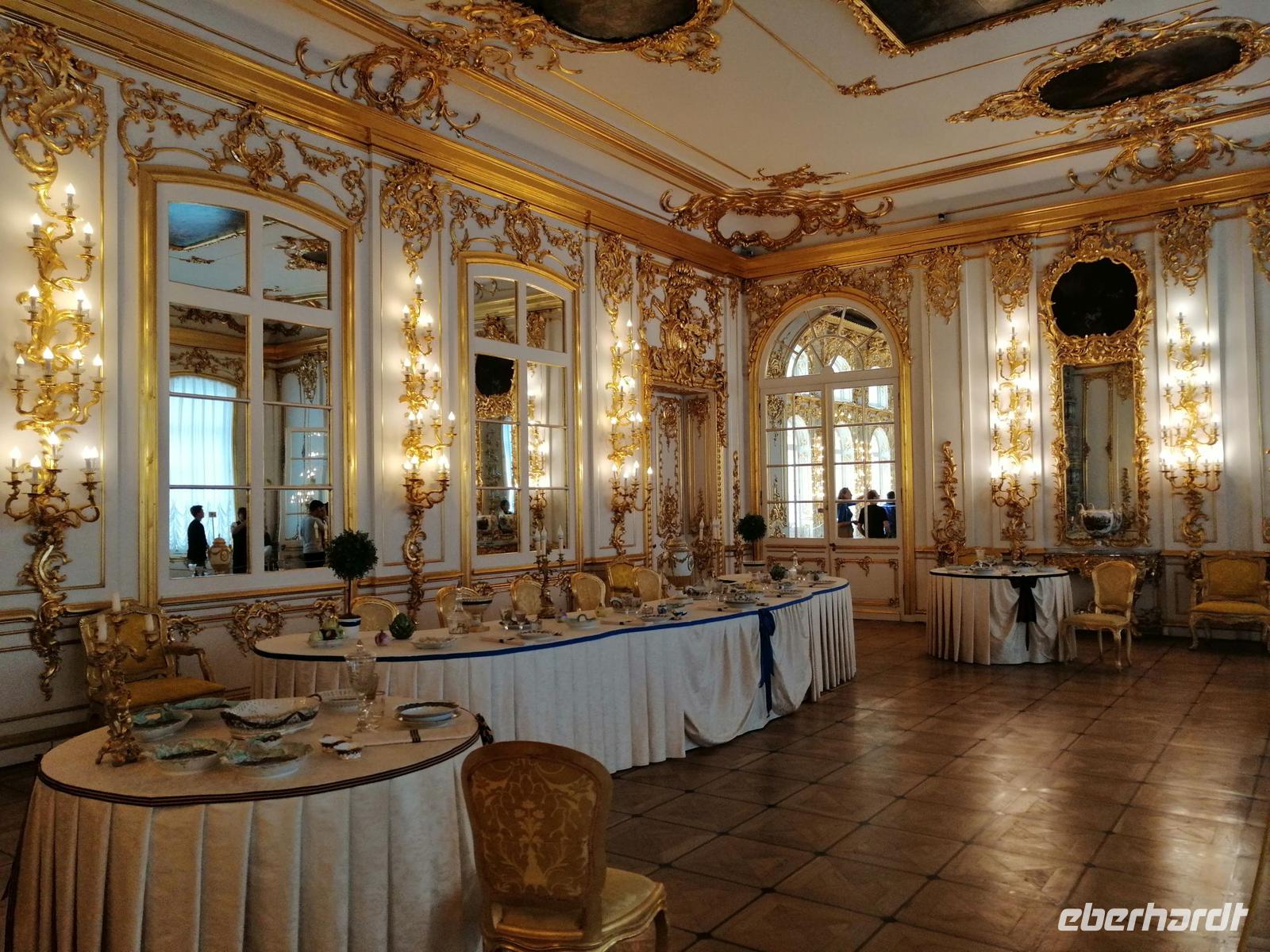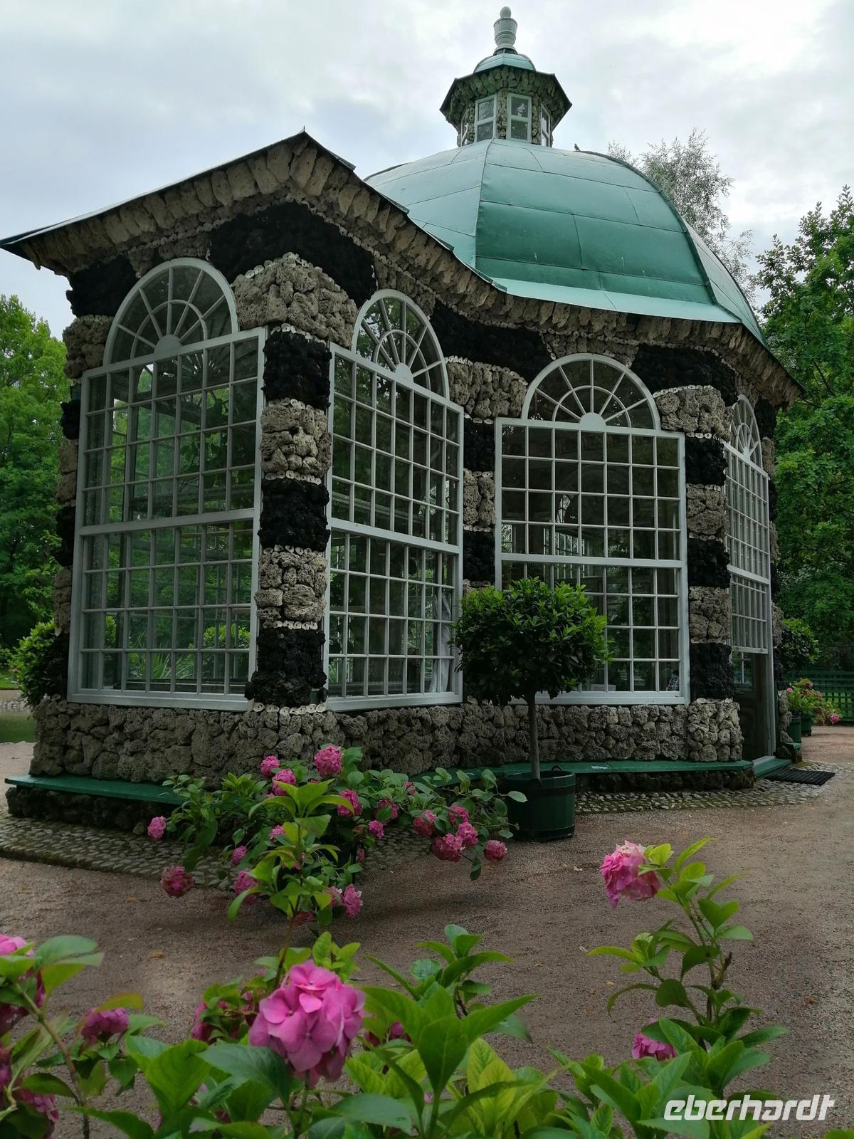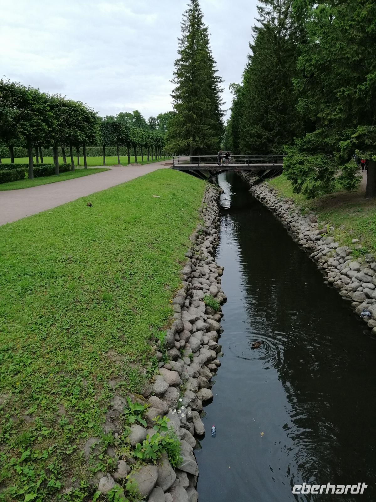 Die Fahrt nach Peterhof mit dem Tragflächenboot „Raketa" war sehr komfortabel und dauerte nur eine halbe Stunde. Trotz des für Sankt Petersburg typisch regnerischen Wetters schauten wir uns die wunderschöne Parkanlage der ehemaligen Zaren-Sommerresidenz an. Eugen verriet uns glücklicherweise rechtszeitig die versteckten „Spritz-Fallen" im Park, die neugierigen Touristen unerwartet mit Wasser bespritzten. Danach teilten wir uns in zwei Gruppen auf und besuchten das kleine Schlösschen Monplaisir, direkt an der Ostsee gelegen. Das Gebäude ließ der Zar Peter I. im holländischen Still errichten. Das Haus ist zwar sehr lang aber nicht so breit und ist durch die vielen Fenster sehr hell.