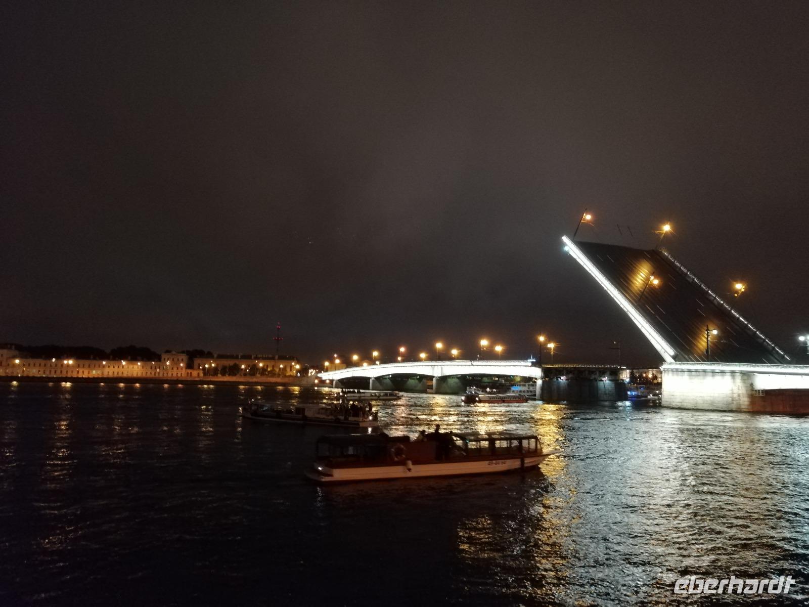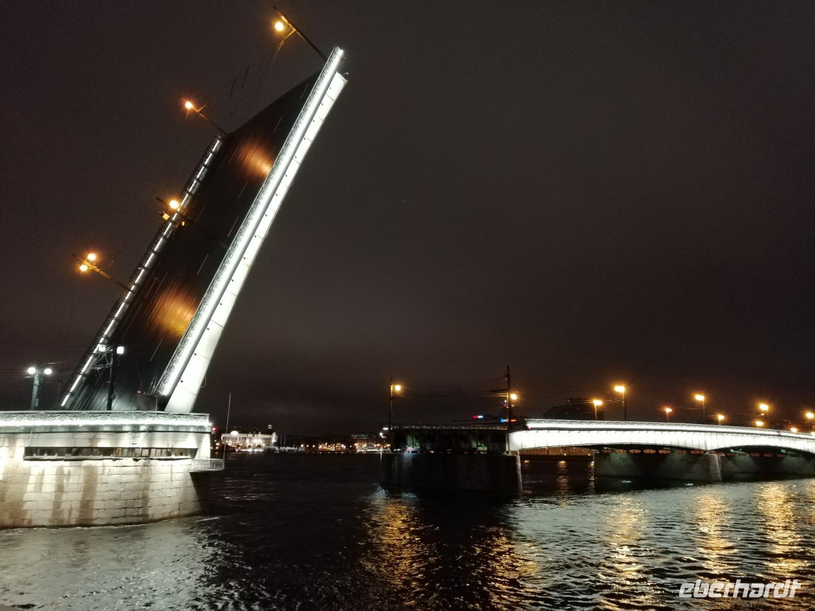 Nun ist heute der letzte Tag in Sankt Petersburg und der harte Kern der Reisegruppe beschloss bis in die Nacht durchzuhalten um sich die Öffnung der Brücken über Newa anzuschauen. Unser Hotel befand sich in der Nähe der „Litejnyj Brücke", die wir auch ansteuerten. Schon während der Stadtrundfahrt erzählte uns Eugen, dass die Brücken-Öffnung für viele junge Leute eine gute Ausrede ist, um nicht zuhause übernachten zu müssen. Wir schauten an, wie der Frachtverkehr die Stadt an der Newa passierte. Alle Brücken waren hell beleuchtet und sahen faszinierend aus.