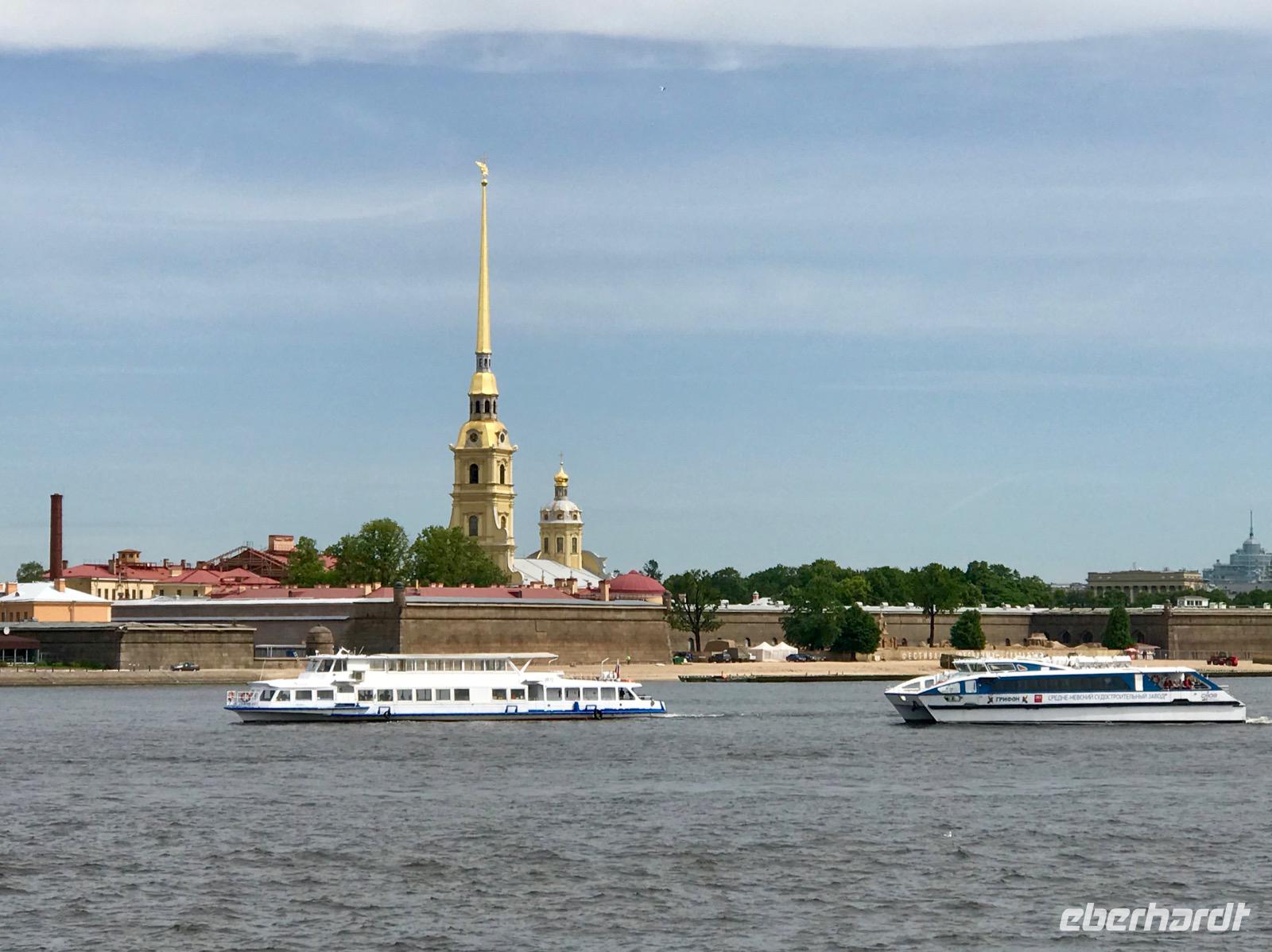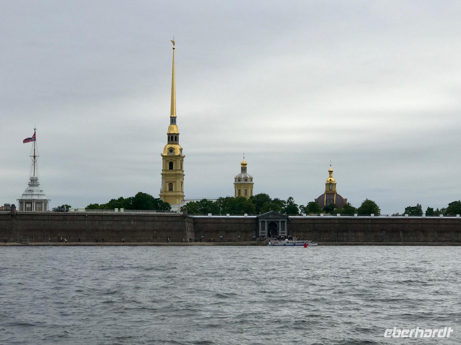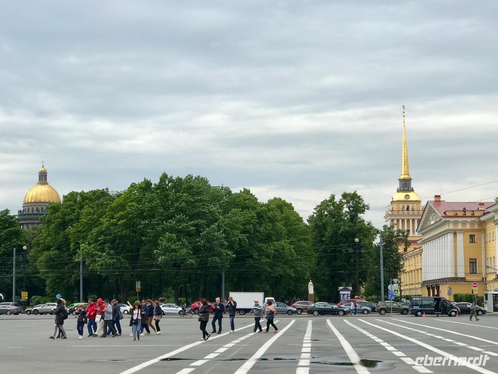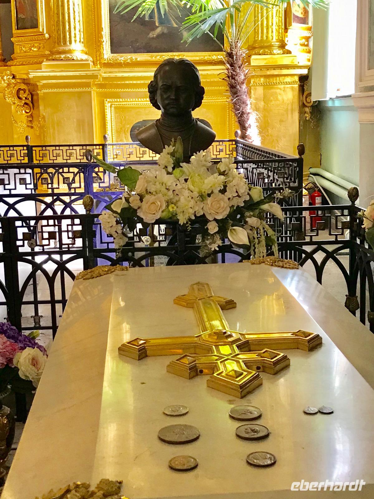 Heute steht die Stadtbesichtigung auf dem Programm, per Bus und später per Fuß. Anton unser Busfahrer gibt sich redlich Mühe, den Bus durch das Gedränge der überfüllten Stadt zu lenken. Wir fahren zunächst den Newski-Prospekt entlang, dann über den Fluss, betrachten die Silhouette der Stadt vom anderen Newa-Ufer aus und halten dann an der Spitze der Wassili-Insel, Strelka genannt. Von hier aus hat man einen wunderschönen Blick auf das Winterpalais. Die einheitlich hohen Prachtbauten in ihrer gleichmäßigen Architektur entlang des Kais mit den pastellfarbenen Verzierungen und Giebeln, die horizontalen Linien des Ufers und die weite Wasserfläche erinnern an ein Bühnenbild. Auf der Petrograder Seite scheint die Haseninsel auf der Wasserfläche zu schwimmen, sichtbar durch die Türme der Peter-Paul-Festung und einst Keimzelle der Stadt. Unser nächster Stopp wird genau dort sein. Wir besuchen die Peter-Paul-Kathedrale, die Grablege der Zarenfamilie. Es ist schwierig, der Abfolge an Zaren aus der Romanow-Dynastie zu folgen, aber Vera tut ihr Bestes, damit wir verstehen, welche Ereignisse der russischen Vergangenheit mit den einzelnen Zaren verbunden sind. Und die familiären Verbindungen mit den deutschen Adelsgeschlechtern sind auch interessant. Die Gräber der beiden großen Zaren, Peter I. und Katharina II., sind ganz vorn zu finden. Hinten stehen wir vor der Grabkapelle der 1918 in Jekaterinburg erschossenen Zarenfamilie von Nikolaus II. Nach unserem Rundgang wartet in einer kleinen Kapelle noch ein besonderes Highlight - vier kräftige Russen bieten uns eine kleine Kostprobe ihres Könnens und singen ein Kirchenlied. Welch tiefe Stimmen!