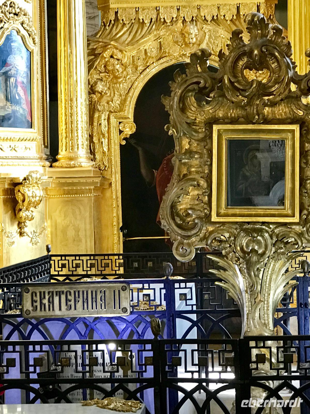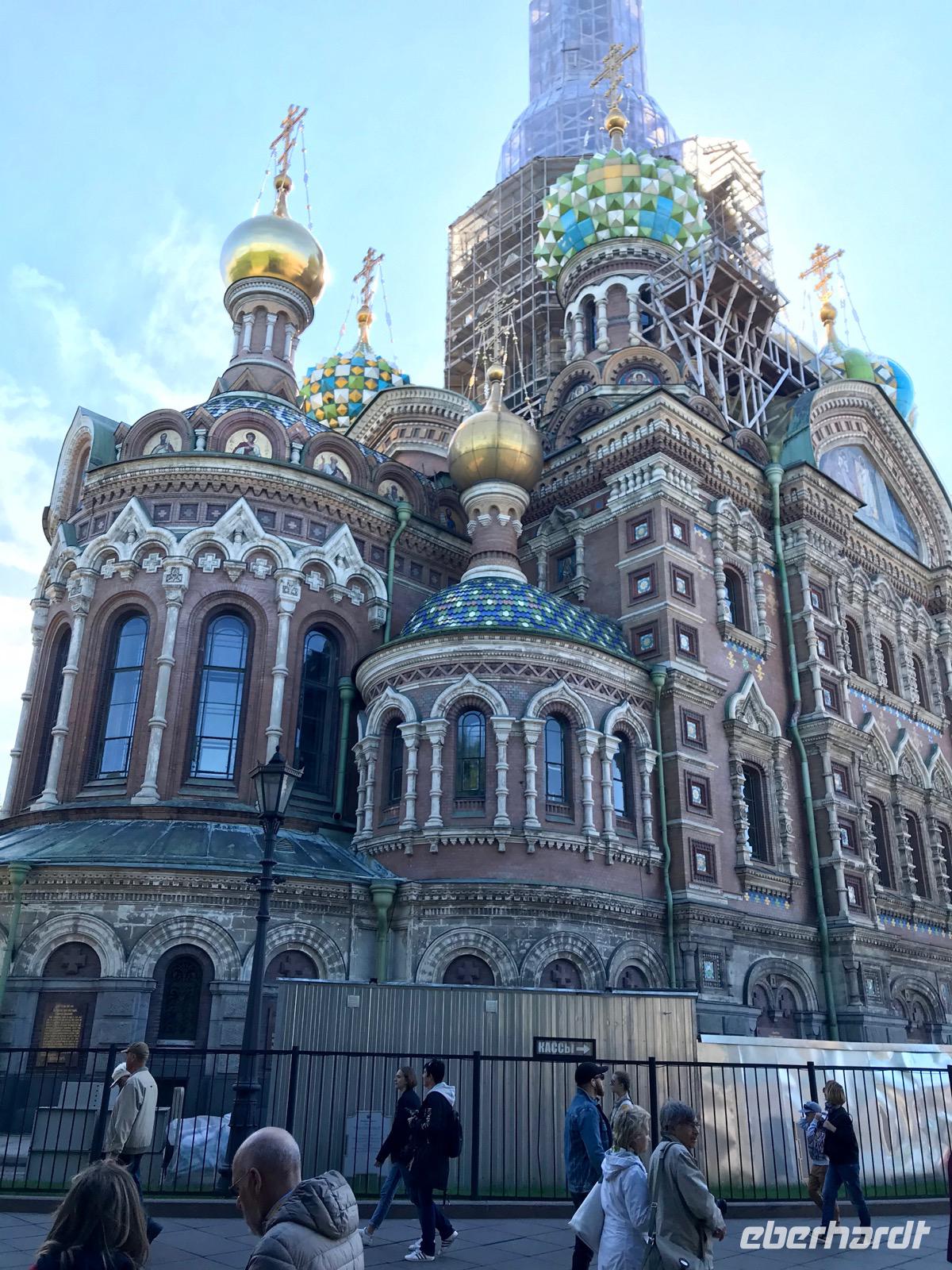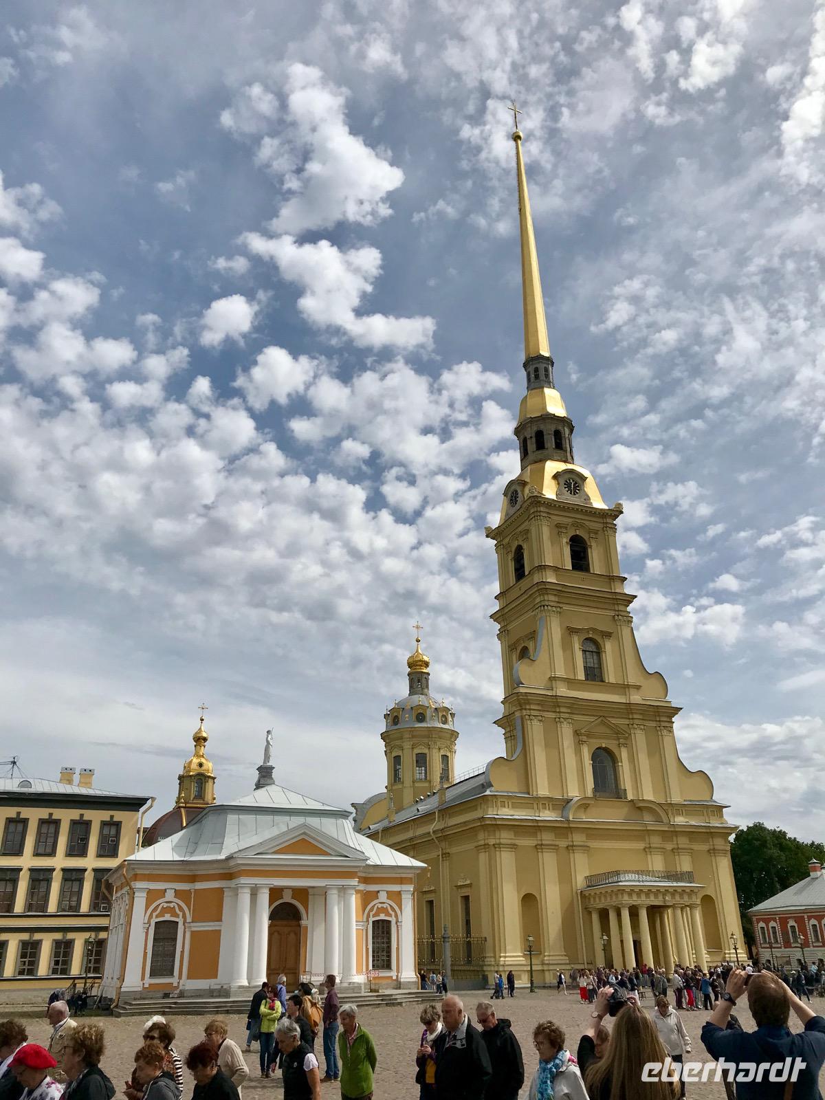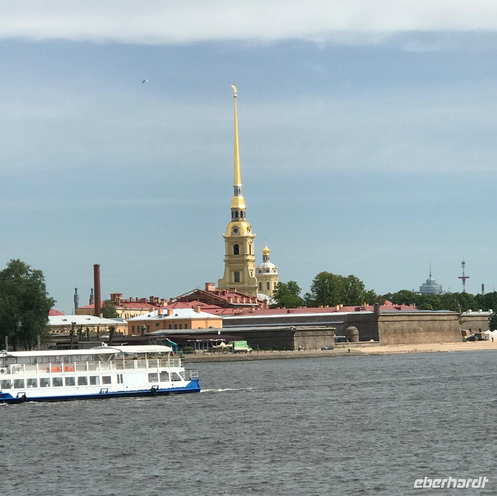 Heute steht die Stadtbesichtigung auf dem Programm, per Bus und später per Fuß. Anton unser Busfahrer gibt sich redlich Mühe, den Bus durch das Gedränge der überfüllten Stadt zu lenken. Wir fahren zunächst den Newski-Prospekt entlang, dann über den Fluss, betrachten die Silhouette der Stadt vom anderen Newa-Ufer aus und halten dann an der Spitze der Wassili-Insel, Strelka genannt. Von hier aus hat man einen wunderschönen Blick auf das Winterpalais. Die einheitlich hohen Prachtbauten in ihrer gleichmäßigen Architektur entlang des Kais mit den pastellfarbenen Verzierungen und Giebeln, die horizontalen Linien des Ufers und die weite Wasserfläche erinnern an ein Bühnenbild. Auf der Petrograder Seite scheint die Haseninsel auf der Wasserfläche zu schwimmen, sichtbar durch die Türme der Peter-Paul-Festung und einst Keimzelle der Stadt. Unser nächster Stopp wird genau dort sein. Wir besuchen die Peter-Paul-Kathedrale, die Grablege der Zarenfamilie. Es ist schwierig, der Abfolge an Zaren aus der Romanow-Dynastie zu folgen, aber Vera tut ihr Bestes, damit wir verstehen, welche Ereignisse der russischen Vergangenheit mit den einzelnen Zaren verbunden sind. Und die familiären Verbindungen mit den deutschen Adelsgeschlechtern sind auch interessant. Die Gräber der beiden großen Zaren, Peter I. und Katharina II., sind ganz vorn zu finden. Hinten stehen wir vor der Grabkapelle der 1918 in Jekaterinburg erschossenen Zarenfamilie von Nikolaus II. Nach unserem Rundgang wartet in einer kleinen Kapelle noch ein besonderes Highlight - vier kräftige Russen bieten uns eine kleine Kostprobe ihres Könnens und singen ein Kirchenlied. Welch tiefe Stimmen!
