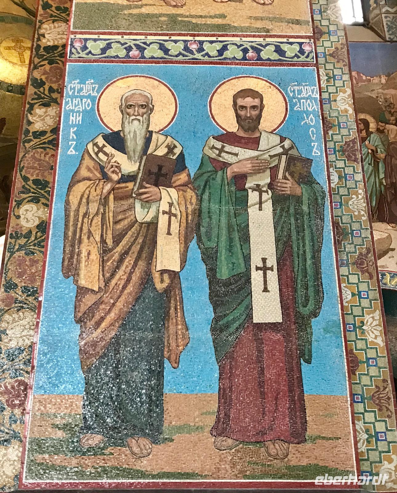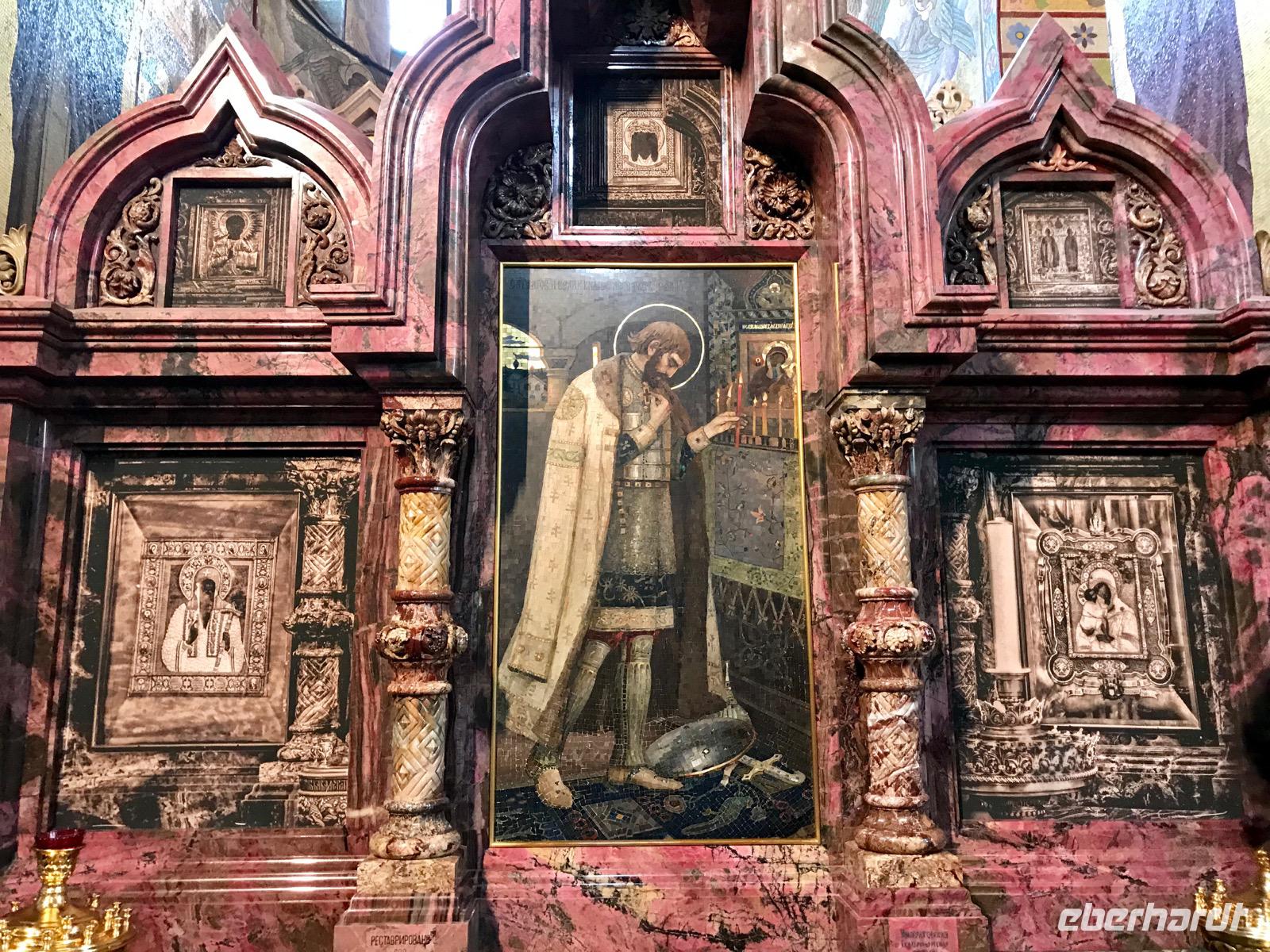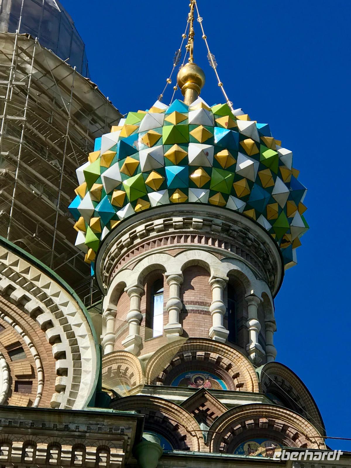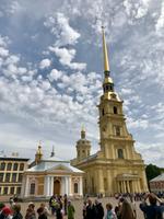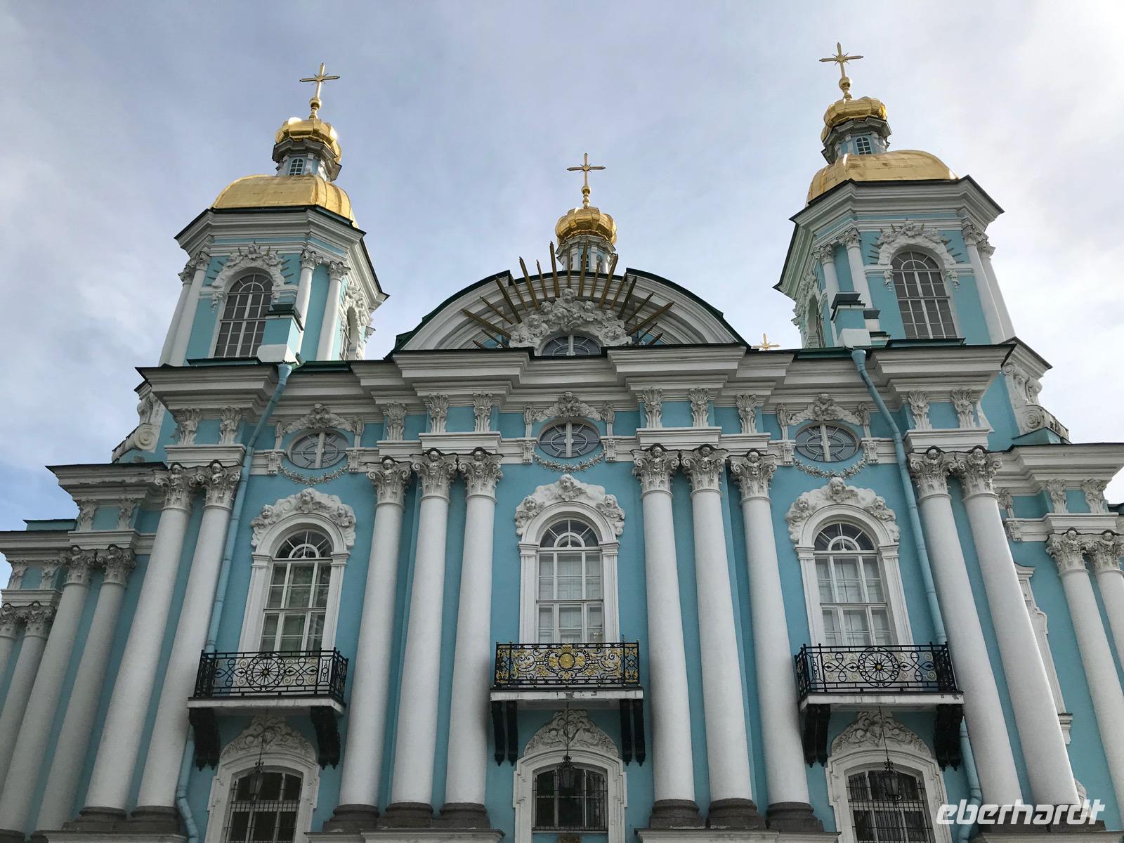 Heute steht die Stadtbesichtigung auf dem Programm, per Bus und später per Fuß. Anton unser Busfahrer gibt sich redlich Mühe, den Bus durch das Gedränge der überfüllten Stadt zu lenken. Wir fahren zunächst den Newski-Prospekt entlang, dann über den Fluss, betrachten die Silhouette der Stadt vom anderen Newa-Ufer aus und halten dann an der Spitze der Wassili-Insel, Strelka genannt. Von hier aus hat man einen wunderschönen Blick auf das Winterpalais. Die einheitlich hohen Prachtbauten in ihrer gleichmäßigen Architektur entlang des Kais mit den pastellfarbenen Verzierungen und Giebeln, die horizontalen Linien des Ufers und die weite Wasserfläche erinnern an ein Bühnenbild. Auf der Petrograder Seite scheint die Haseninsel auf der Wasserfläche zu schwimmen, sichtbar durch die Türme der Peter-Paul-Festung und einst Keimzelle der Stadt. Unser nächster Stopp wird genau dort sein. Wir besuchen die Peter-Paul-Kathedrale, die Grablege der Zarenfamilie. Es ist schwierig, der Abfolge an Zaren aus der Romanow-Dynastie zu folgen, aber Vera tut ihr Bestes, damit wir verstehen, welche Ereignisse der russischen Vergangenheit mit den einzelnen Zaren verbunden sind. Und die familiären Verbindungen mit den deutschen Adelsgeschlechtern sind auch interessant. Die Gräber der beiden großen Zaren, Peter I. und Katharina II., sind ganz vorn zu finden. Hinten stehen wir vor der Grabkapelle der 1918 in Jekaterinburg erschossenen Zarenfamilie von Nikolaus II. Nach unserem Rundgang wartet in einer kleinen Kapelle noch ein besonderes Highlight - vier kräftige Russen bieten uns eine kleine Kostprobe ihres Könnens und singen ein Kirchenlied. Welch tiefe Stimmen!