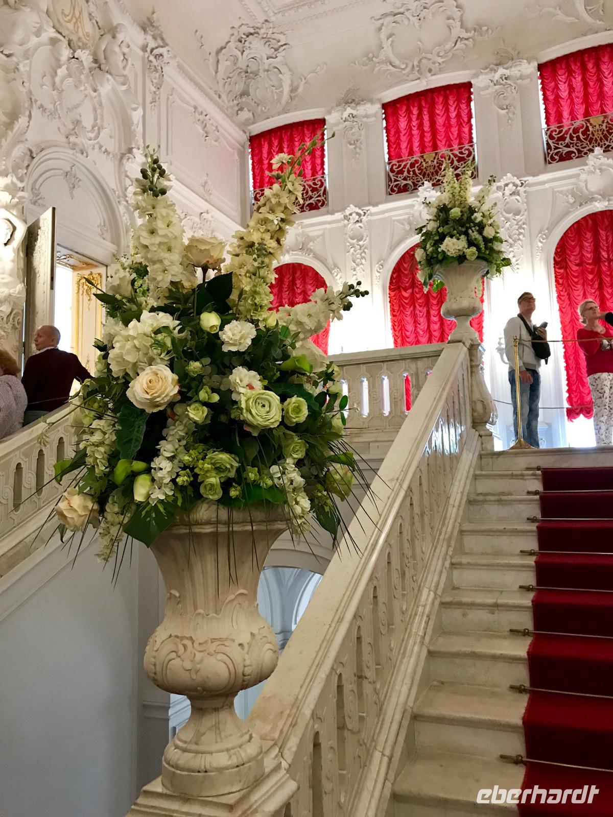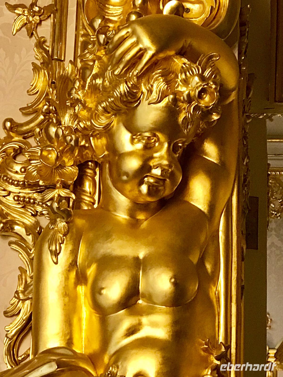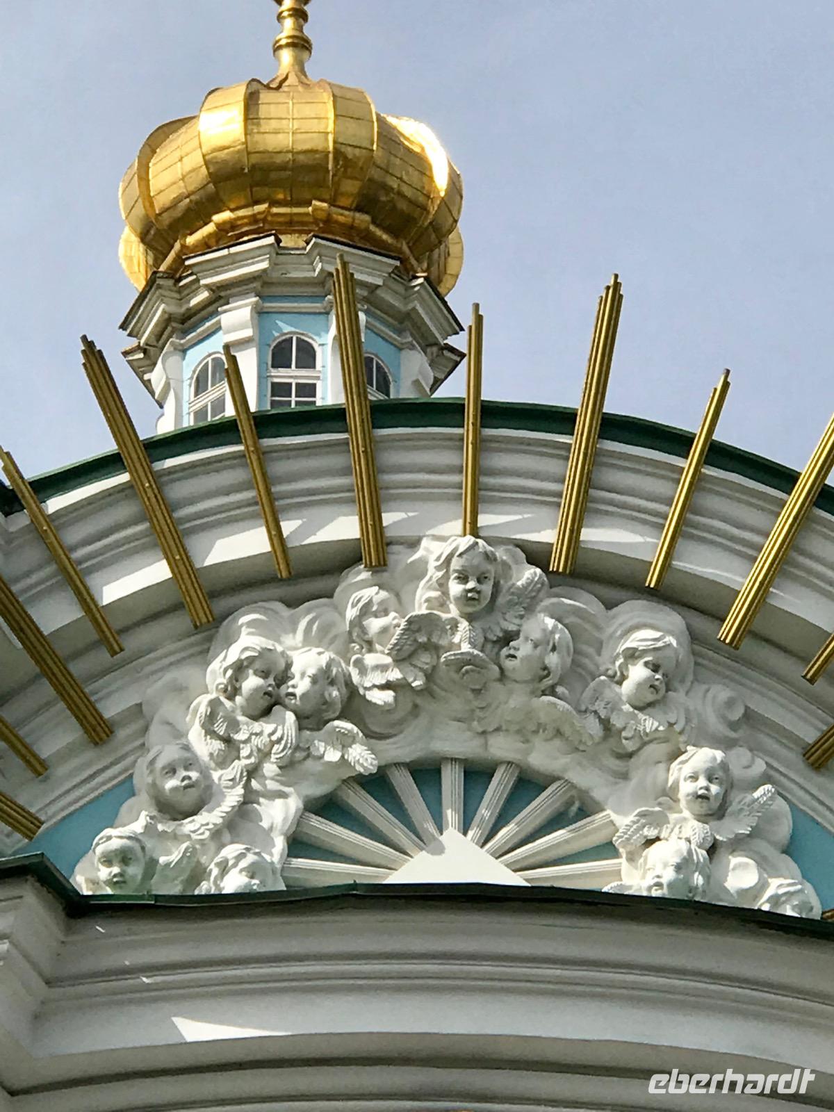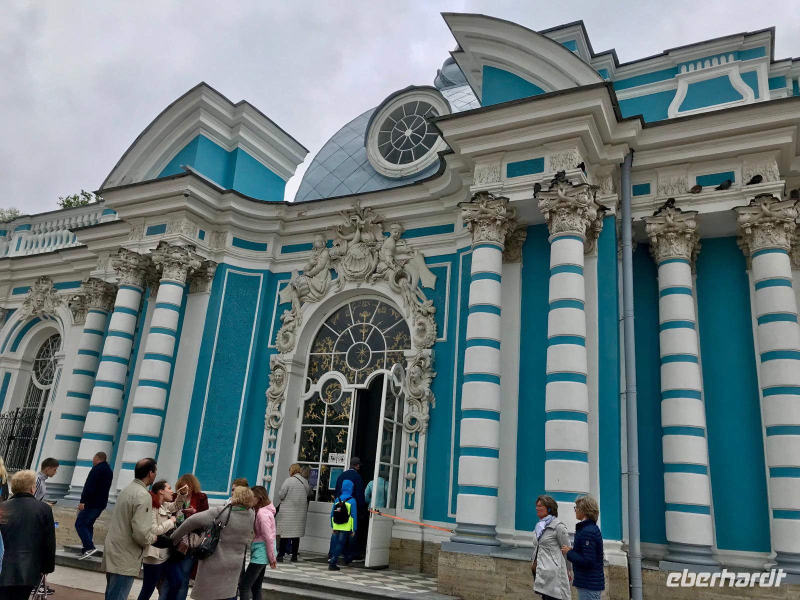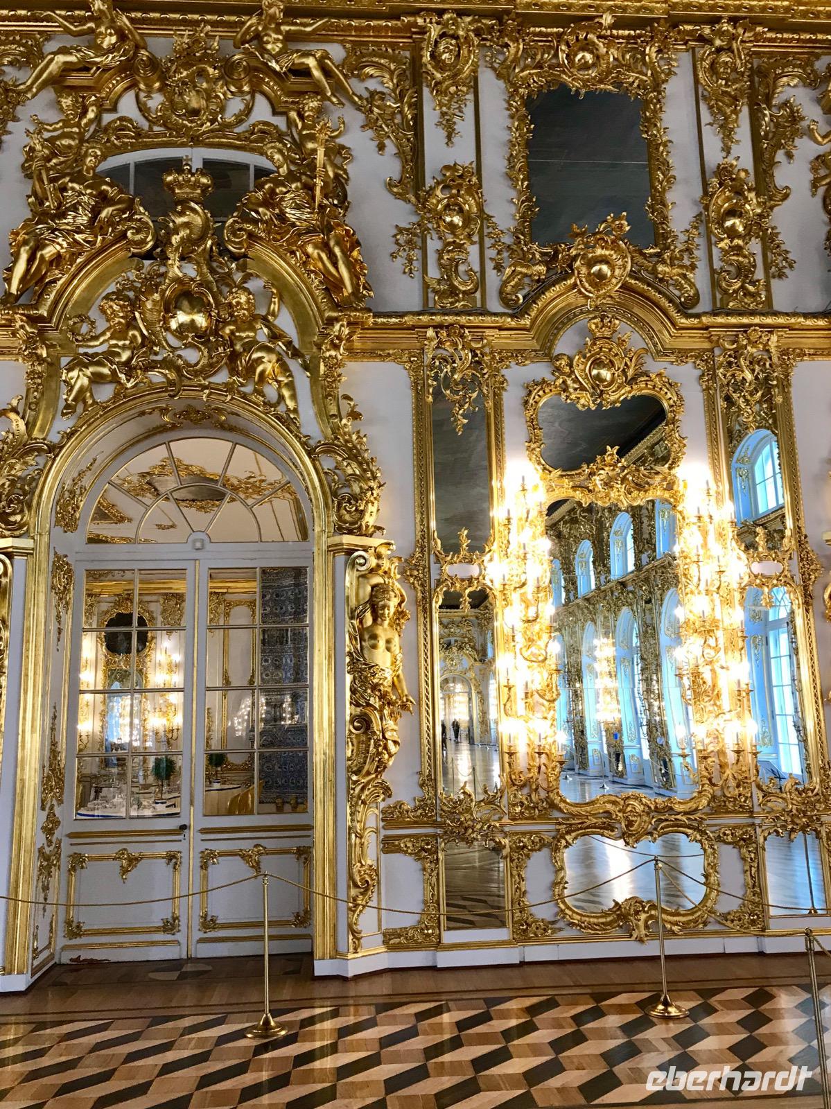 Am Nachmittag dann eine dreiviertel Stunde Busfahrt nach Zarskoje Selo, das Zarendorf, oder auch Puschkin genannt, etwas außerhalb der Stadt. Hier wollen wir das Bernsteinzimmer sehen und natürlich den Katharinenpalast, benannt nach Katharina I., der Ehefrau von Peter I. Es geht die üppig mit Stuck verzierte Paradetreppe hinauf und dann der Blick in die Säle, die sich in einer Zimmerflucht aneinanderreihen. Diese Pracht ist atemberaubend, Fenster öffnen sich nach beiden Seiten des Parks, große Spiegel, die das Licht reflektieren, vergoldete barocke Dekorationen an den Wänden und Säulen. Und dann das Bernsteinkabinett, wieder eine deutsch-russische Geschichte, und sein Verbleib in den Wirren des II. Weltkrieges ist noch immer ein offenes Rätsel. Es ist inzwischen neu erstanden und eine wahre Wunderleistung der Handwerkskunst. Unser Ausflug findet seinen Abschluss in einem kleinen Rundgang durch den Park, der wegen seiner wunderschönen Gartengestaltung ebenfalls sehenswert ist. Voller Eindrücke kehren wir am späten Nachmittag zurück nach St. Petersburg.