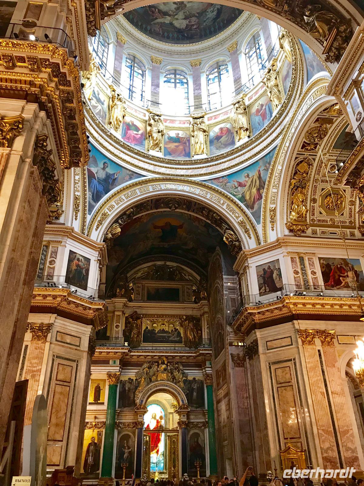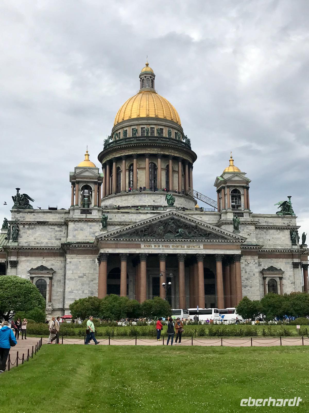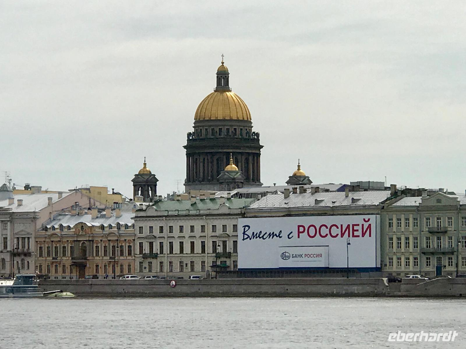 Unsere Besichtigungstour geht weiter und wir verabschieden den Bus am Isaaksplatz. Es ist Mittag. Vera führt uns in ein kleines Szenerestaurant in einem Hinterhof unter freiem Himmel. Es ist so, als wäre man in Dresden-Neustadt oder in Berlin. Junge Leute, alternatives Leben, moderne Musik - da hat die Jugend schon lange aus dem Fenster nach Europa gesehen. Nach dem Mittag gehen wir zur Isaakskathedrale und bewundern die 101m hohe Kathedrale mit ihren Superlativen des Sakralbaus - 12000 Menschen haben hier Platz, 10762 Pfähle wurden in den Sumpfboden gerammt, um den Bau zu errichten, und für das Vergolden der viertgrößten Kuppel der Welt wurden 400kg Gold verbraucht. Es wären noch sehr viele Besonderheiten dieses Kirchenbaues zu nennen, aber lassen wir die Fakten, sehen wir uns einfach in aller Ruhe um. Weiter geht unser Spaziergang zum Newski-Prospekt, dann zur Christi-Auferstehungskirche mit Innenbesichtigung, zum Singer-Haus und zum Jelissejew-Feinkostladen. Da waren wir gestern schon, aber es ist immer wieder schön, die Sehenswürdigkeiten unter einem anderen Blickwinkel zu betrachten. Wir sind pflastermüde. So trennt sich unsere Gruppe. Einige erkunden selbst die Stadt, andere besuchen ein Café in einem Hinterhof und fahren mit dem Bus zum Hotel. Schließlich müssen wir fit für abends sein, denn 5 Minuten vor Mitternacht holt uns der Bus ab.