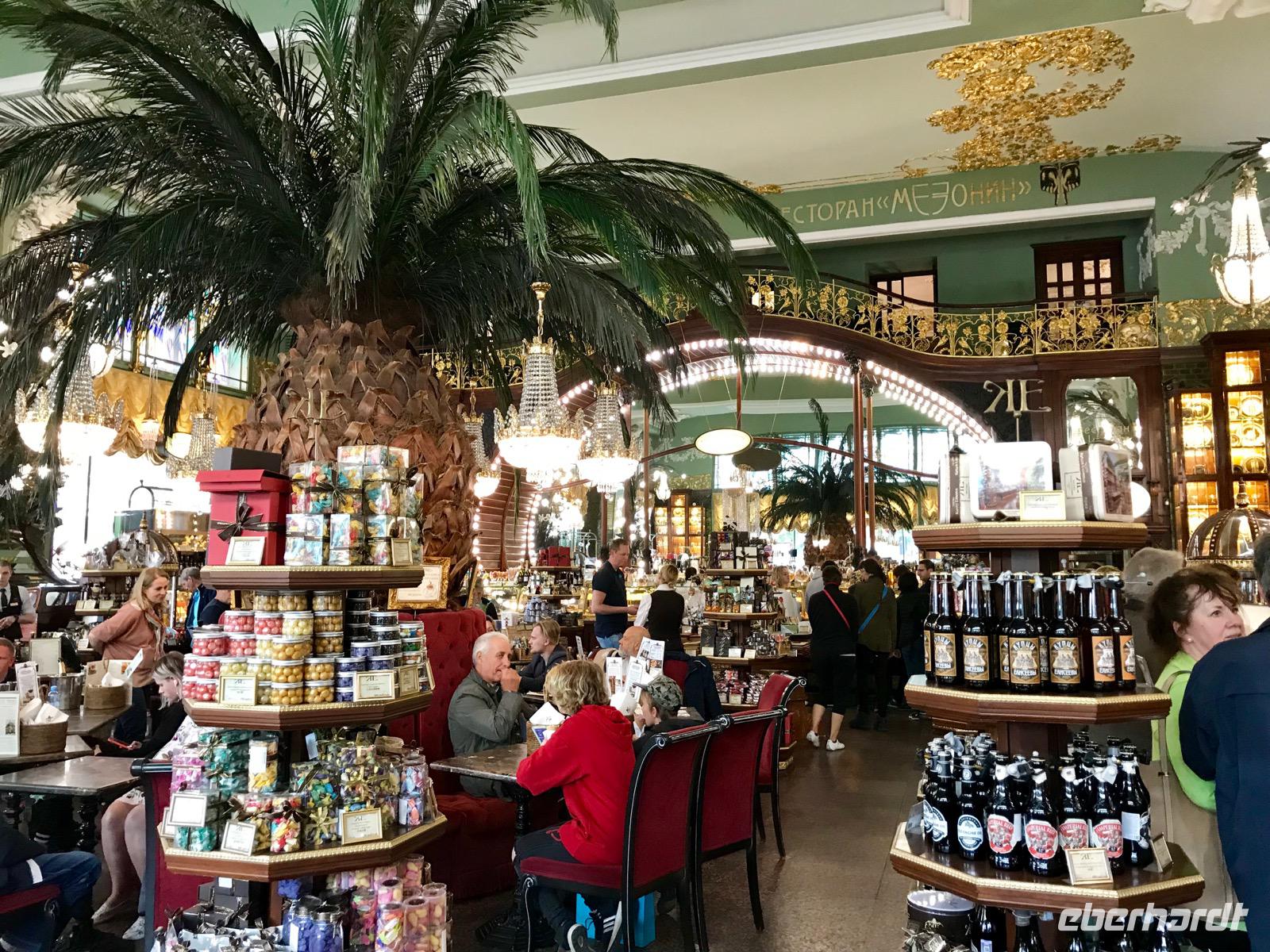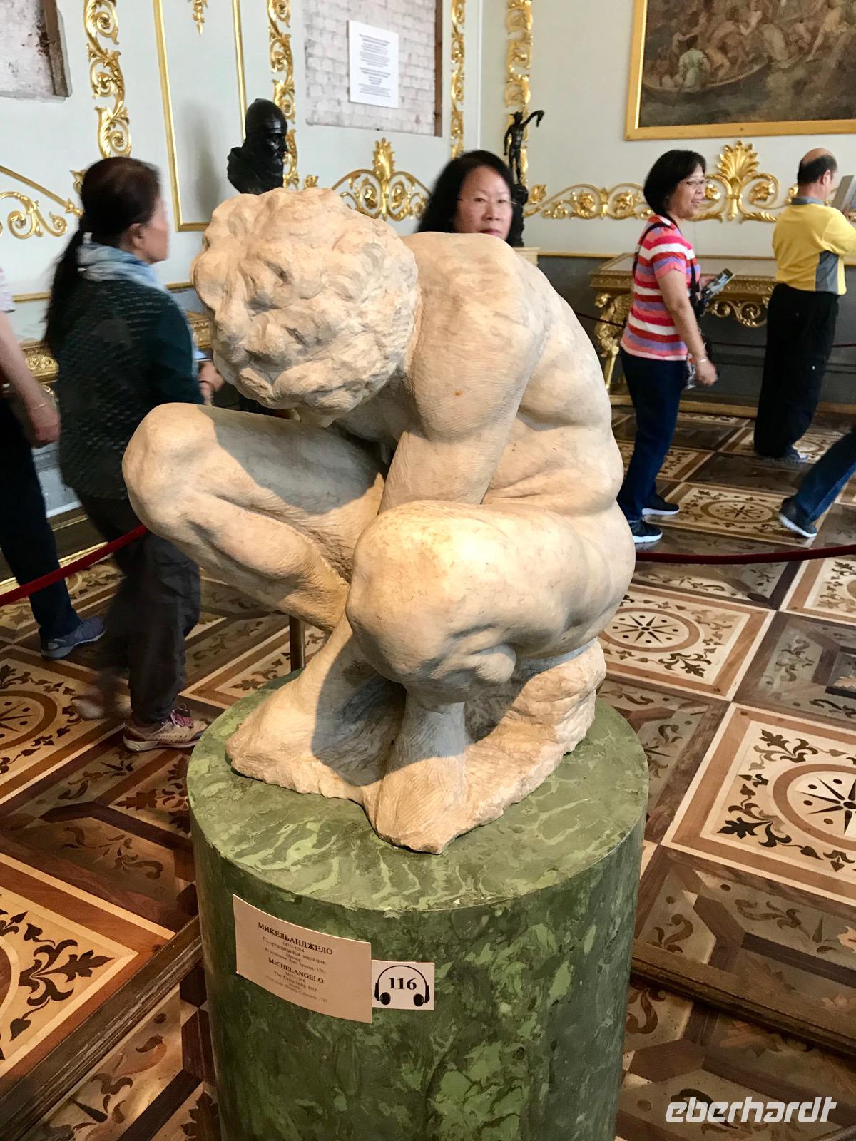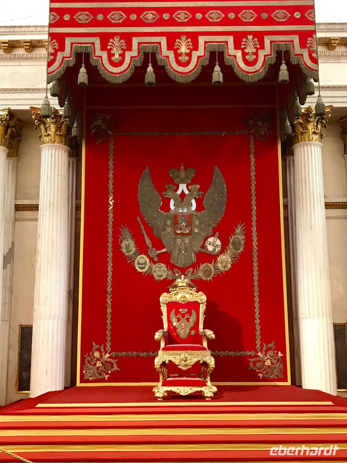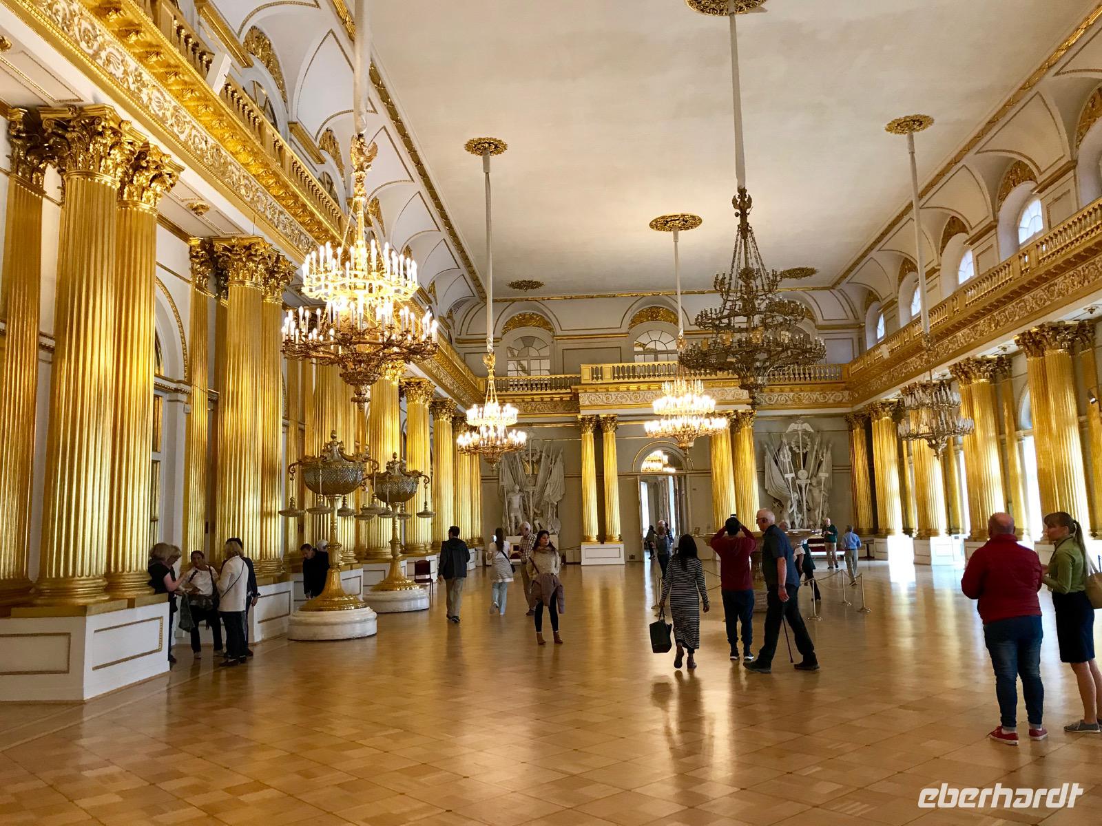 Nach kurzer Nacht heute in die Eremitage zur Besichtigung. Wir stehen zunächst eine ganze Weile am Vormittag in der Reihe der Besuchergruppen und haben eine kleine Vorstellung, welcher Andrang an Touristen innen vorherrschen wird. Aber dann geht es hinein, die pompöse Jordan-Treppe hinauf und der Mund bleibt offen, ob der prunkvollen Ausführungen mit Spiegel, Marmor und Dekorationen. Bevor wir jedoch die Kunstschätze von Weltrang zu Gesicht bekommen, flanieren wir durch den Winterpalast, die Hauptresidenz der Zaren und genießen die historische Aura, die Säle und Gemächer und die prächtigen Exponate. Wir bestaunen den festlichen Wappensaal, die imposante Militärgalerie von 1812, den Zarenthron im Georgssaal und die frisch restaurierte Palastkirche. Wir betrachten in der kleinen Eremitage die kunstvolle Uhr mit dem mechanischen Pfau, die hängenden Gärten von Katherina II., und gehen an den 225 Gemälden entlang, die Katharina II. für ihre private Galerie erwarb - für sich und die Mäuse. So entstand die Keimzelle der heutigen Eremitage, bestehend aus fünf Gebäuden. Anschließend führt uns Vera noch in der Alten Eremitage zu Bildern von besonderem Interesse in den entsprechenden Abteilungen, die kunsthistorisch geordnet sind. Wir sind nach mehr als zwei Stunden voll von Wissen und Eindrücken. Eine Pause im Café der Eremitage bringt wenigstens ein bisschen Erholung.