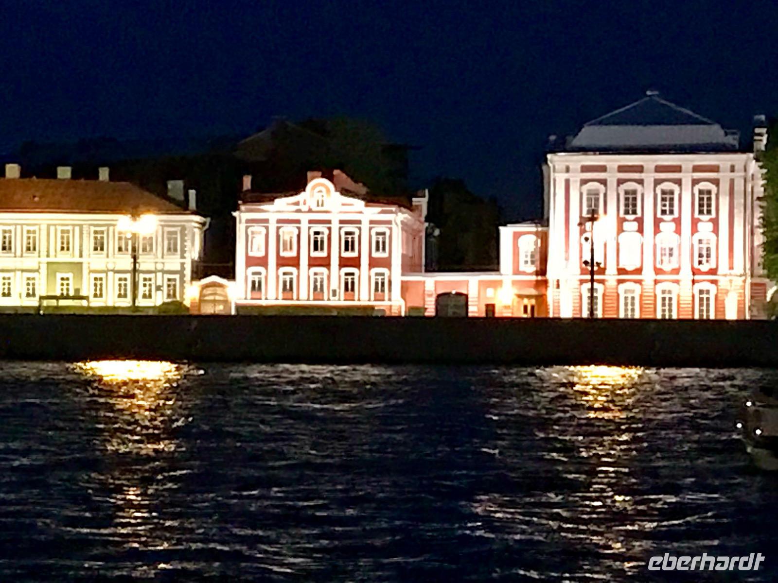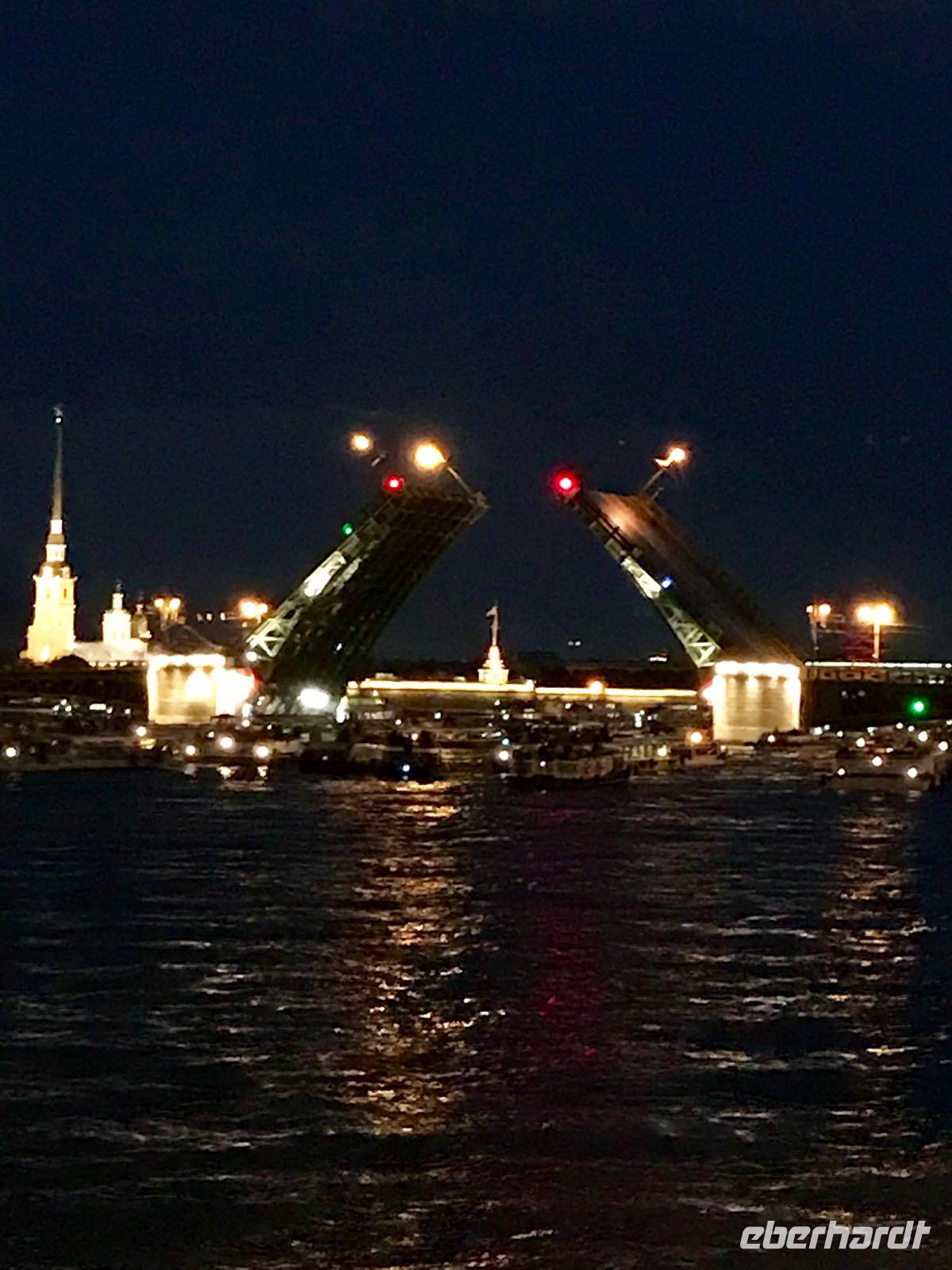 Heute ist die Nachttour auf dem Programm und wir wollen das Öffnen der Brücken erleben. Am schönsten ist es an der Schlossbrücke. Langsam gehen die Brückenflügel hoch und die kleinen Ausflugsdampfer, die schon lange in einer Reihe warten, fahren schnell hindurch. Später dann kommen die Handelsschiffe aus der Ostsee und folgen dem Lauf der Newa bis zum Ladoga-See. Es ist ein ergreifendes Erlebnis und irgendwie auch feierlich, Musik spielt und kleine Lichter beleuchten die Brücken, den Kai und die Schiffe. Eigentlich wollten wir so gern die Weißen Nächte erleben, aber der Wettergott war dann doch mit uns nicht so gnädig, Wolken verhangen der Himmel, ein Gewitter im Anzug, eisiger Wind von der Ostsee. Wir sind trotzdem zufrieden, dieses Erlebnis gehabt zu haben. Erst weit nach Mitternacht sind wir wieder im Hotel und die Nacht wird heute kurz.