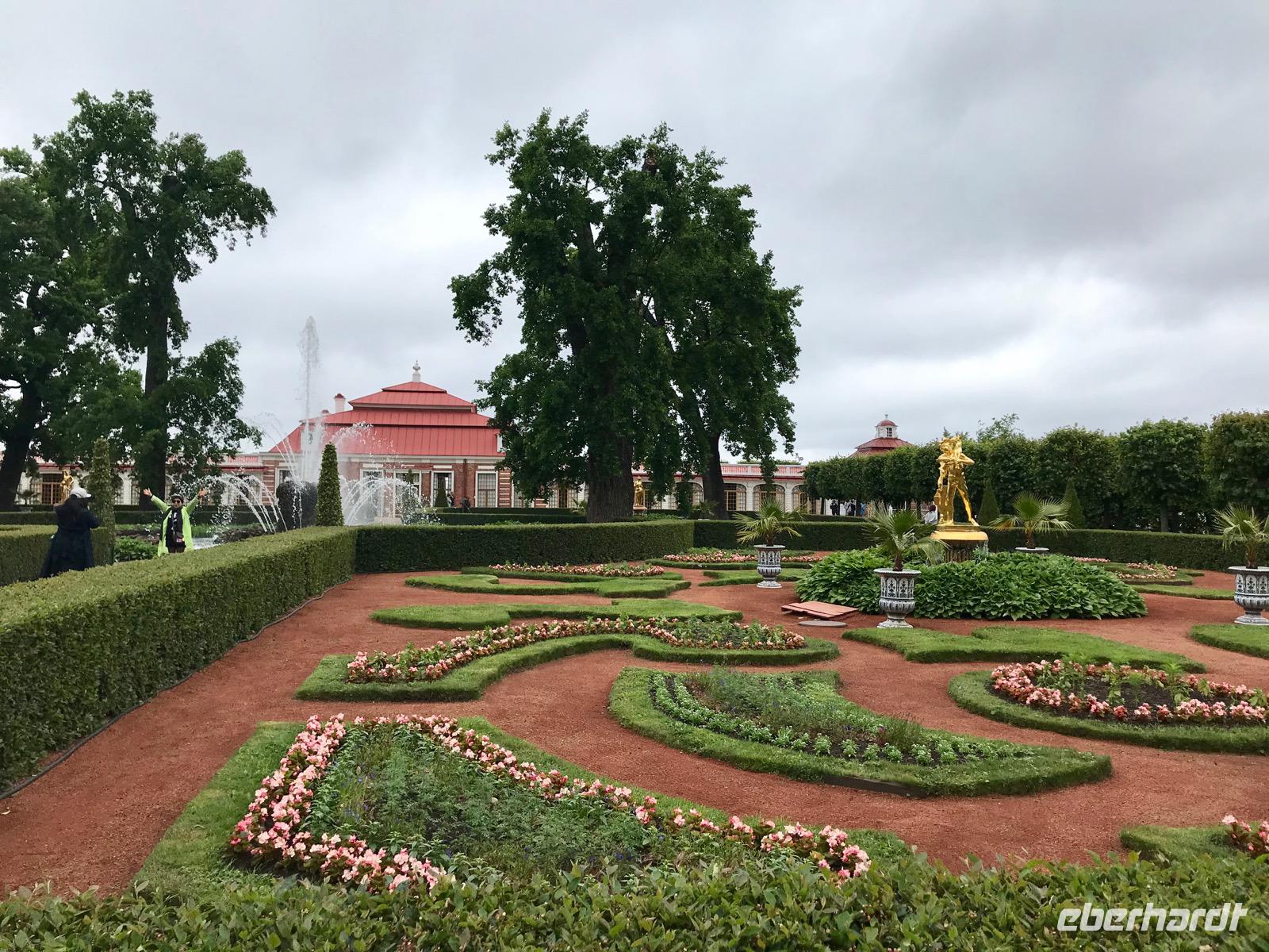 Heute erwartet uns wiederum ein sehr umfangreiches Besichtigungsprogramm. Am Vormittag fahren wir zunächst mit dem Tragflächenboot „Raketa" zum Peterhof, dem russischen Versailles. Peter I. ließ das Schloss mit seinem riesigen Park als Lustschloss und Sommerresidenz errichten. Nach einer 30-minütigen Fahrt durch den Nebel erreichen wir die Anlegestelle und besuchen zunächst im Unteren Park einen kleinen Palast am Ufer des Finnischen Meerbusens - das Schlösschen Monplaisir. Es ist das erste Gebäude, das Peter I. hier errichten ließ. Wir können die Räumlichkeiten betrachten und sehen, wo der Zar schlief, zu Mittag aß und die Toilette benutzte. Danach spazieren wir durch den Park und treffen alsbald auf die größte und schönste Sehenswürdigkeit - die Große Kaskade mit 138 Wasserstrahlern, eine Komposition aus Wasser, Marmor, Gold und Tuffstein. Sie reicht über einen Stichkanal vom Schlossvorplatz bis hinab zur Ostsee. Zentrales Element ist die Samson-Fontäne, wo Samson den Löwen niederringt. Einen wunderschönen Anblick hat man, wenn man gerade vor dem Schloss steht und auf die Ostsee blickt. Doch wir können nicht verweilen und flanieren durch den Oberen Park hinaus aus diesem Areal, das man einen ganzen Tag lang entdecken könnte. Uns erwartet ein russisches Mittagessen im Restaurant Alex Haus, ein kleines traditionelles Restaurant, lieblich und schön, das Essen auch.